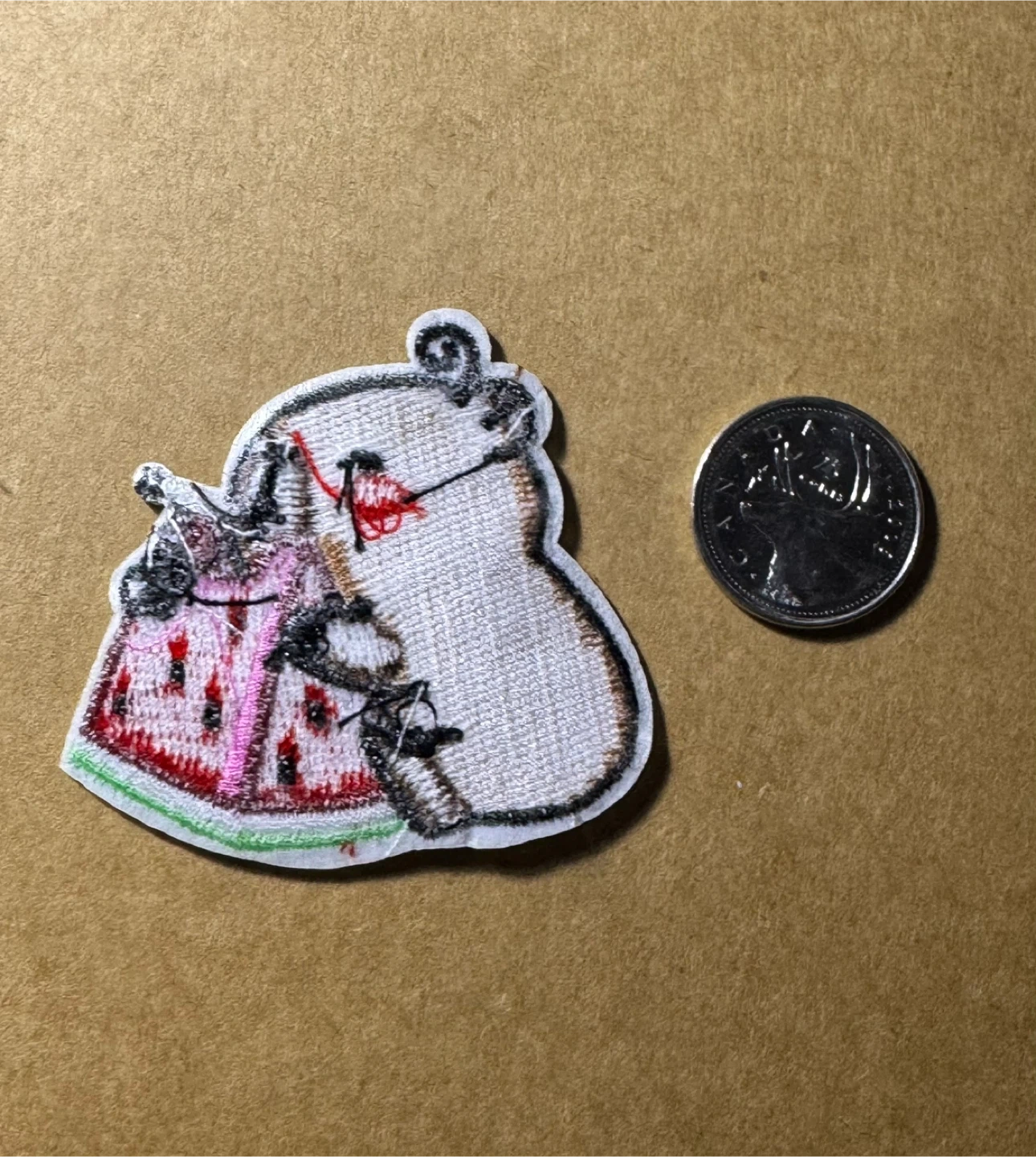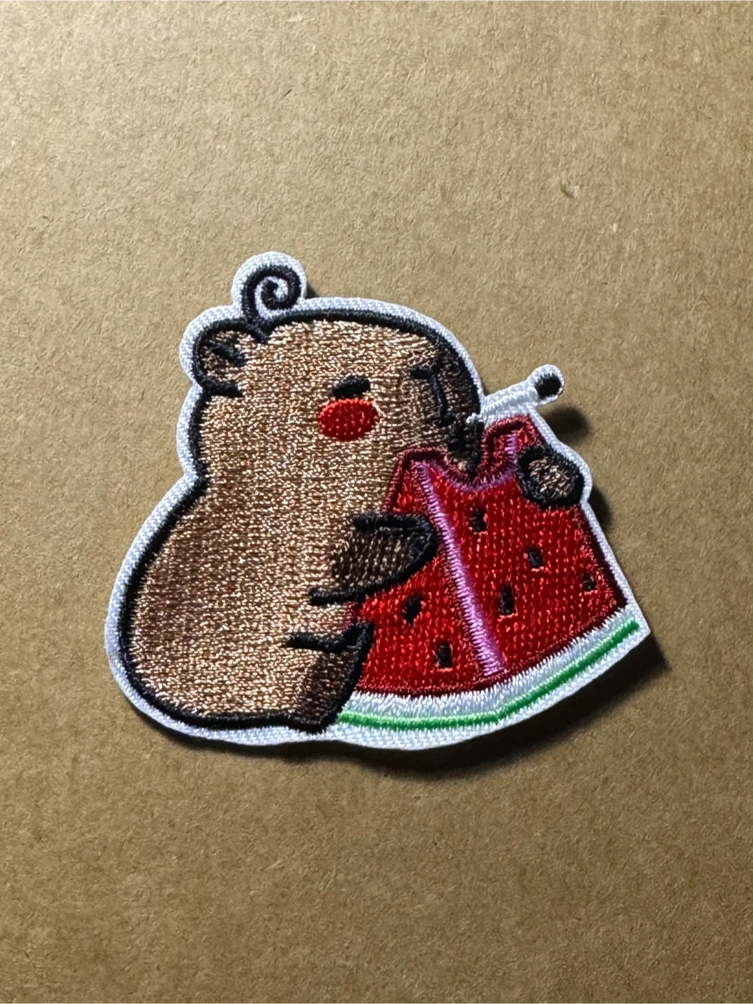 Adorable embroidered patch featuring a capybara enjoying a slice of watermelon. It's perfect for customizing jackets, backpacks, or hats. Made with durable embroidered thread.