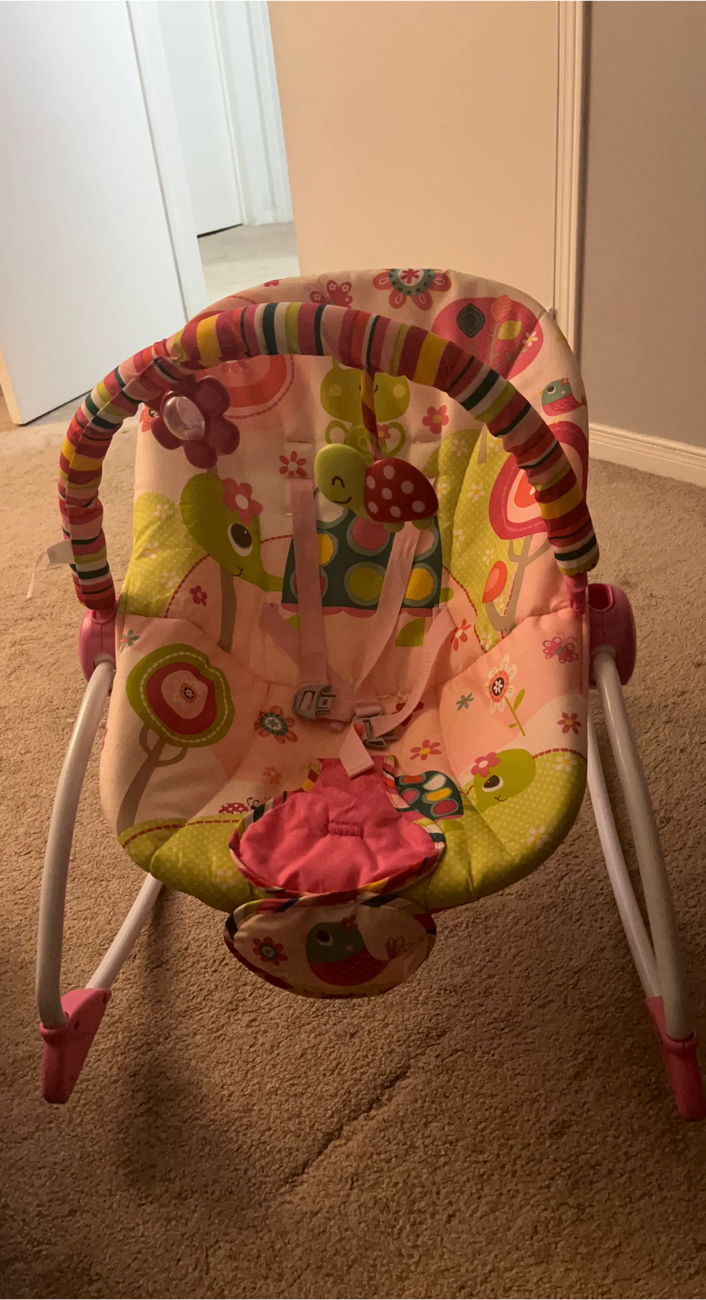 This baby bouncer chair features a colourful, nature-themed print. It includes a removable play bar with hanging toys for your little one's entertainment. The seat has a secure harness for safety.