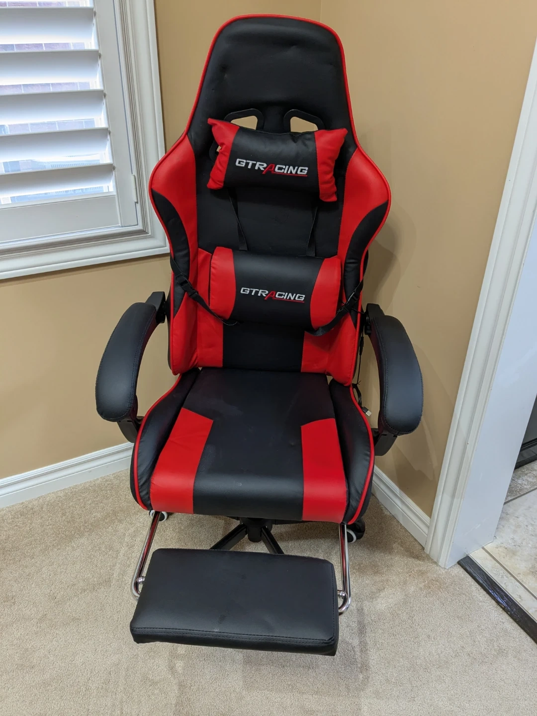 60Selling a GTRACING gaming chair in red and black. It's in great condition and super comfy for long gaming sessions or working from home! It also comes with a footrest and lumbar support.