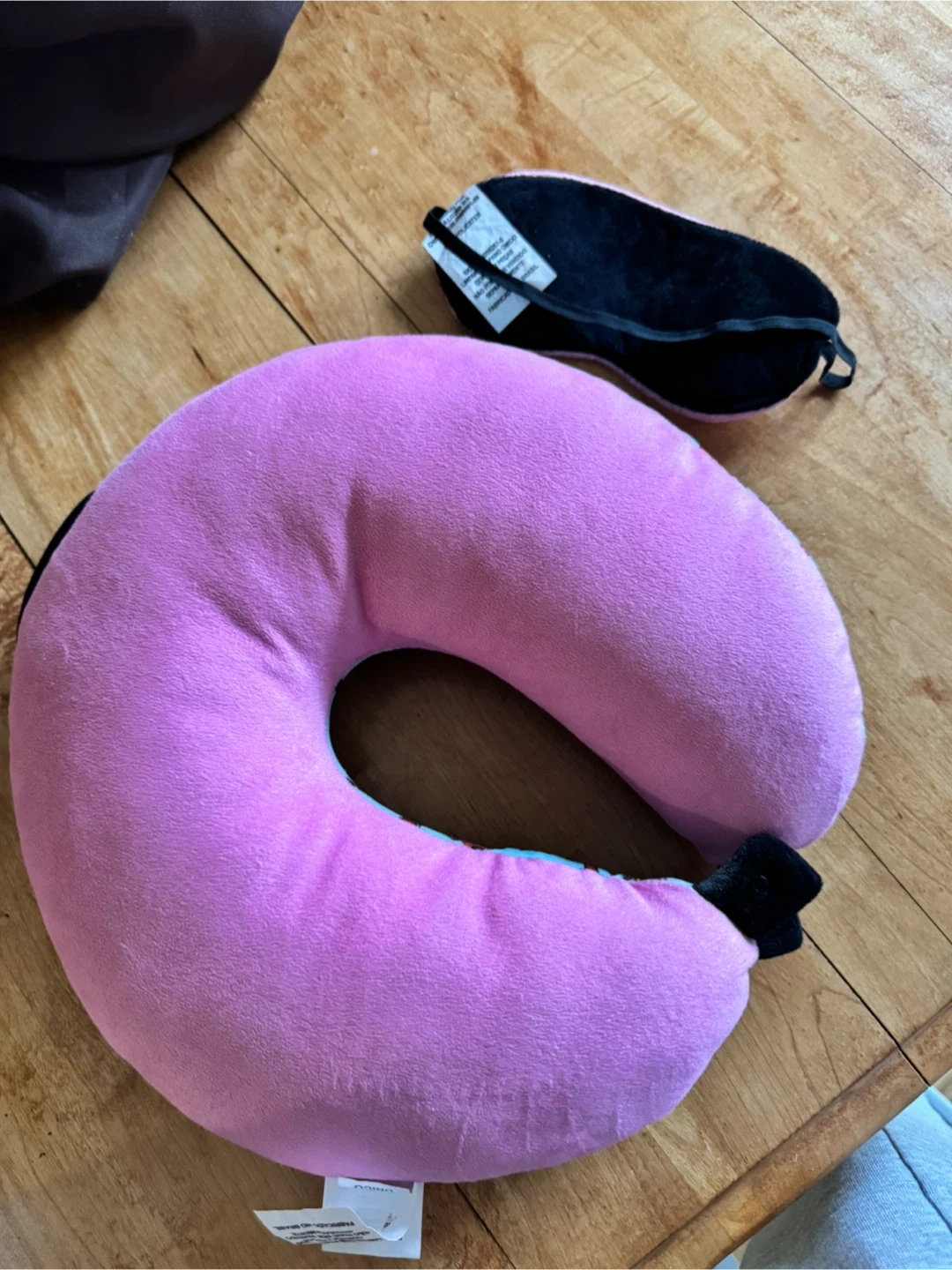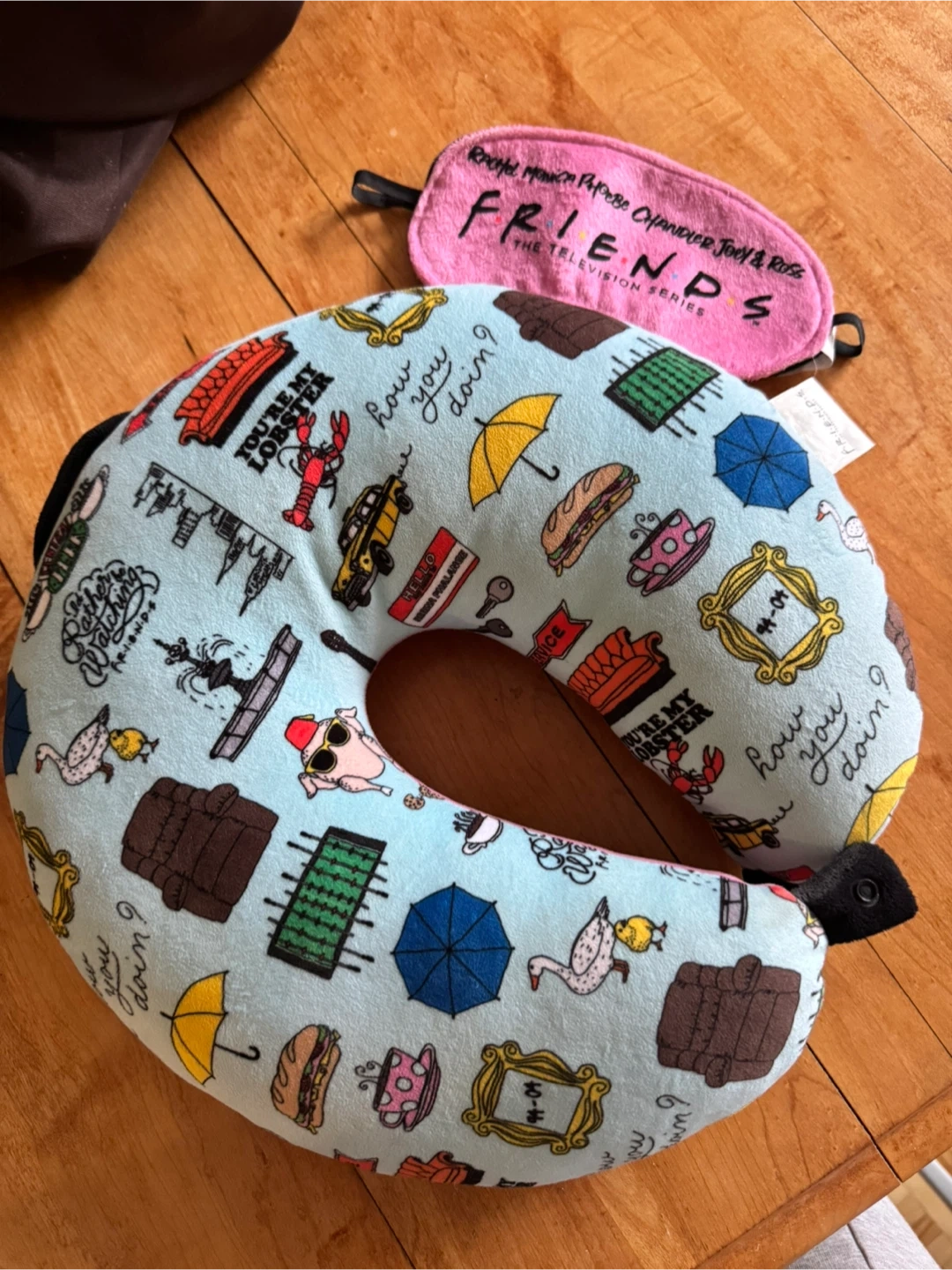 Selling a super cute Friends-themed travel neck pillow and matching eye mask! Perfect for long trips or just lounging around, this set will keep you comfy and stylish. The pillow is soft and supportive, and the eye mask is great for blocking out light. Both are in great condition!