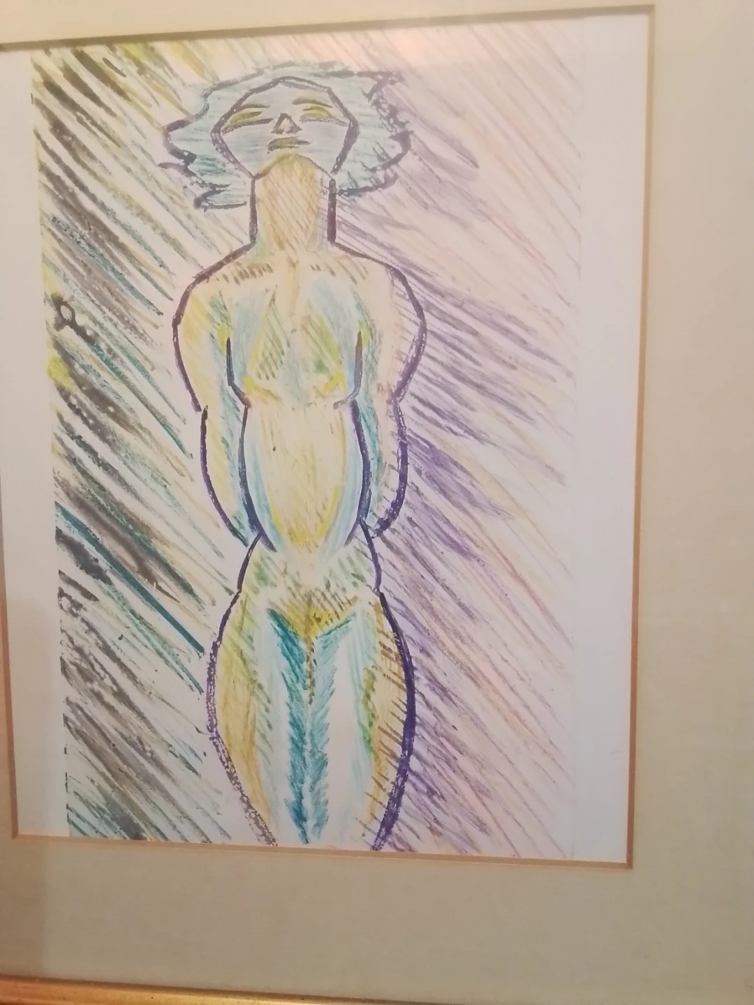 This is a framed nude sketch, measuring 13.75" x 15.75". The artwork features a nude figure drawn in a unique style with vibrant colors, set against a textured background. The frame is a simple gold tone.