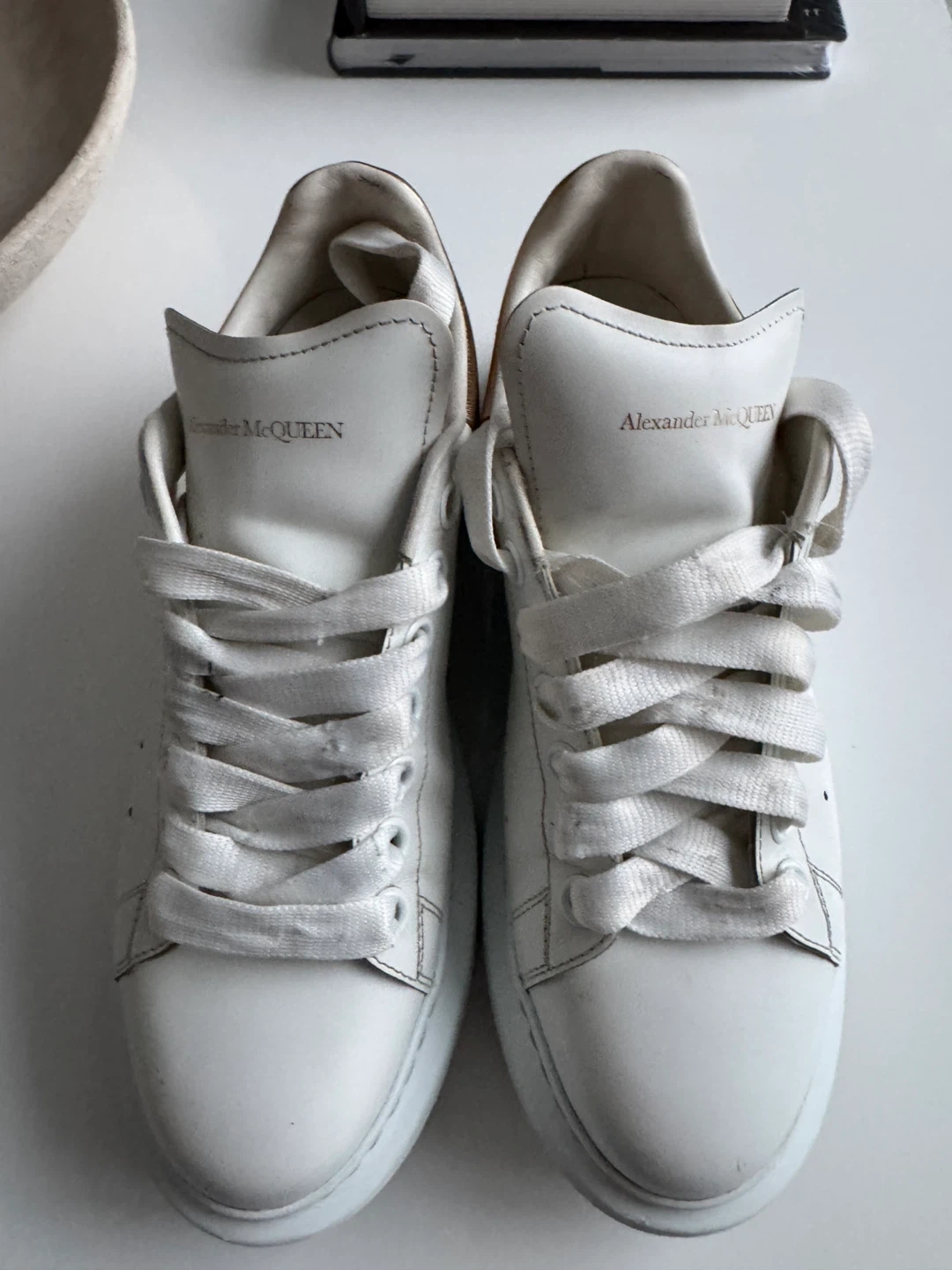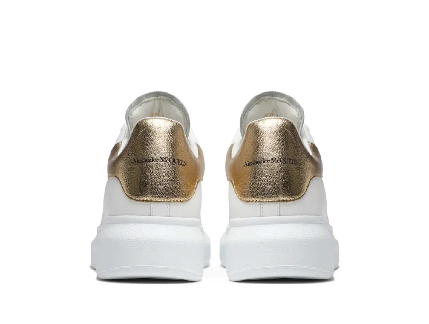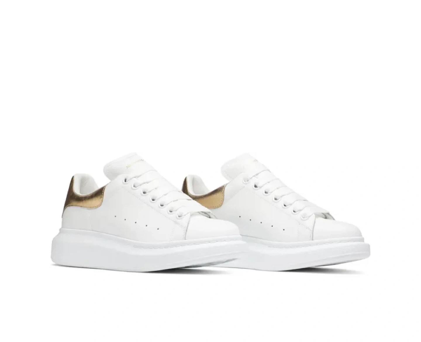 Alexander McQueen Oversized Sneakers. White leather with gold heel accents. Classic platform sole design.