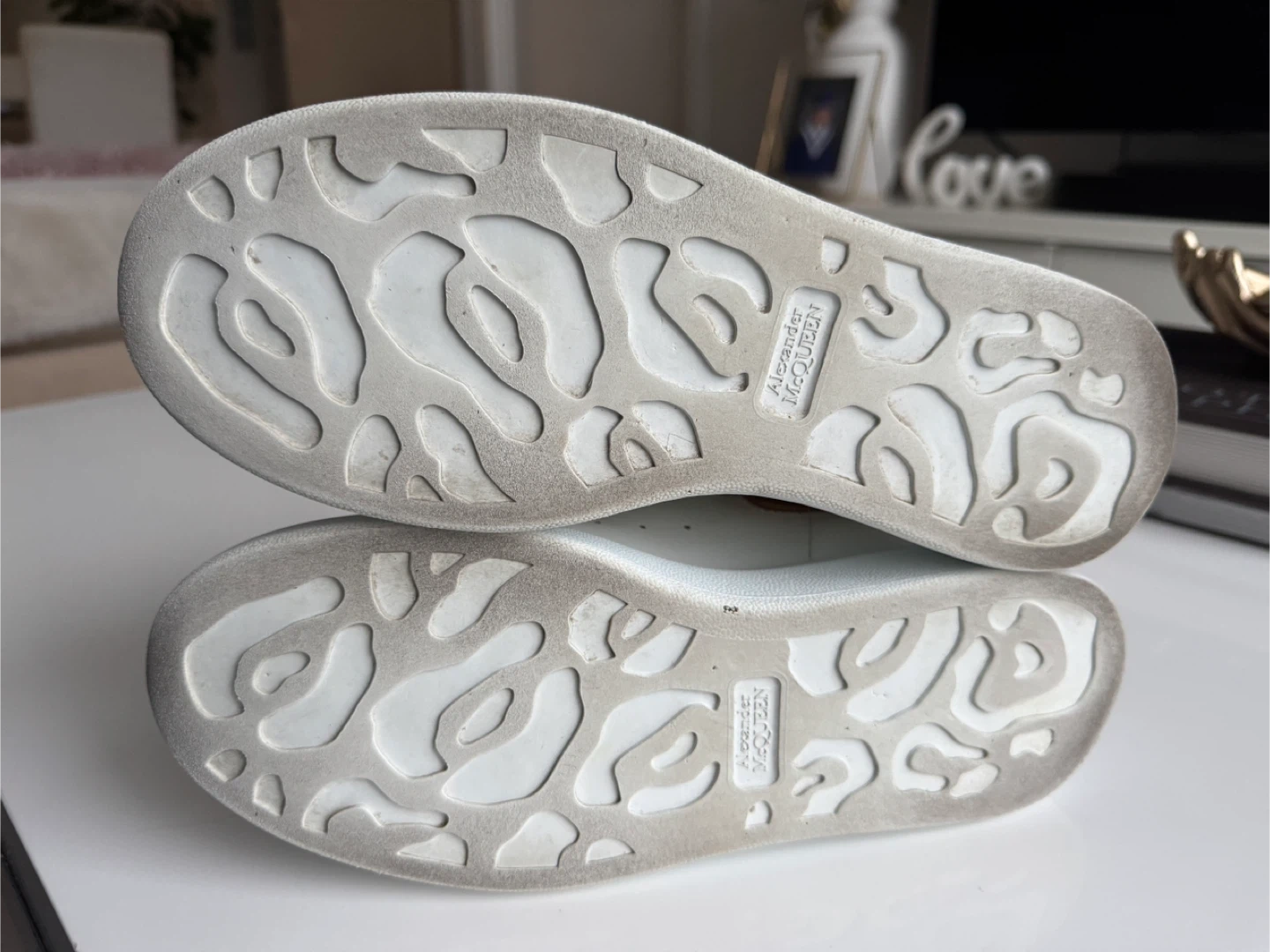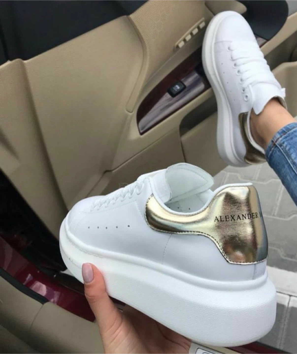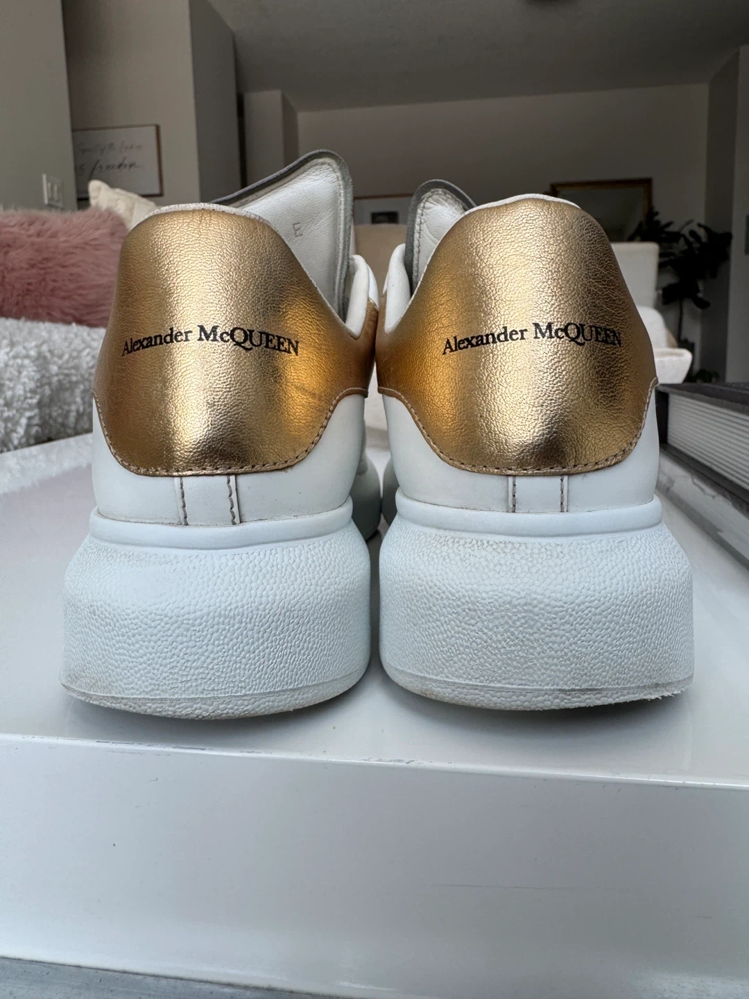 Alexander McQueen Oversized Sneakers. White leather with gold heel accents. Classic platform sole design.