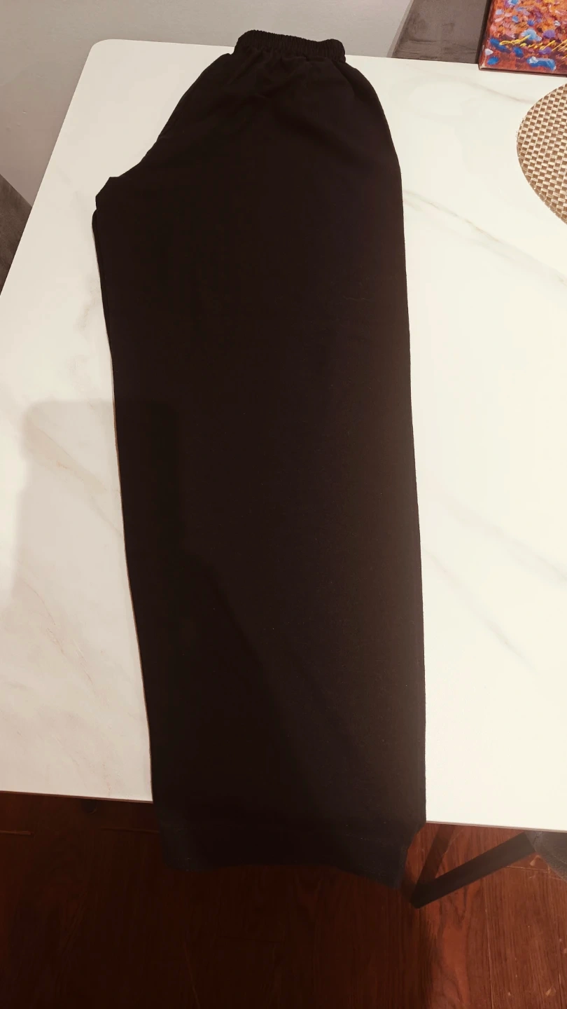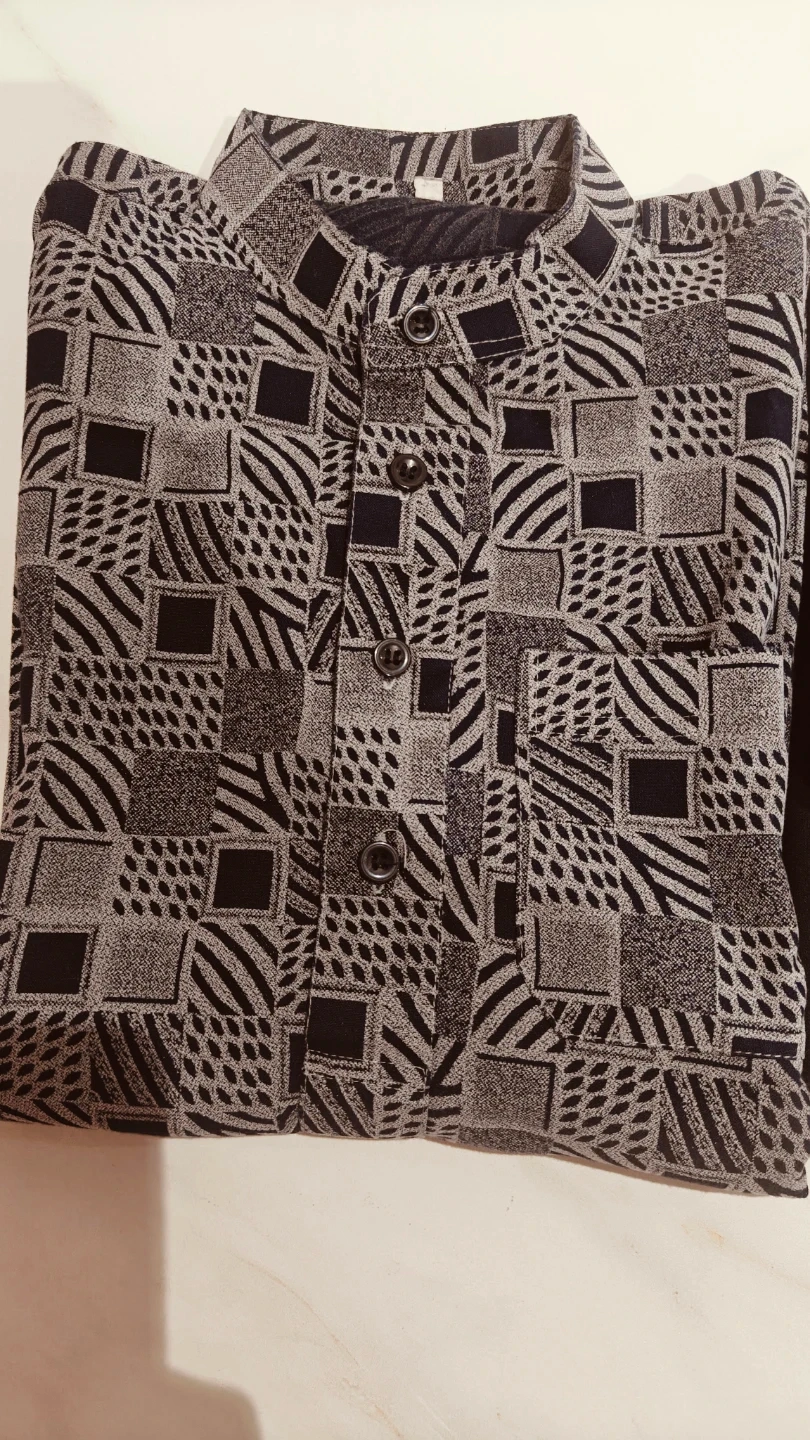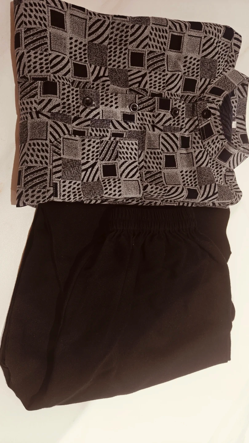 A stylish set featuring a long-sleeved kurta with a unique geometric print and a mandarin collar. It's paired with black elastic-waist pants. This outfit is great for casual outings or Eid