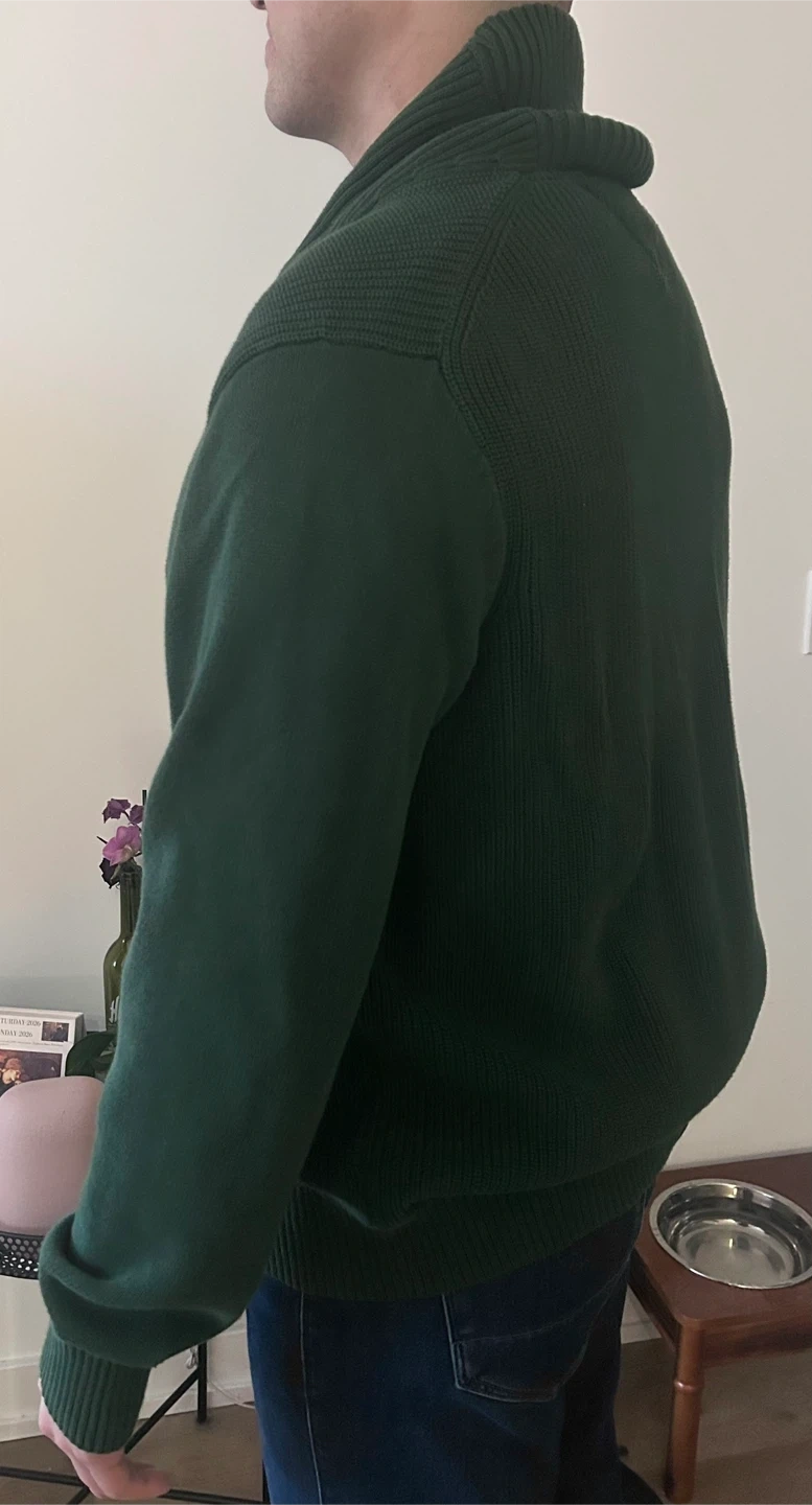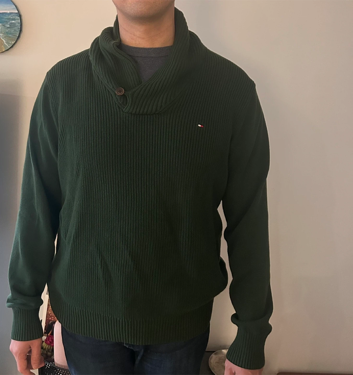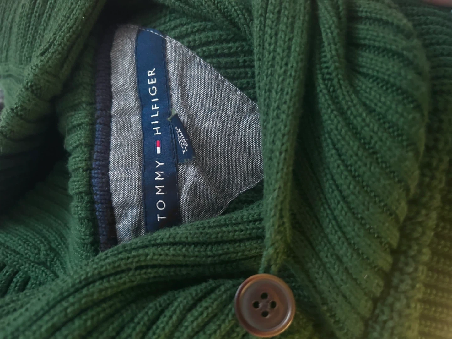 Tommy Hilfiger men's knit sweater in a dark green colour. It features a shawl collar with a button closure. Made from a cotton blend.