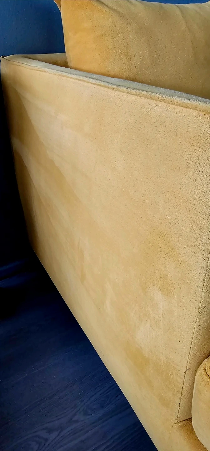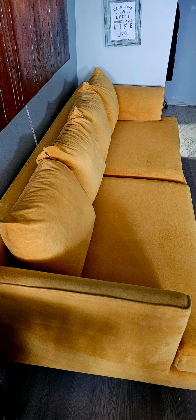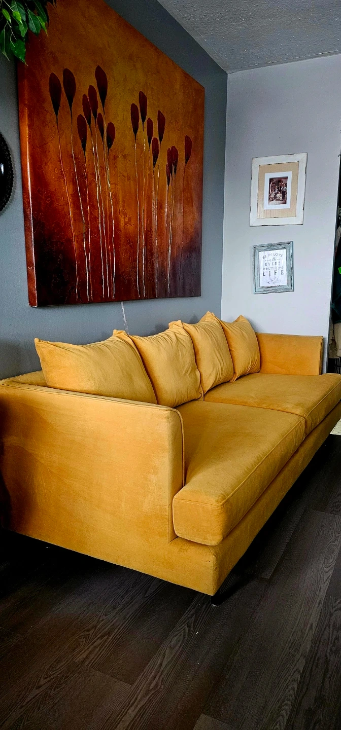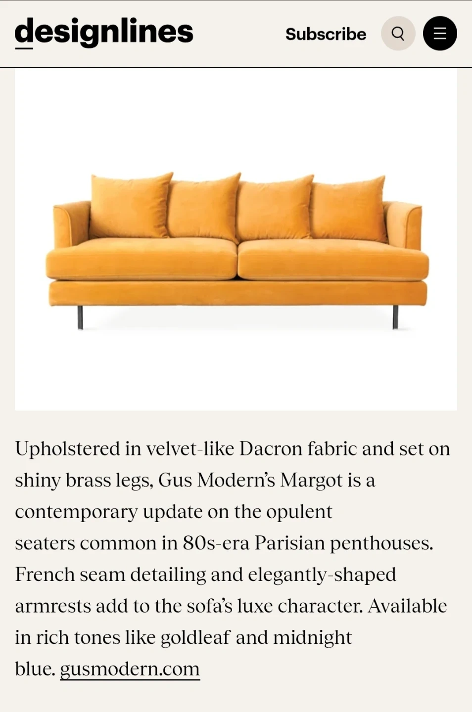 Gus Modern Margot sofa upholstered in gold Leaf velvet-like Dacron fabric. Features French seam detailing and elegantly-shaped armrests. Set on shiny brass legs. Gus Modern Margot Sofa a contemporary piece a rare find in gold Leaf velvet color.