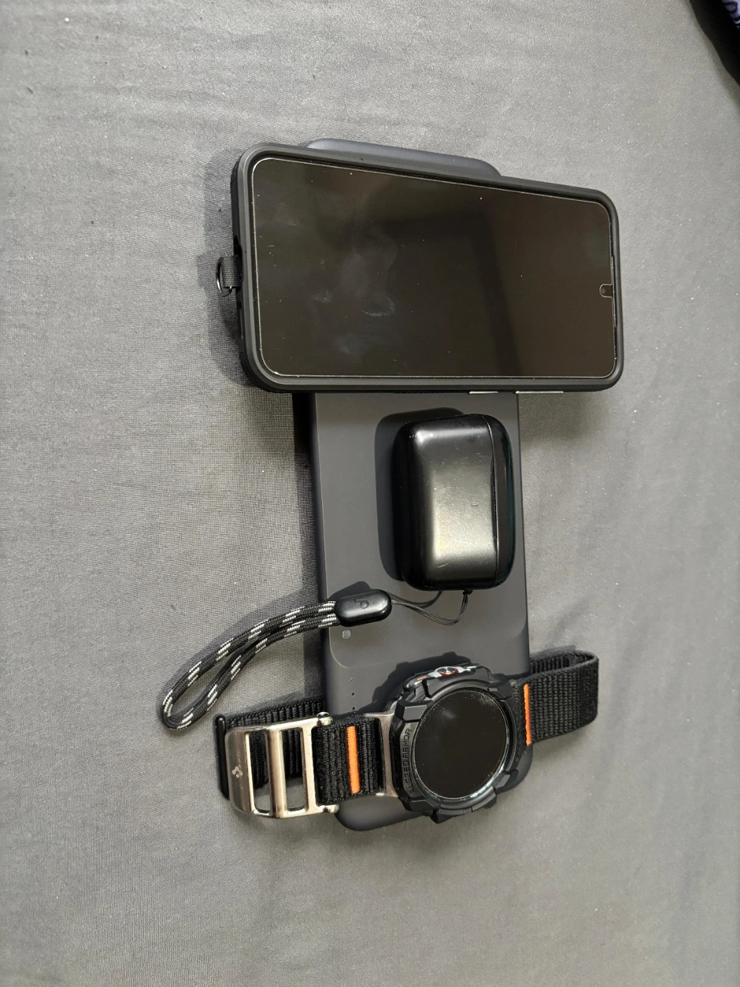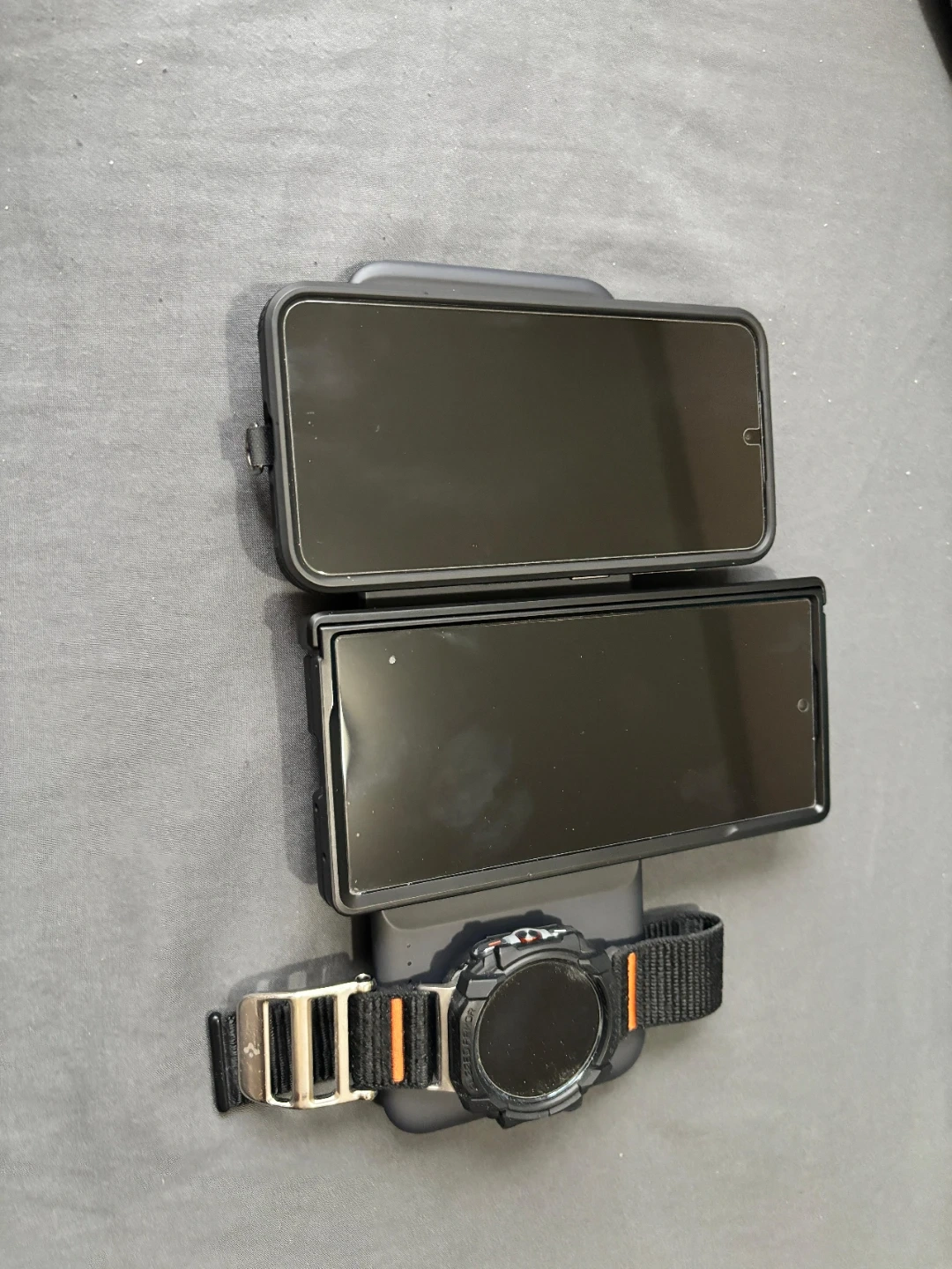 Samsung Wireless Charger Trio with 25w adapter and a cable. It can charge upto two phones and a watch simultaneously. Also one phone, one wirless earbuds and watch.