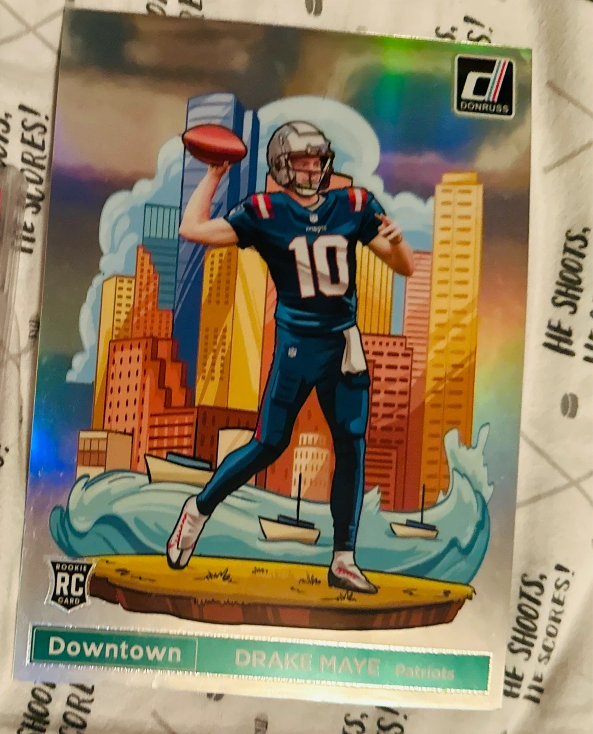 This is a 2024 Donruss Downtown Drake Maye Rookie jumbo Card. It's a highly sought-after collectible for football fans. Features player Drake Maye of the Patriots.