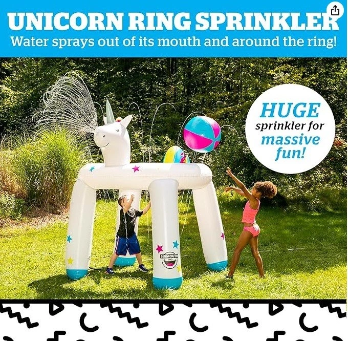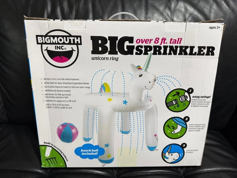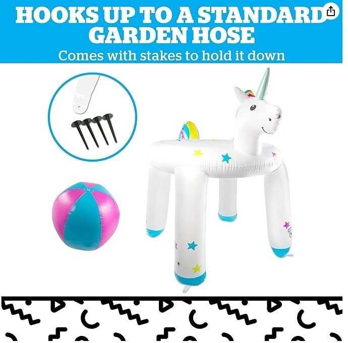 Keeps kids cool and entertained. Attaches to any standard garden hose. Includes beach ball to throw into rings. Deflates and stores easily. Anchors to the ground (includes anchor kit). Dimensions after inflate: L x W x H (105 x 79.9 x 97 inches).