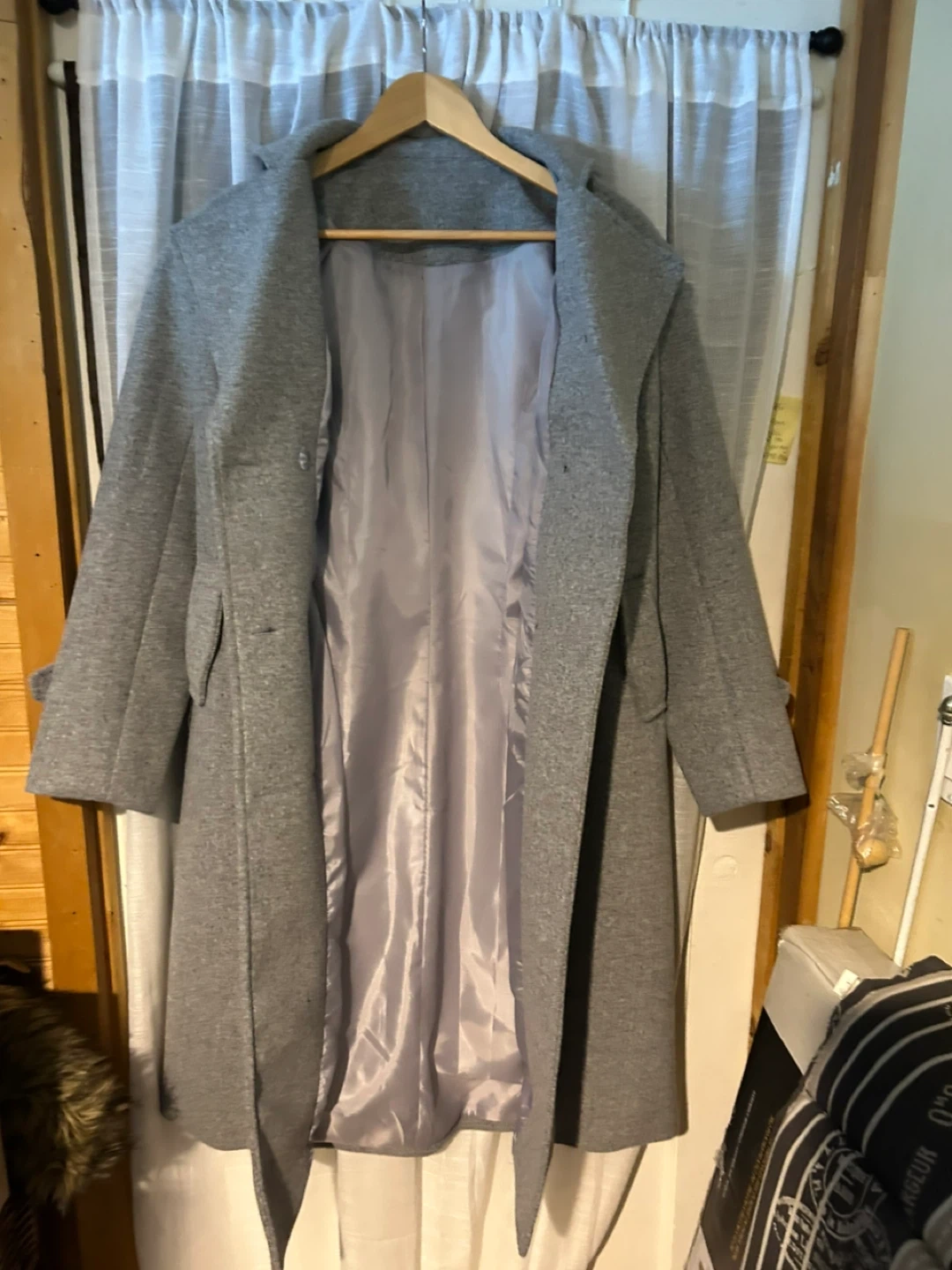 A stylish women's grey coat with a double-breasted button closure. It features a notched lapel and side pockets. The lining appears to be a smooth satin material. This coat is suitable for cooler weather.