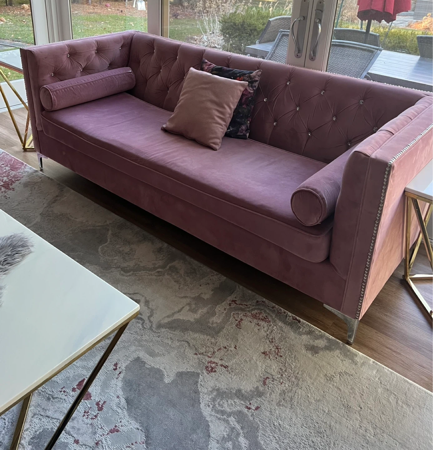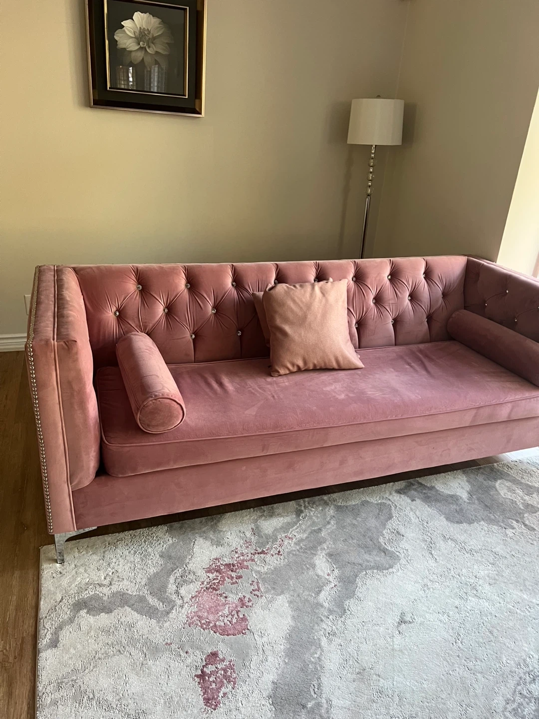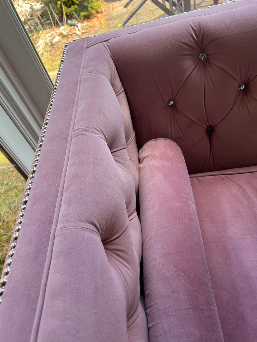This beautiful pink velvet sofa features deep tufting and stylish rolled arms. It comes with two accent pillows for added comfort and flair. The silver nailhead trim and crystal-like buttons add a touch of elegance to any living space.