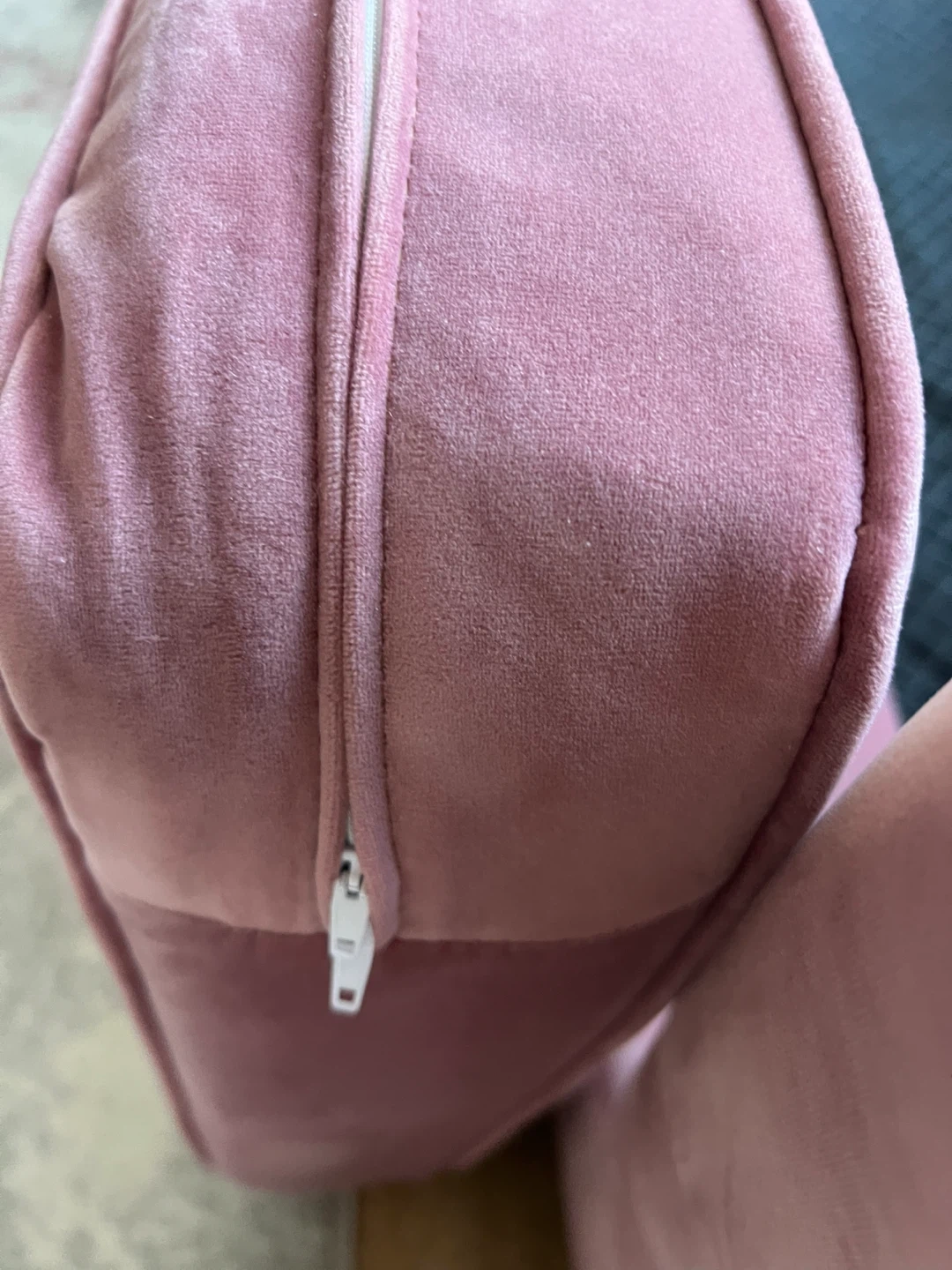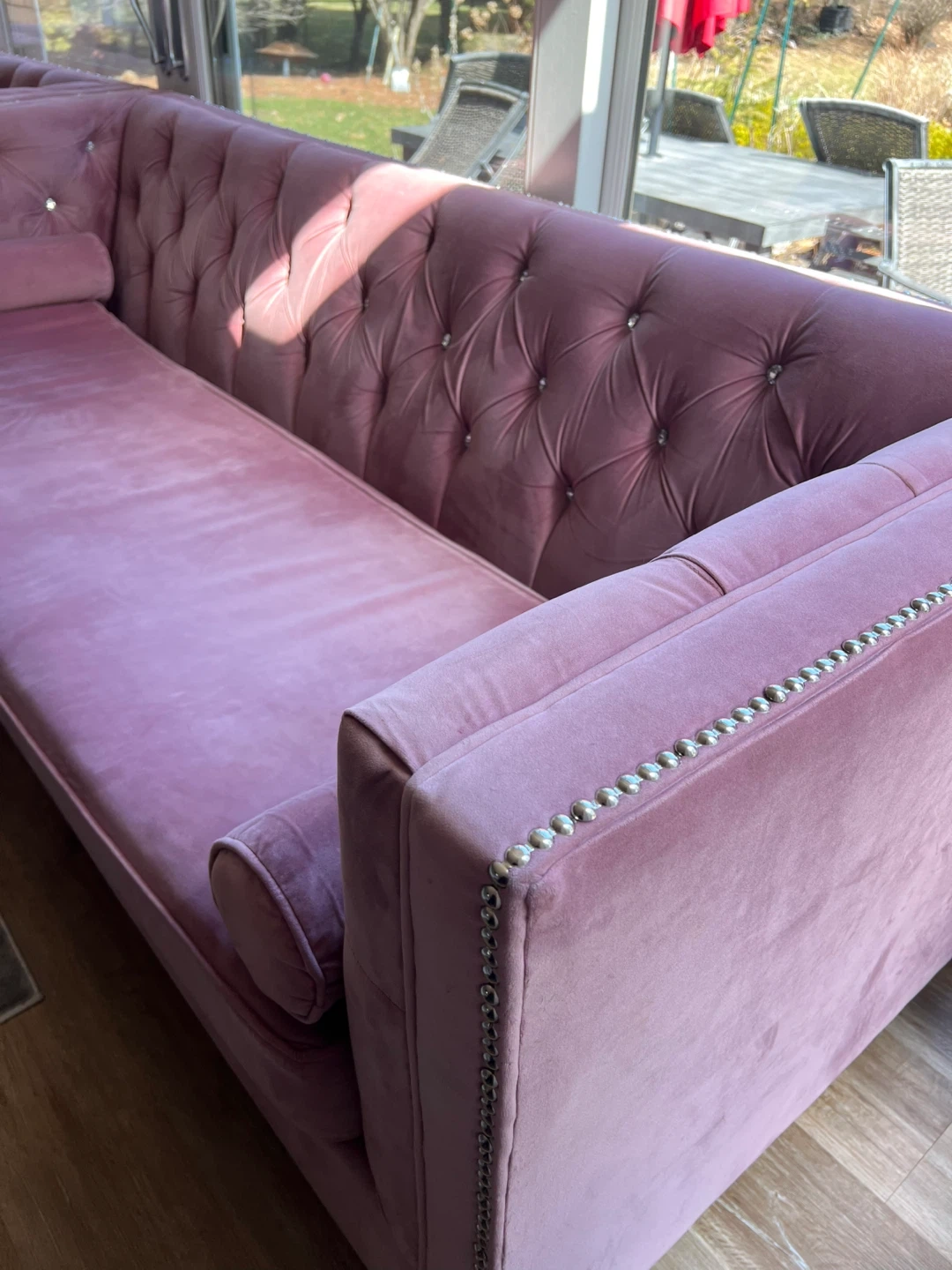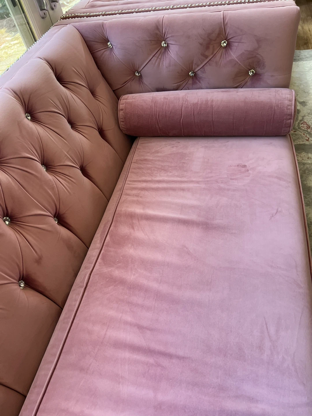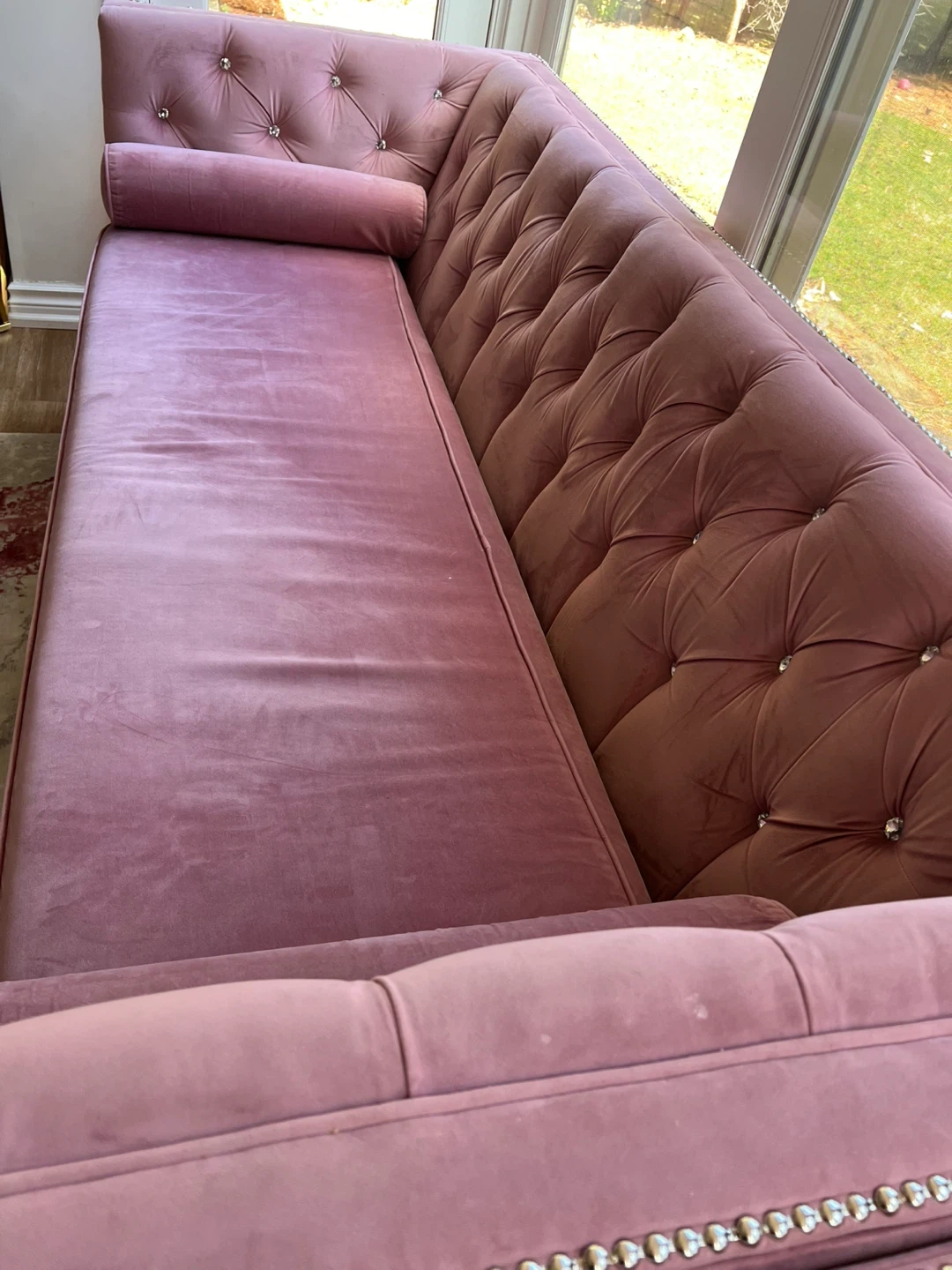 This beautiful pink velvet sofa features deep tufting and stylish rolled arms. It comes with two accent pillows for added comfort and flair. The silver nailhead trim and crystal-like buttons add a touch of elegance to any living space.