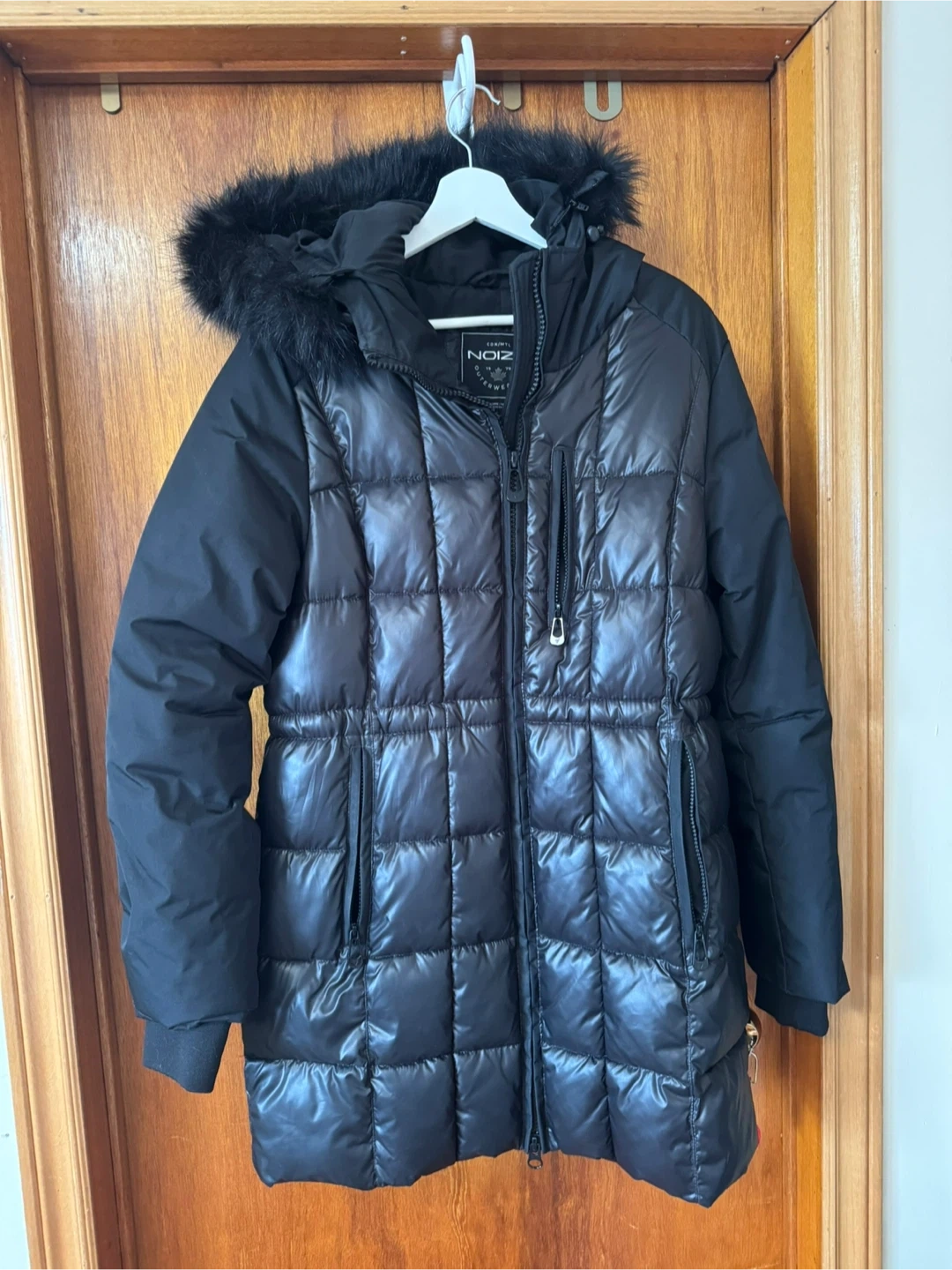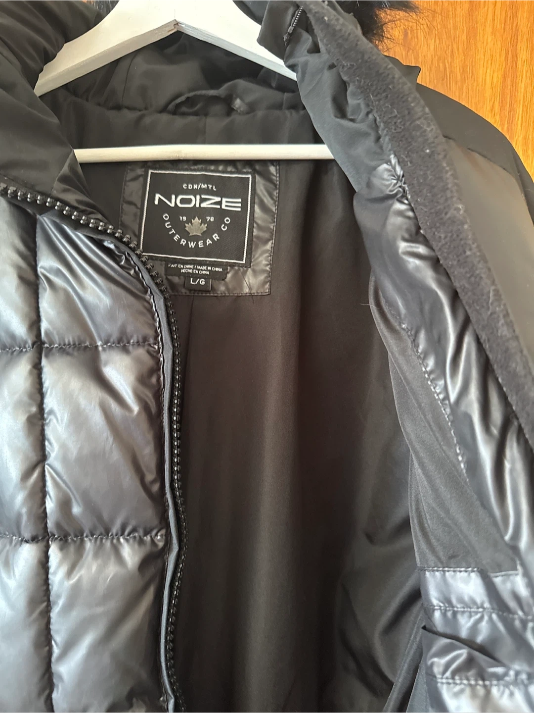 This NOIZE puffer coat is black and features a faux fur-trimmed hood. It's a size L with a full zip closure and zippered pockets. The sleeves are made of a different material than the body, offering a stylish contrast.