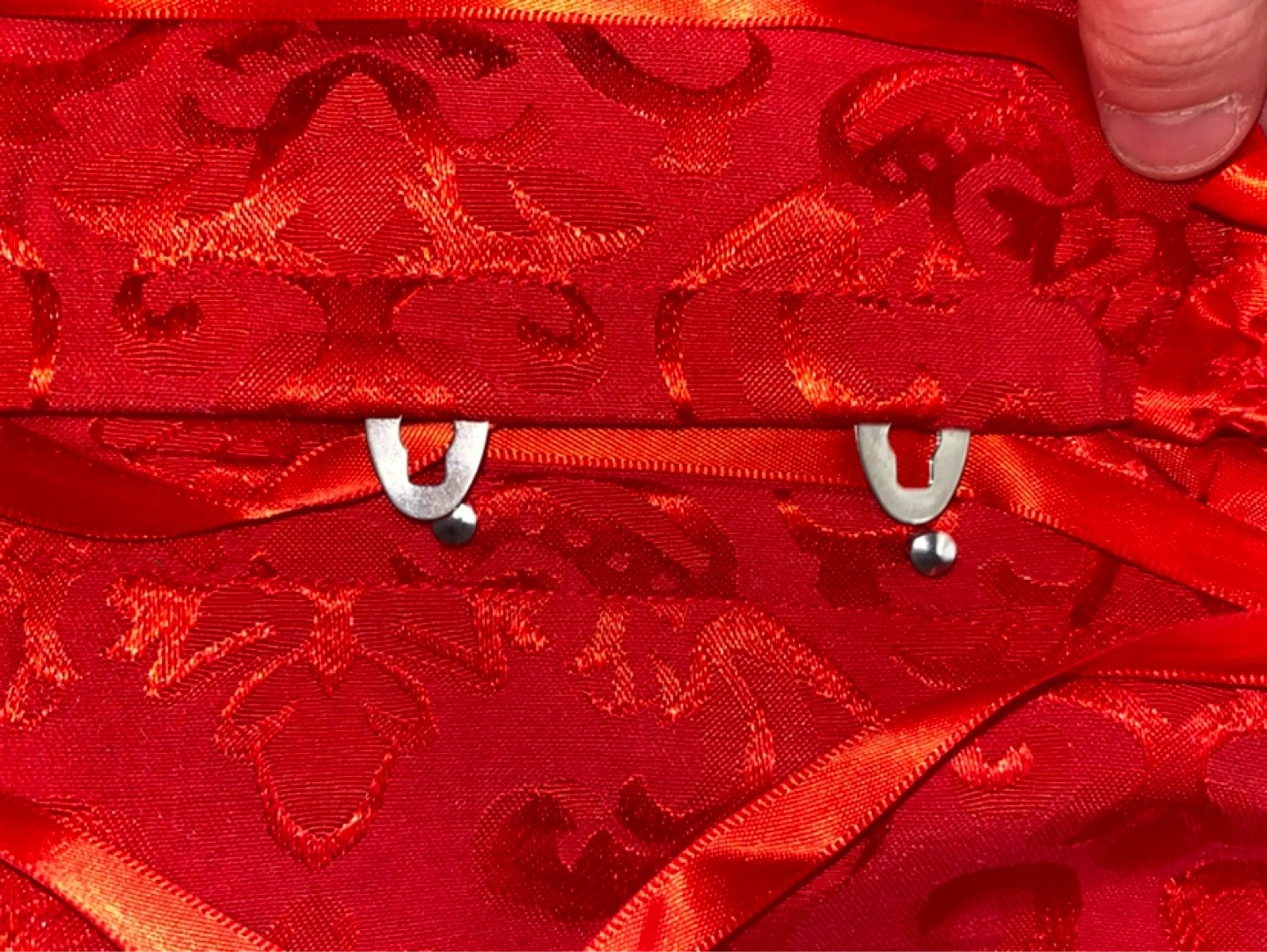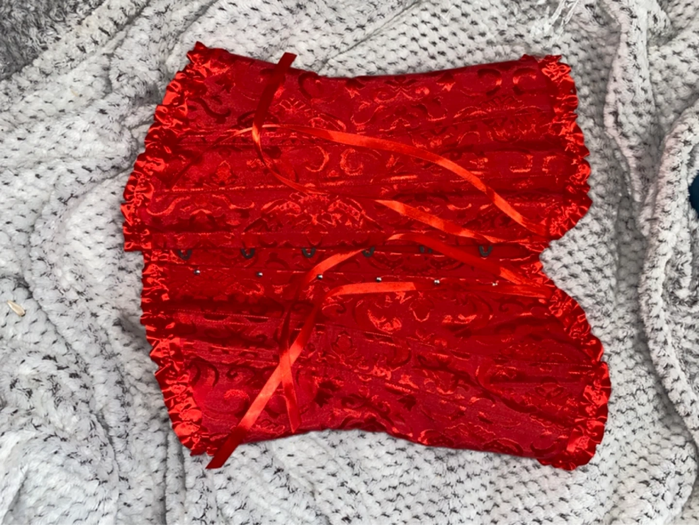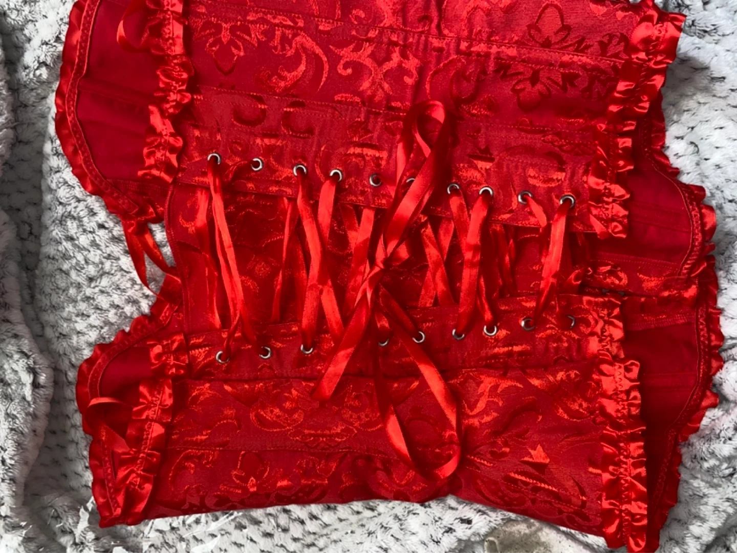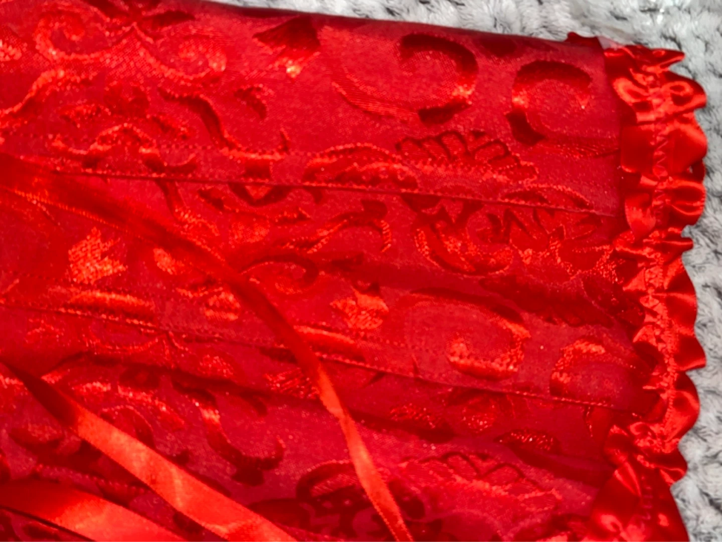 This red corset features a beautiful jacquard floral pattern and decorative ruffles along the edges. It includes ribbon lacing at the back for a customizable fit and metal clasps at the front. Super cute, and only worn once on Halloween. XS-S