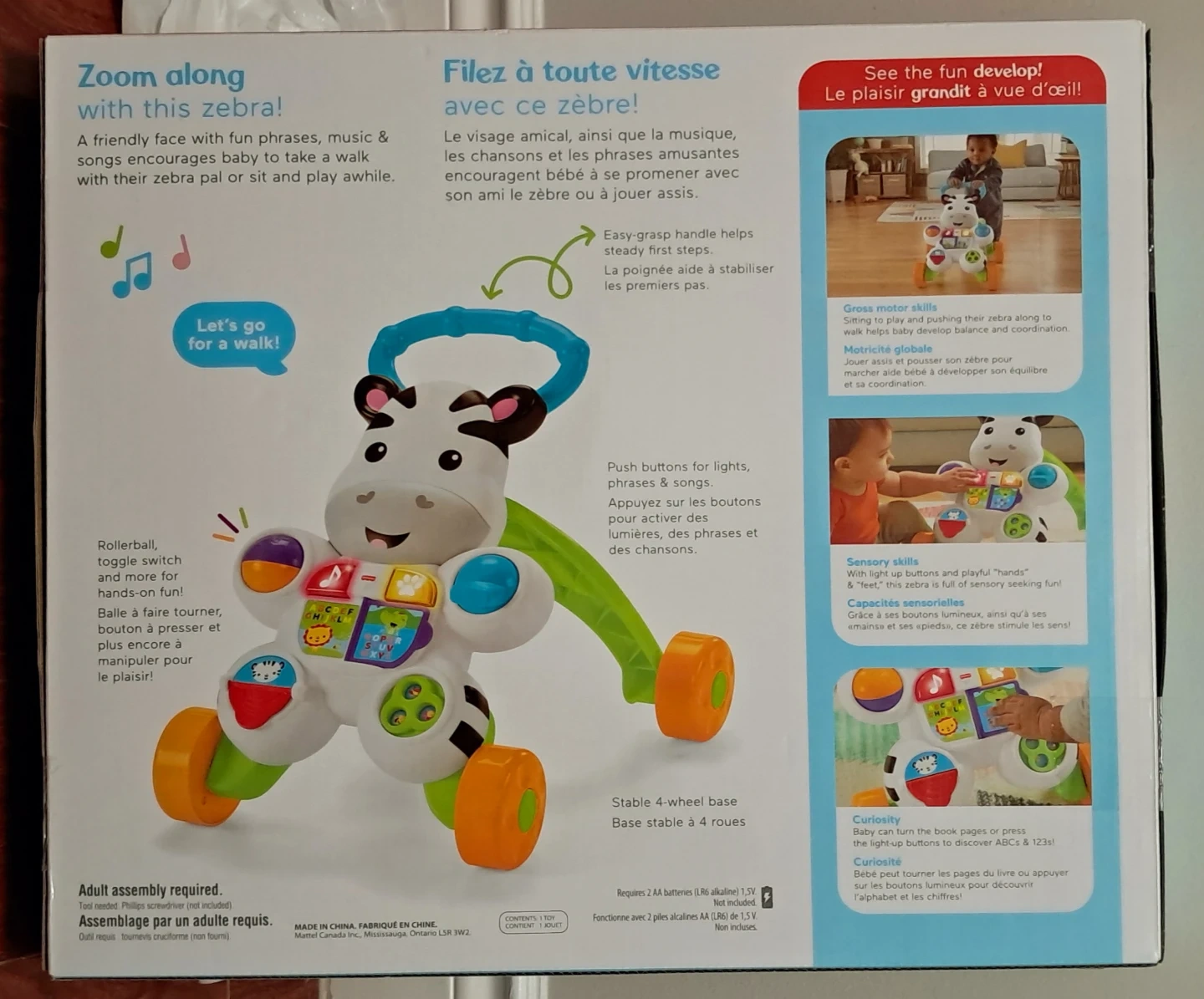 This Fisher-Price zebra walker is an activity toy with music and lights. It's suitable for ages 6 months and up. Encourages baby's first steps!.