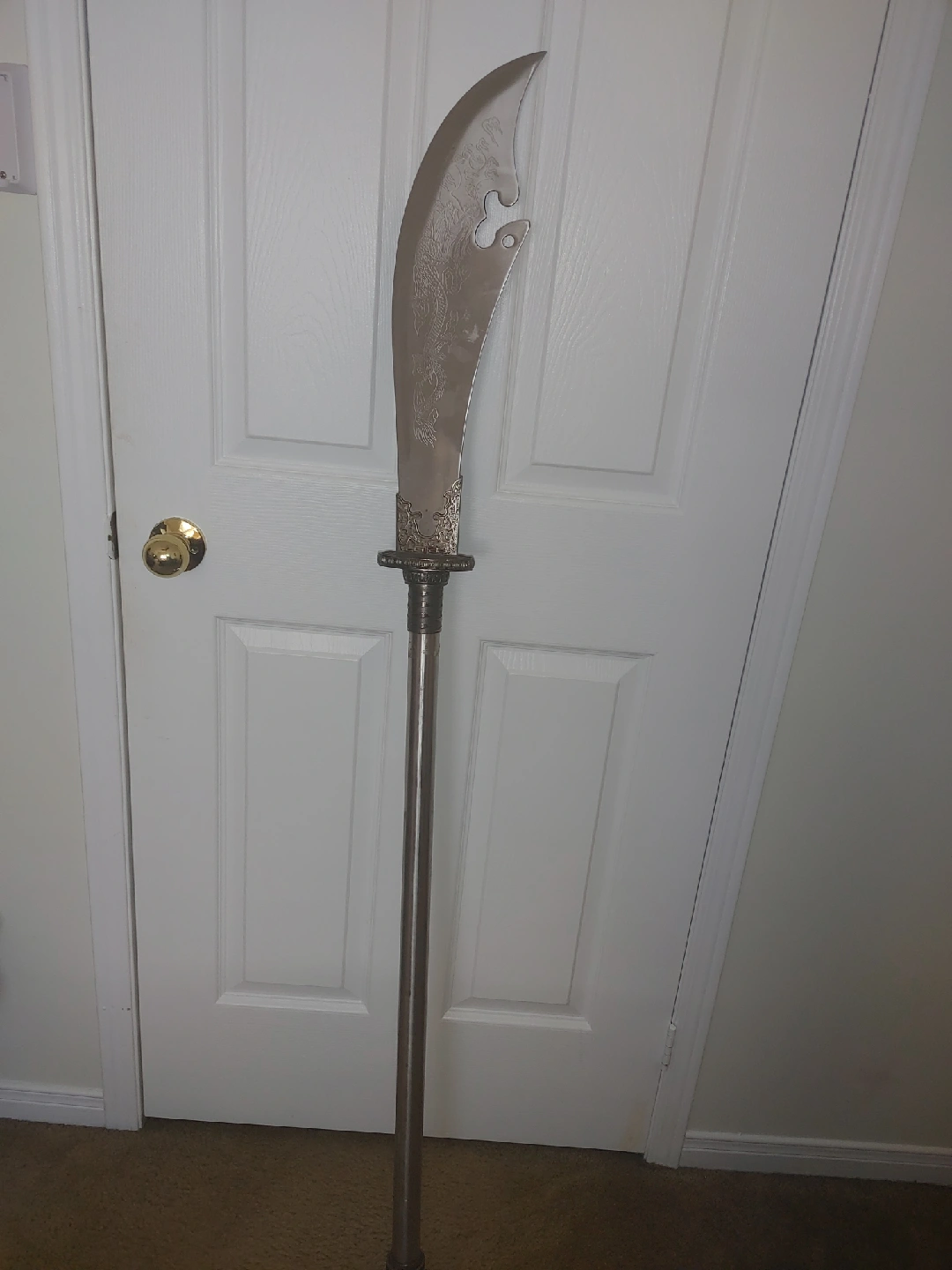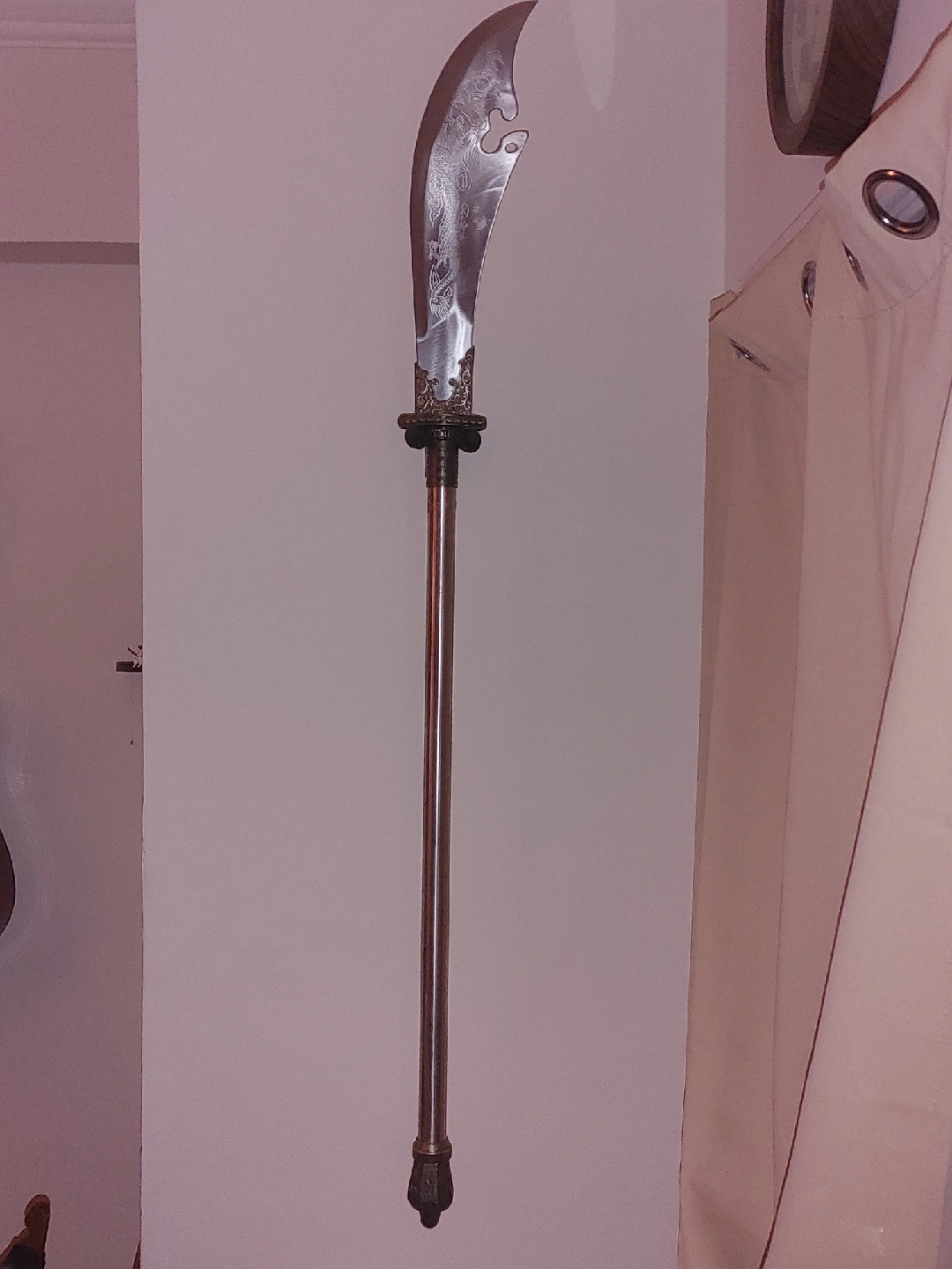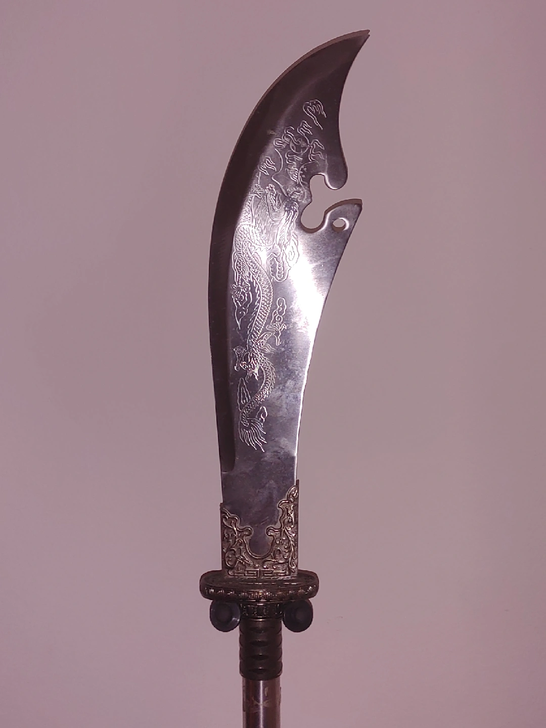 Selling a Guan Dao polearm. It features a curved blade with a dragon design etched on it. The pole is made of metal. selling for half of its value