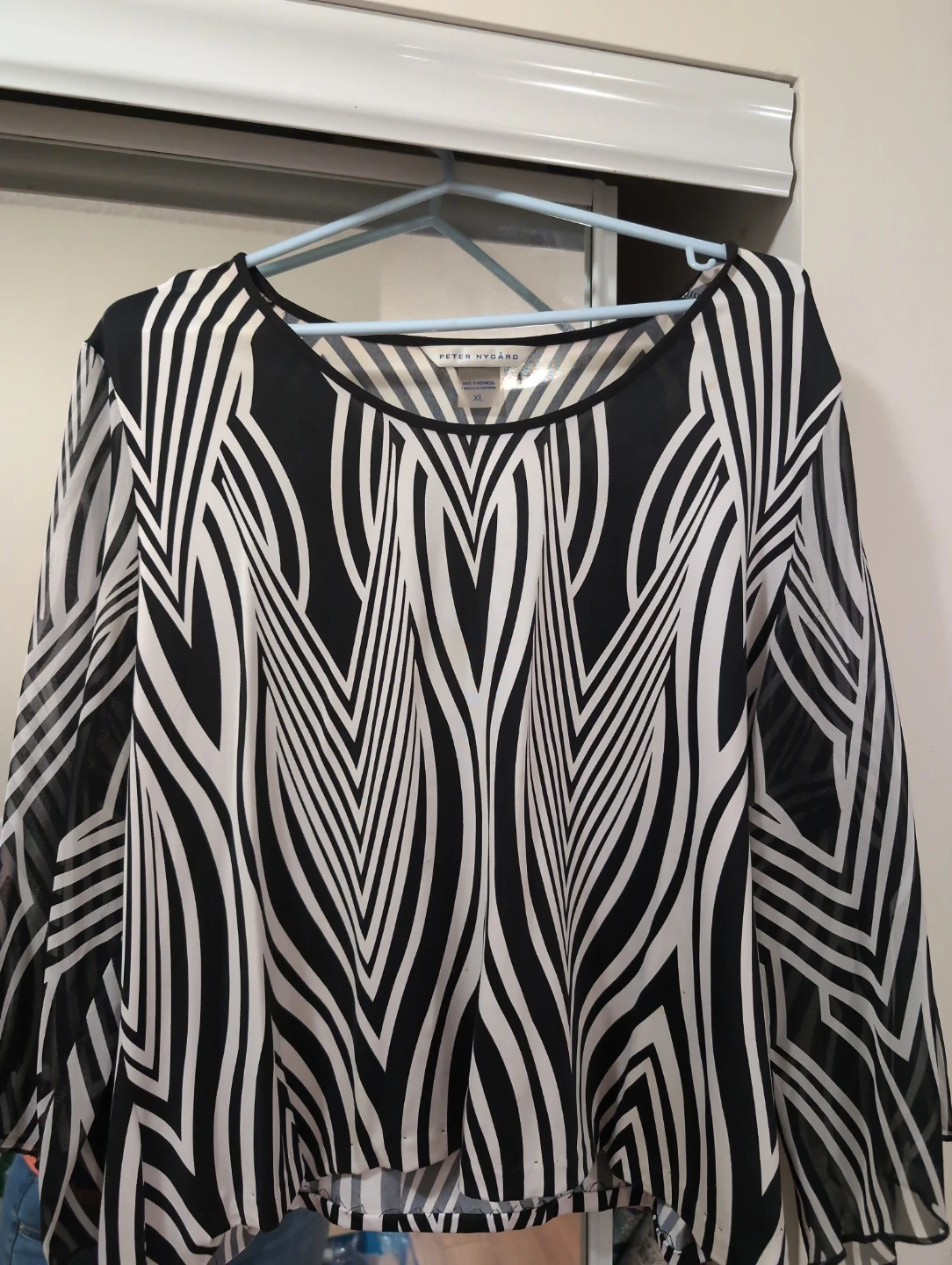 This Peter Nygard blouse features a bold black and white geometric print. It's a size XL with a flowy, sheer sleeve design. The fabric has a nice drape, perfect for layering or wearing on its own.