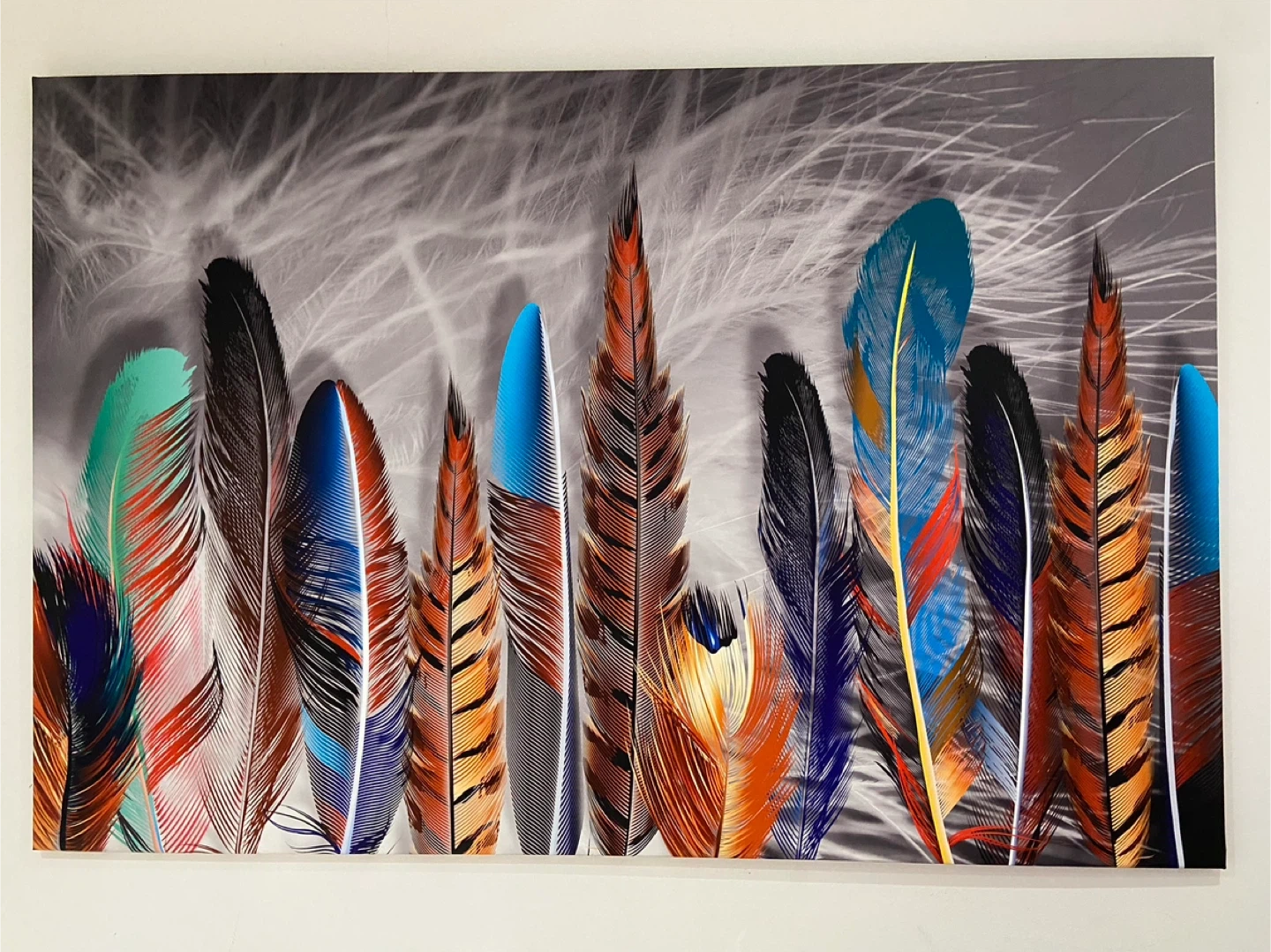 This canvas wall art features a vibrant collection of colourful feathers. It's a striking piece that adds a touch of artistic flair to any room. The artwork is printed on canvas and ready to hang. It's suitable for bringing visual interest to a living room or bedroom.