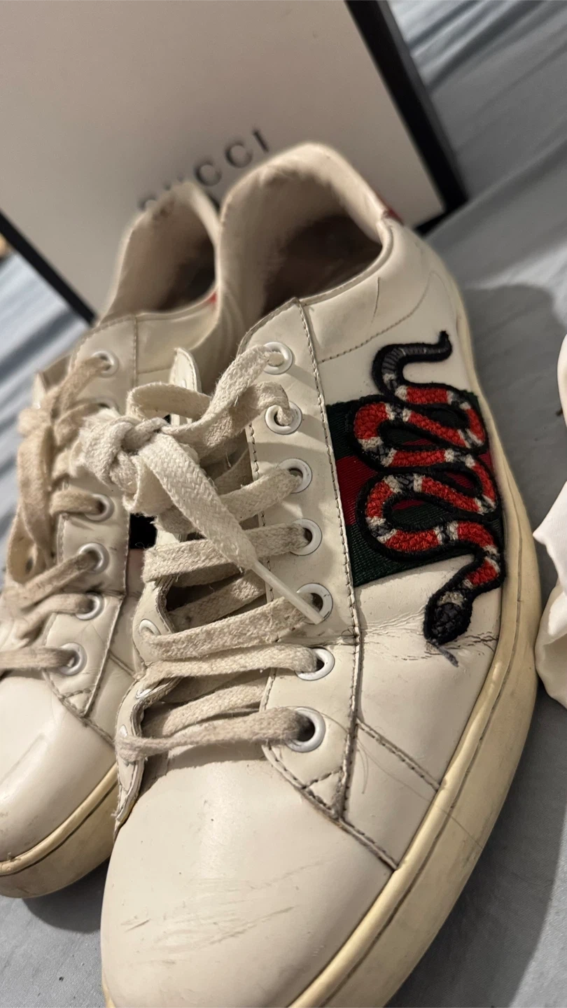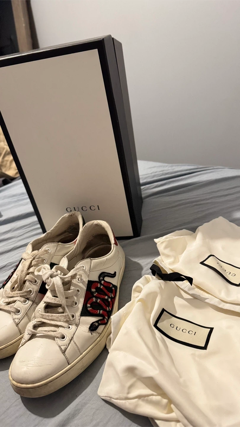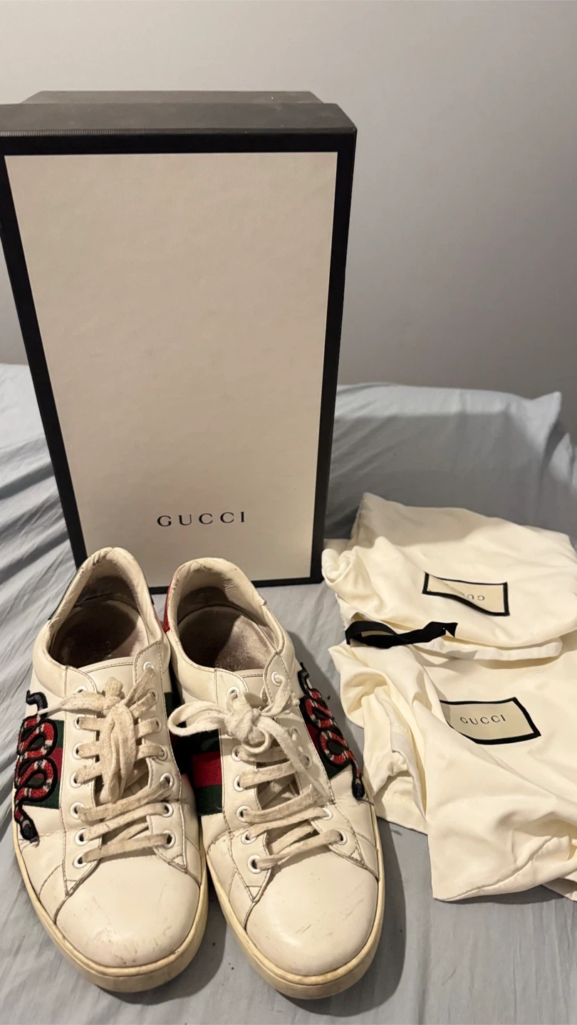 Selling a pair of Gucci Ace sneakers with the embroidered snake detail! They are a size 9 and come with the original box and dust bags. These sneakers have a classic look with the iconic Gucci stripe and snake design. They do show some signs of wear, but still have plenty of life left!