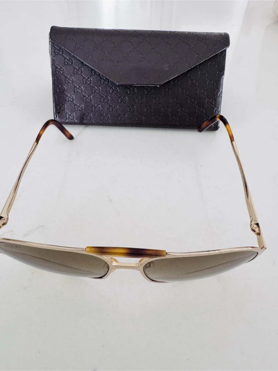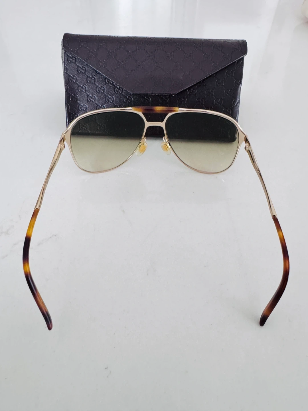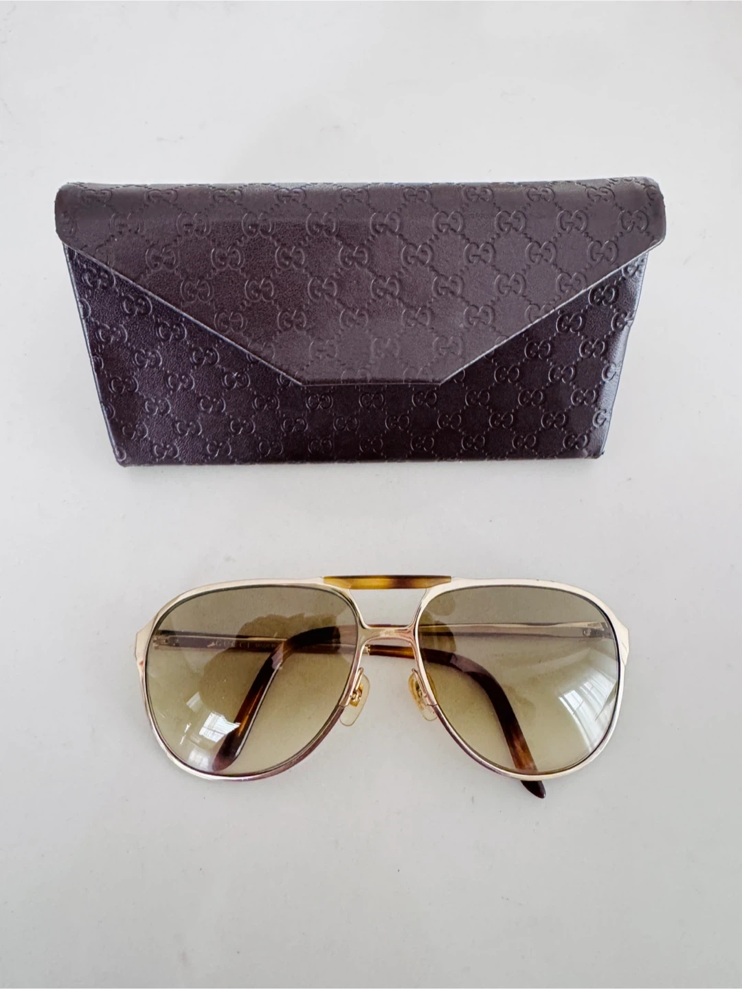 Selling a pair of Gucci aviator sunglasses. They come with the original Gucci case, which has the iconic Gucci pattern embossed on it. The sunglasses themselves have a gold-tone frame and gradient lenses. Made in Italy. They are in great condition!