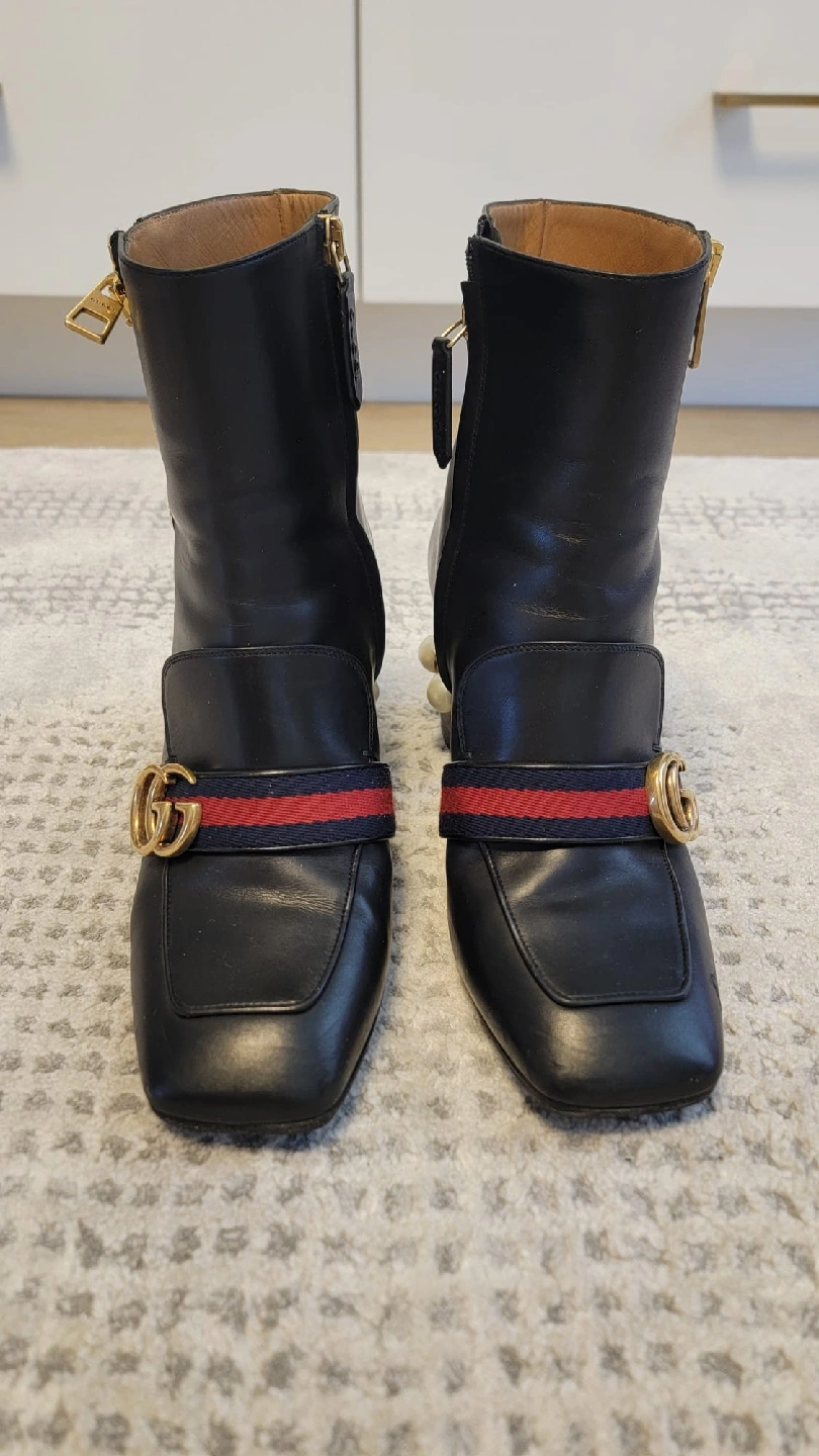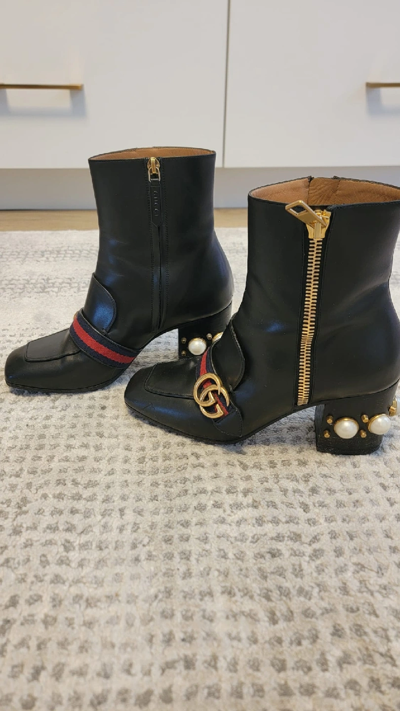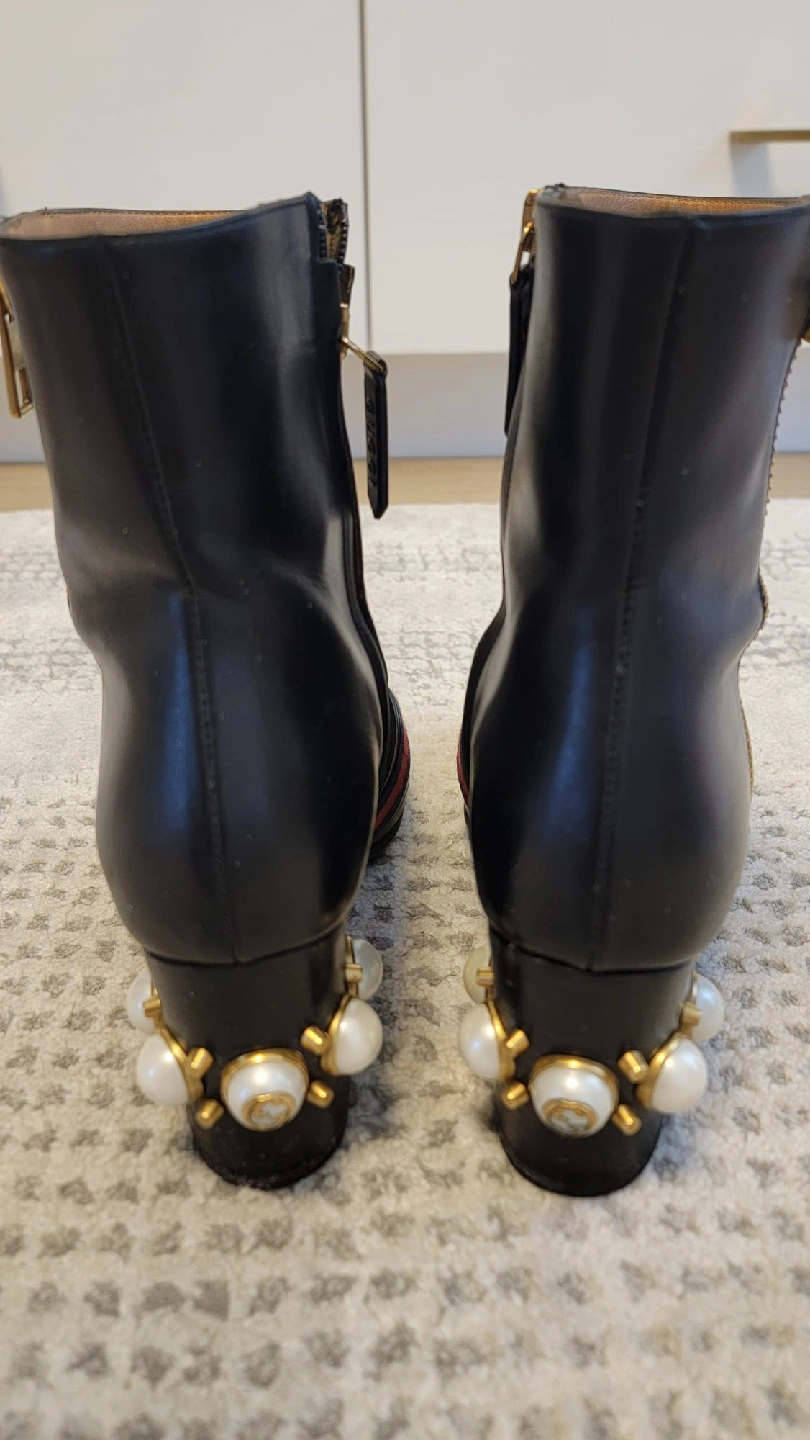 Stylish black leather ankle boots from Gucci! These boots feature a distinctive design with gold-tone zippers and the iconic Gucci logo. They have a unique heel design adorned with pearls. Great for adding a touch of luxury to any outfit. Comes with box and dust bags and receipt from Gucci store Downtown