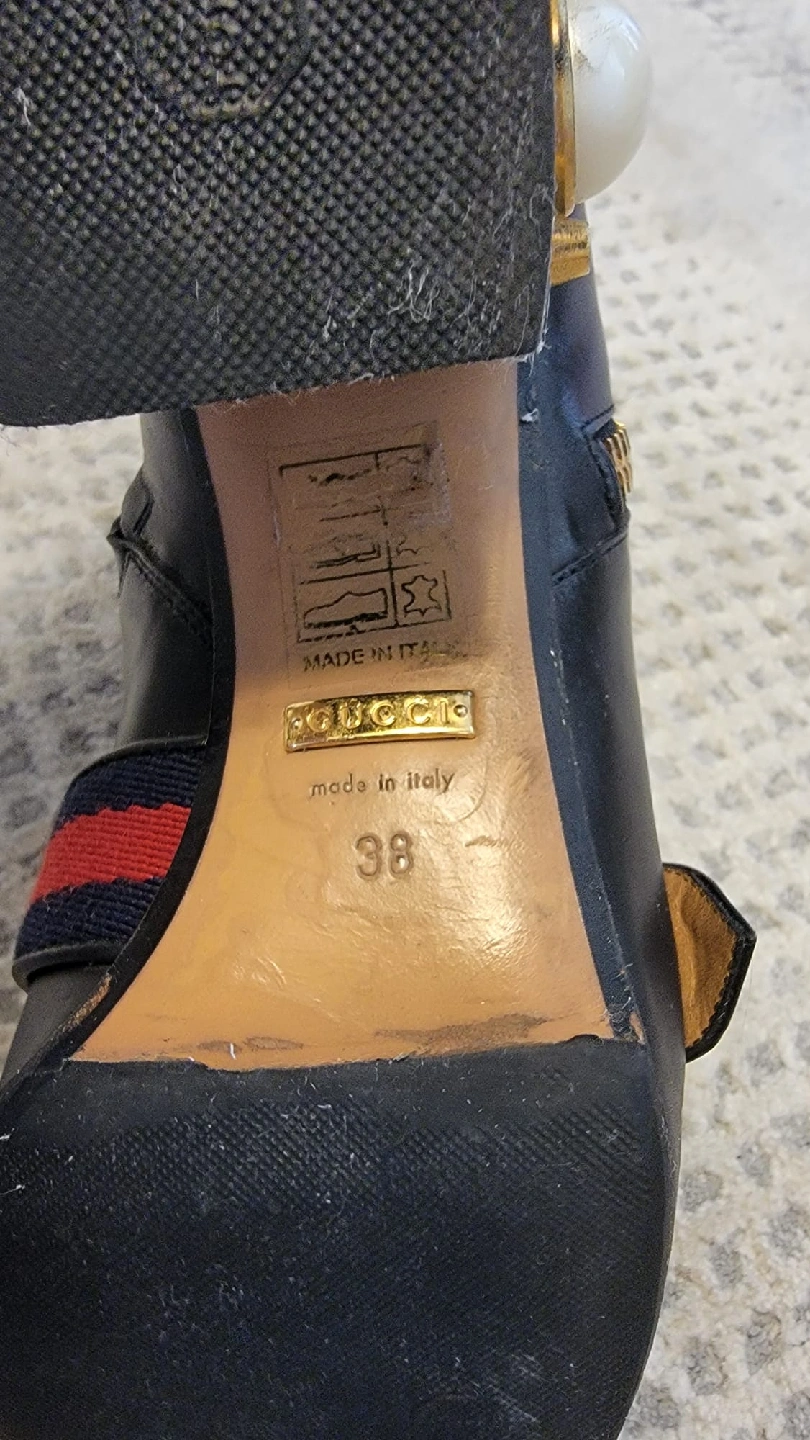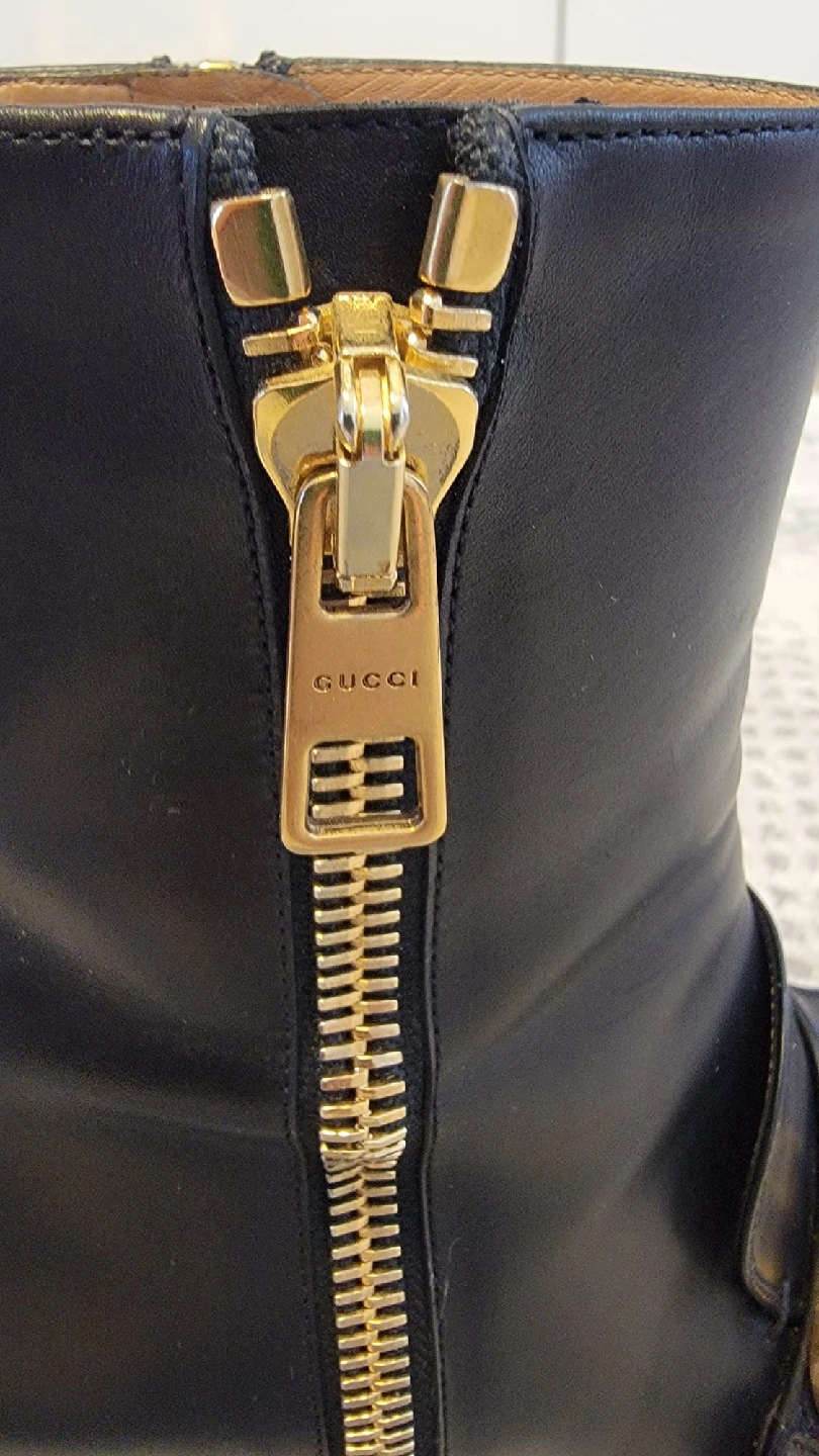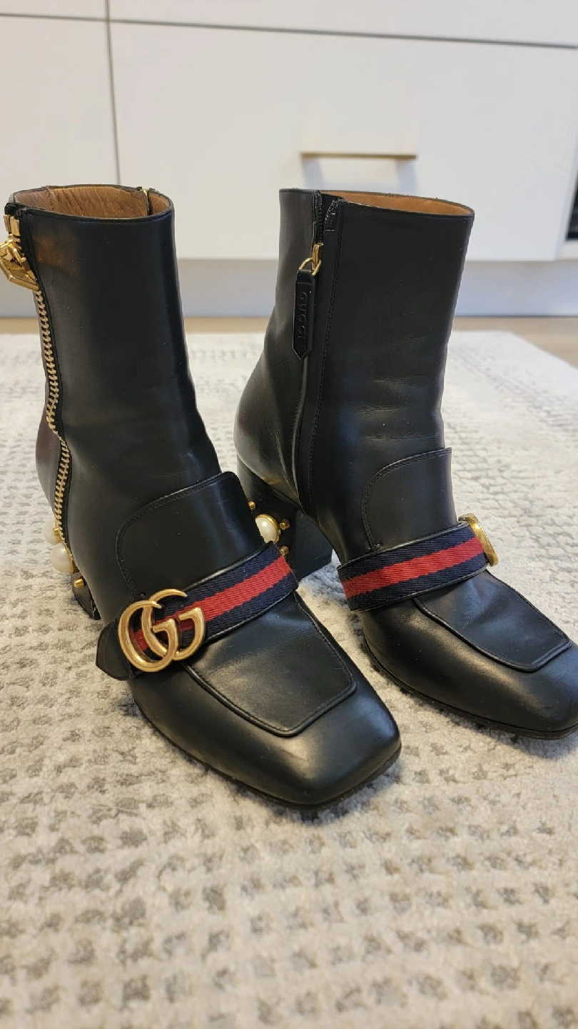 Stylish black leather ankle boots from Gucci! These boots feature a distinctive design with gold-tone zippers and the iconic Gucci logo. They have a unique heel design adorned with pearls. Great for adding a touch of luxury to any outfit. Comes with box and dust bags and receipt from Gucci store Downtown
