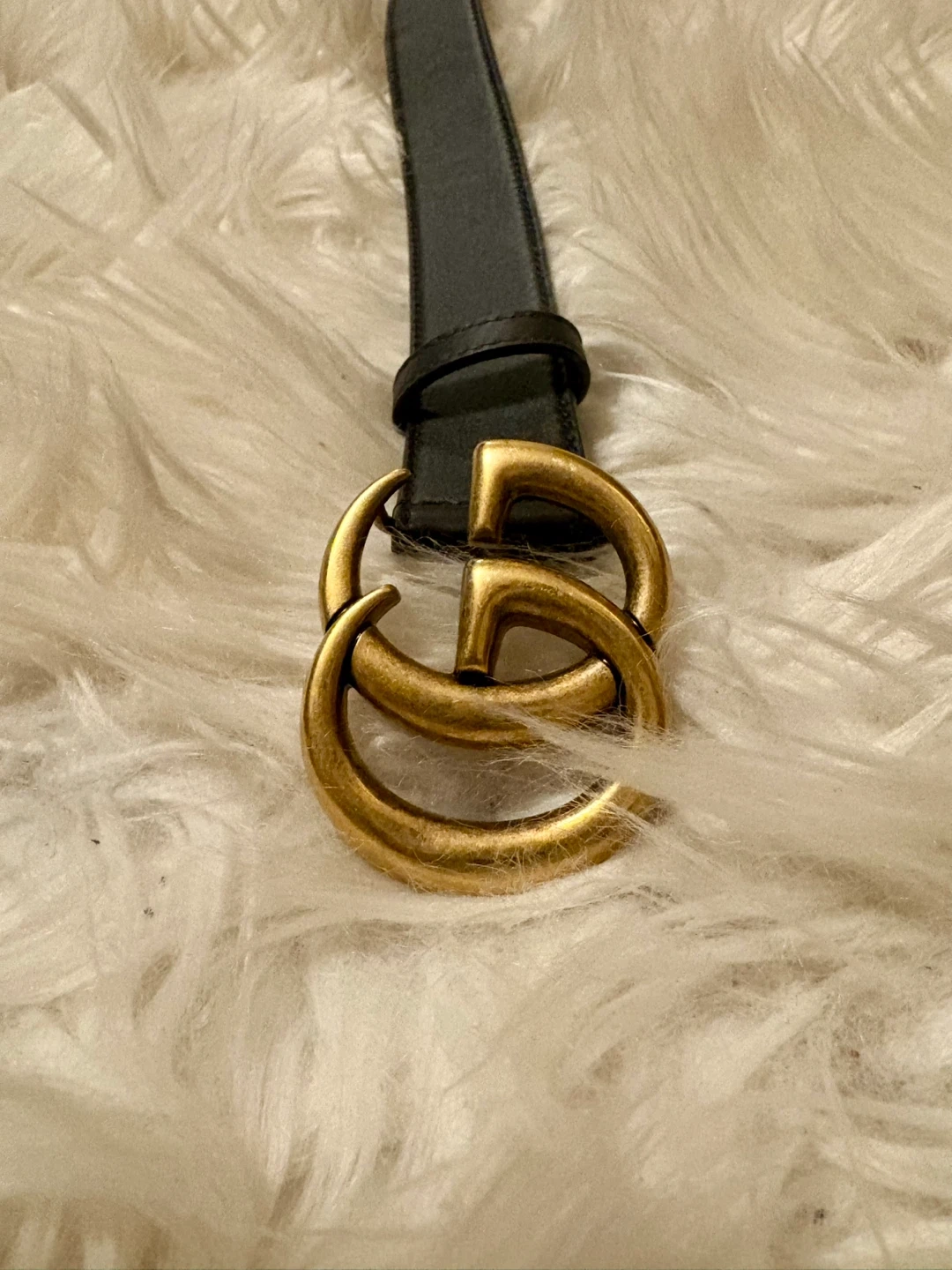 86Selling a stylish Gucci belt! It features a black leather strap and a distinctive gold-toned GG buckle. Comes with the original dust bag. Originally listed for $1,000, now asking $500!