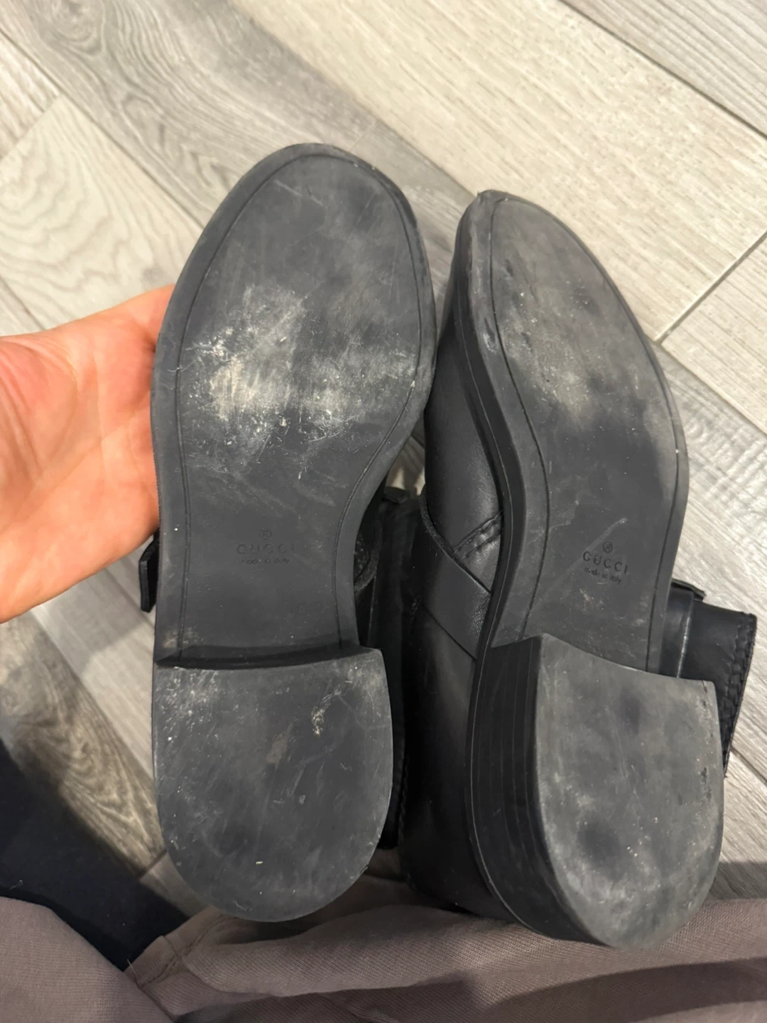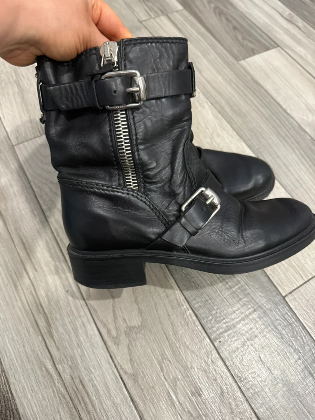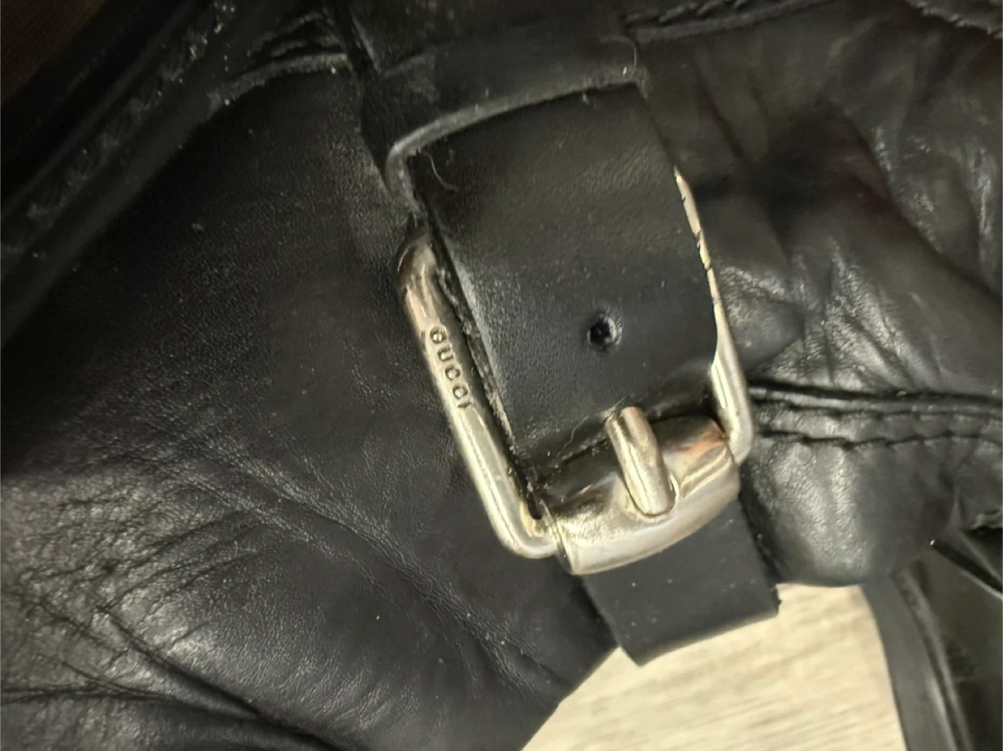 160Selling a pair of Gucci black leather biker boots. They feature buckle detailing and a zipper accent. The soles show some wear, but they're still in good condition and have lots of life left!