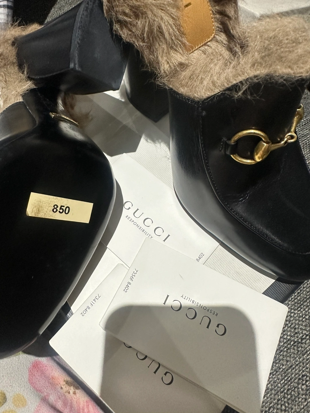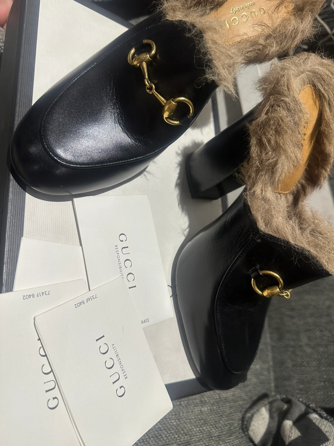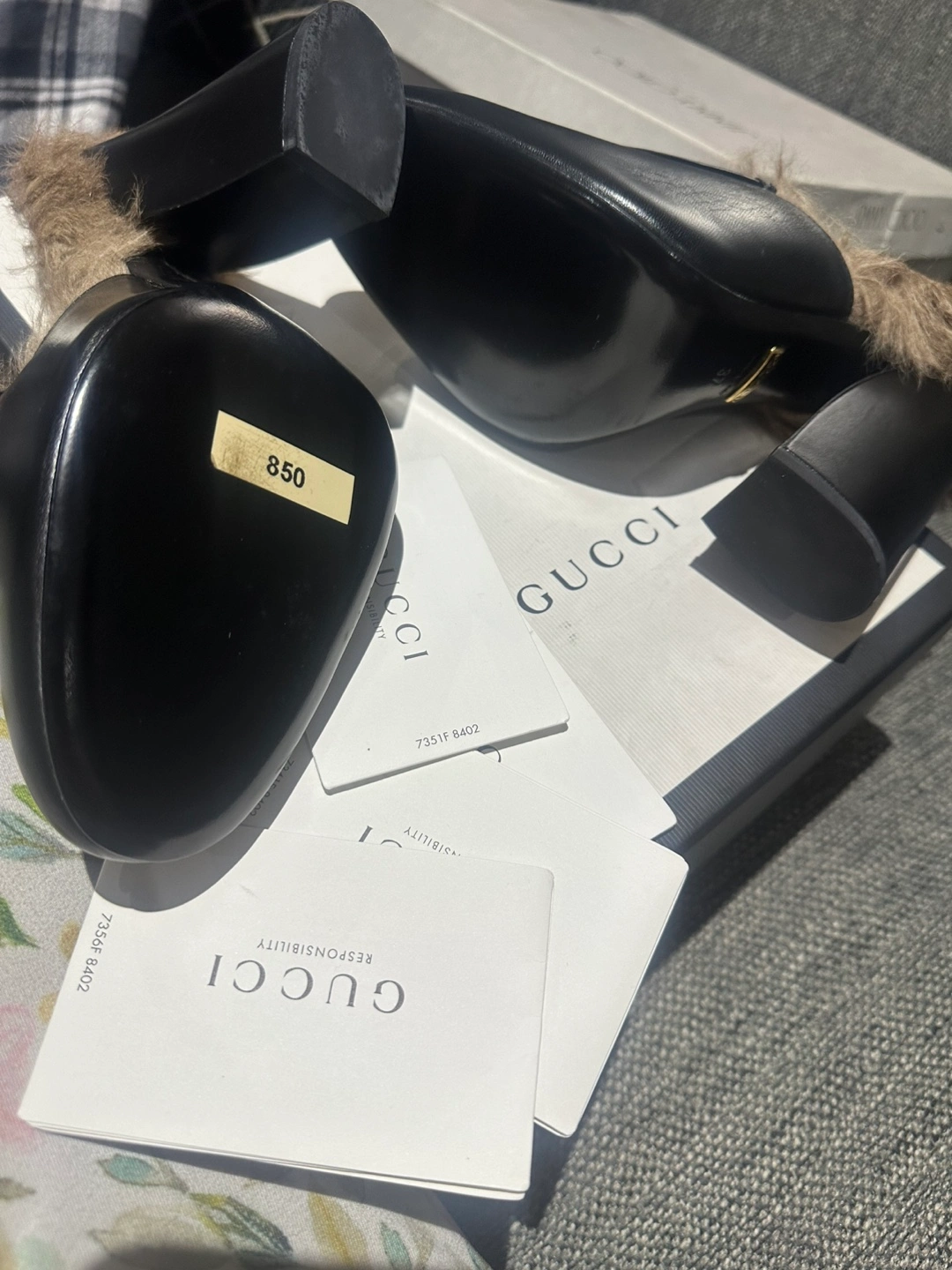 Gucci women's mules. Black leather upper. Brown fur lining. Gold-toned hardware. Block heel. Comes with box and dust bags. Brand new