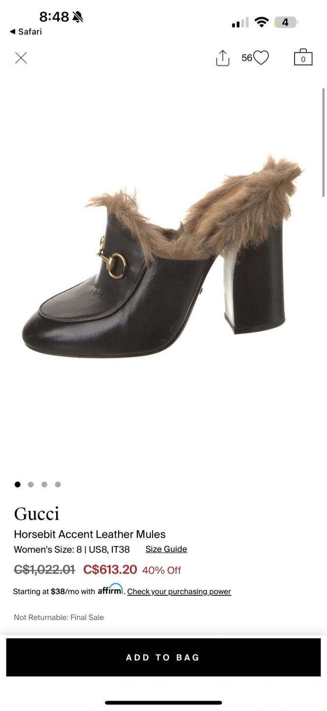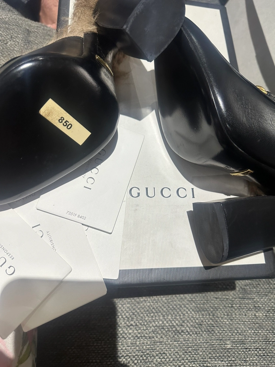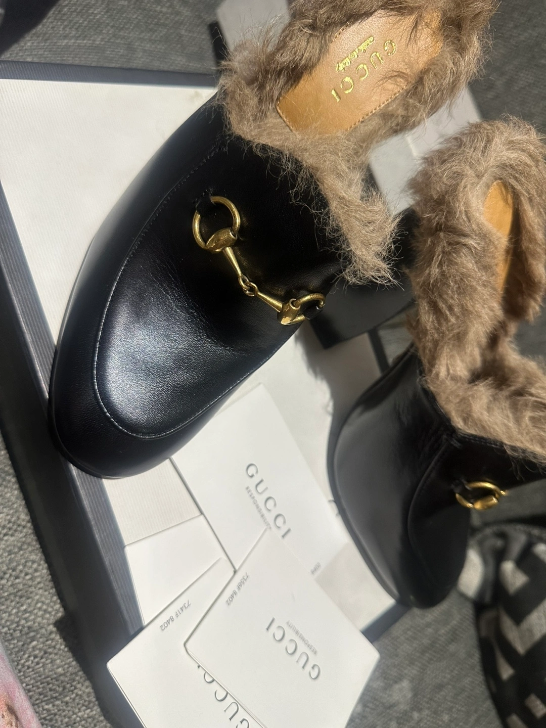 Gucci women's mules. Black leather upper. Brown fur lining. Gold-toned hardware. Block heel. Comes with box and dust bags. Brand new