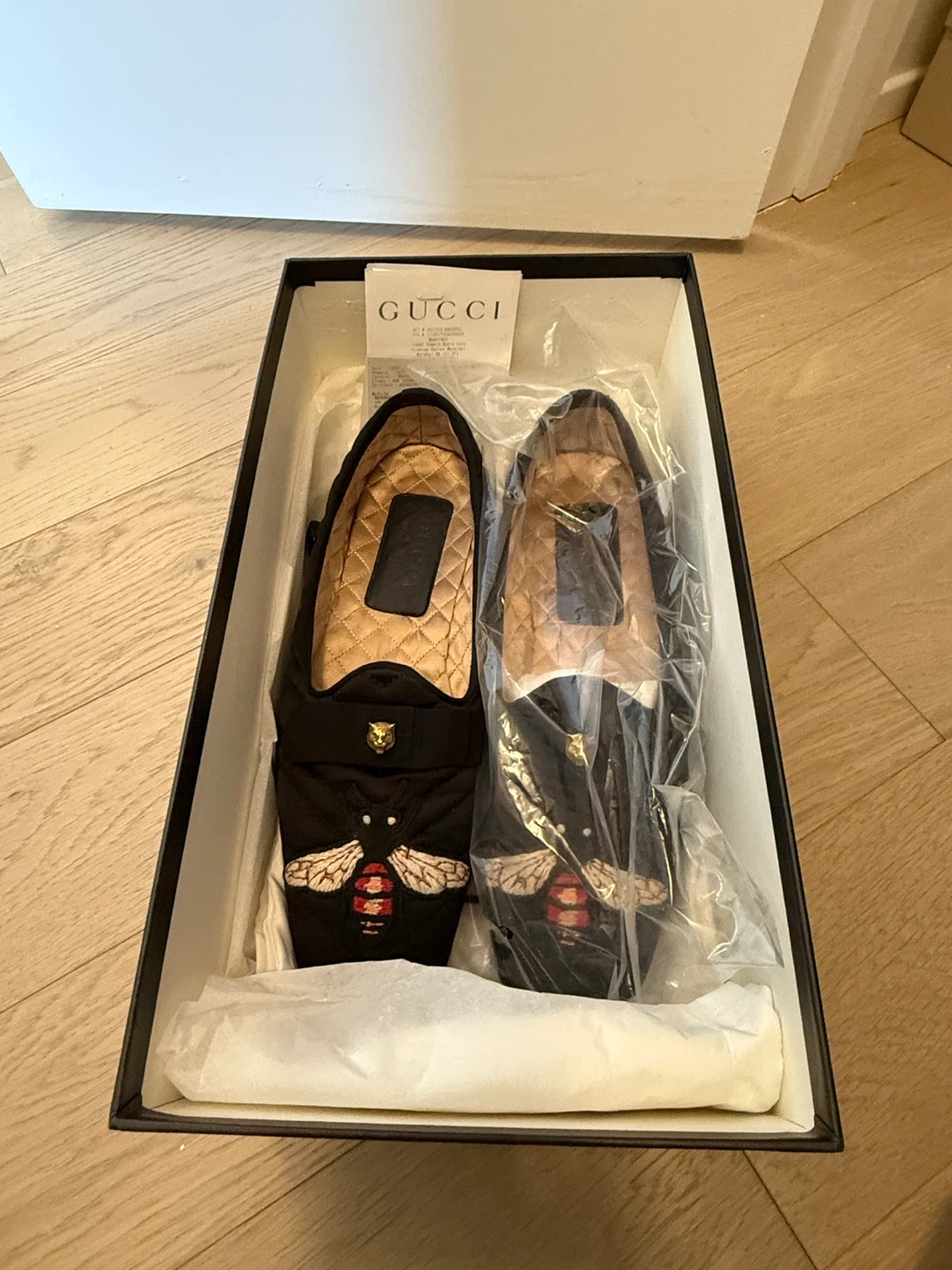39These Gucci loafers are in great condition and come with the original box! They're a size 7.5 and feature a unique quilted design with a bee embroidery. The black colour makes them versatile for any outfit. Don't miss out on these stylish and comfortable shoes! Fits regular size men shoe 8.5-9