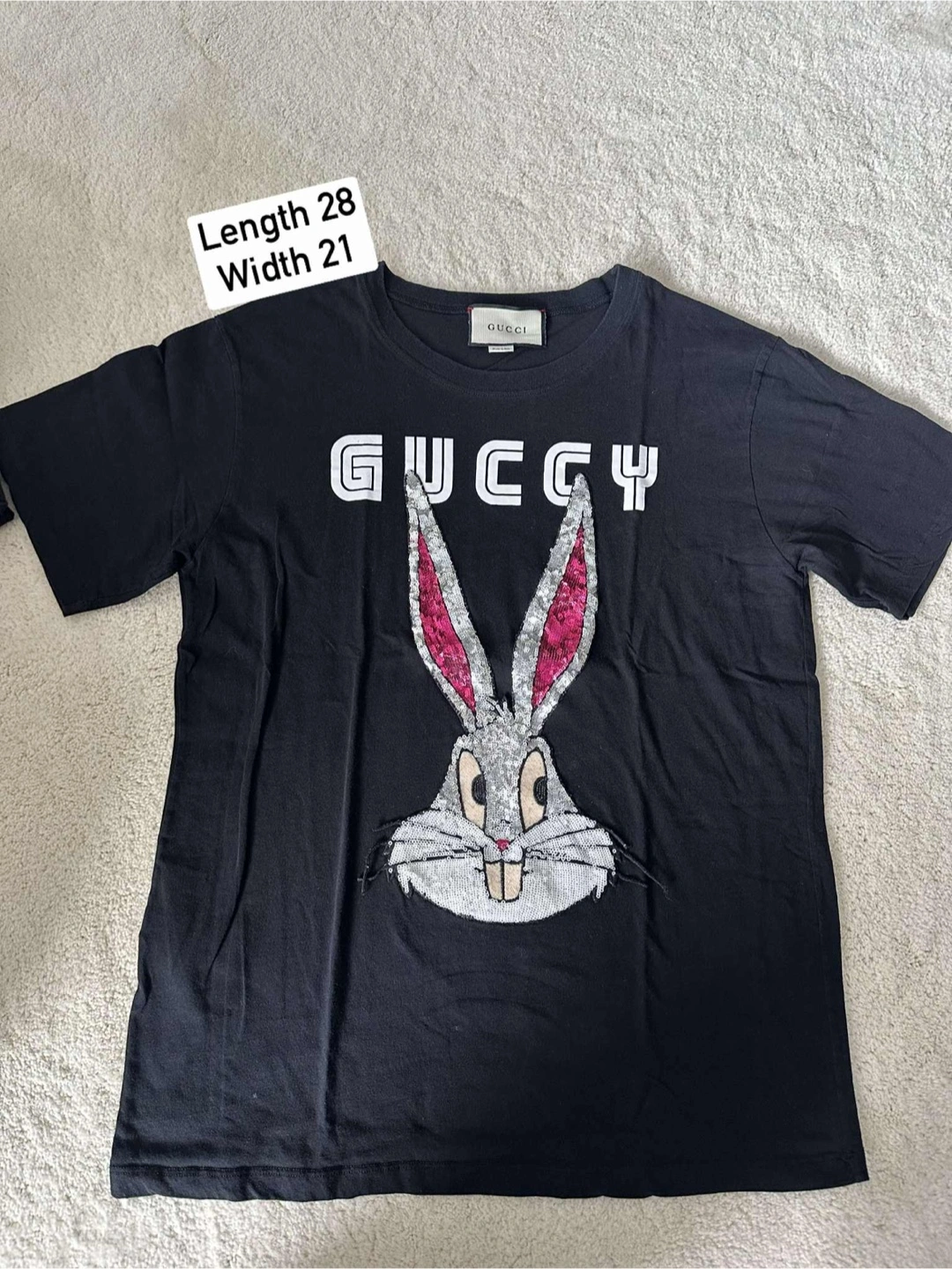 Selling a Gucci black t-shirt with a Bugs Bunny design. The length is 28 inches and the width is 21 inches