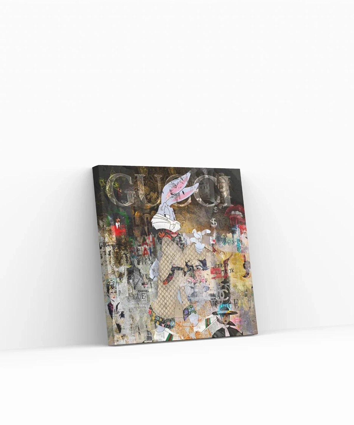 Unique Gucci-themed canvas art featuring Bugs Bunny. This eye-catching piece would add a touch of fun and luxury to any room. Perfect for fans of high fashion and classic cartoons alike!