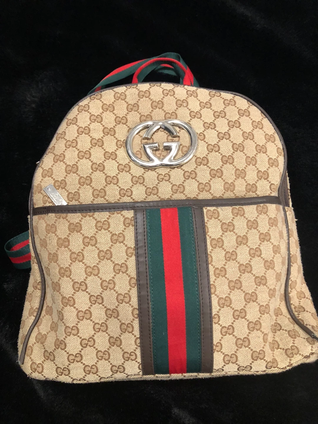 65Selling a Gucci GG canvas backpack. It has the iconic GG pattern and red and green stripe detailing. There's some wear and tear on the straps and corners, as shown in the pictures. Still a stylish bag!