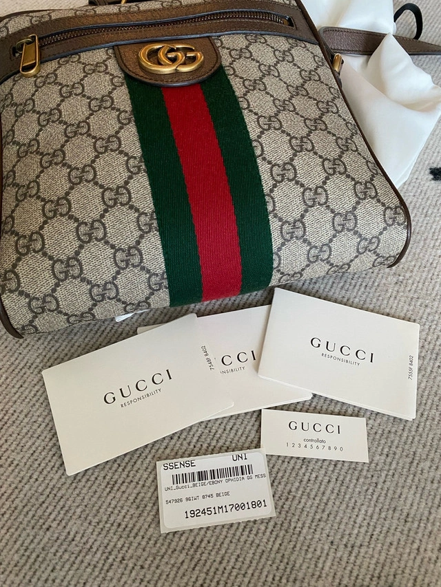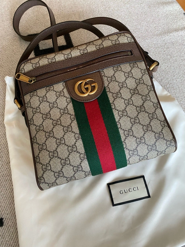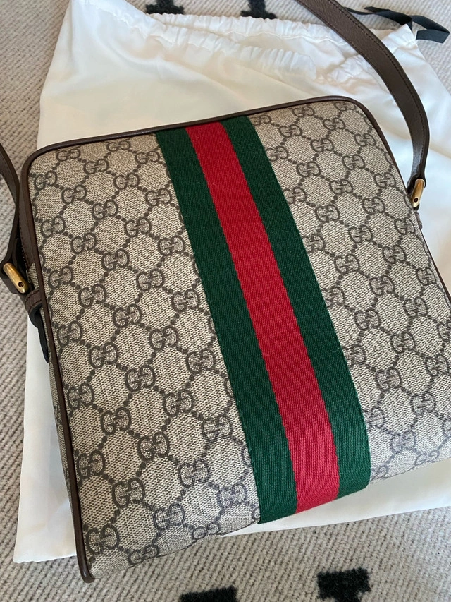 Selling a stylish Made in Italy Authentic Gucci GG Ophidia messenger bag, complete with its iconic design and signature leather stripe. This bag is in brand new unworn condition, having been carefully stored and maintained. Perfect for adding a touch of luxury to any outfit, its space size is ideal for carrying essentials while on the go. The Ophidia GG Messenger bag enhances the line's vintage appeal, with the GG motif and Web stripe paying homage to Gucci's roots. Features: Demensions: 24cm X 23cm X 10cm Made in Italy - Beige/ebony GG Supreme canvas - Brown leather trim - Gold-toned hardware - Green and red Web - Double G Signature Logo - Front zipper pocket - Interior open pocket - Adjustable shoulder strap - Zipper closure - MSRP: $2400 CAD Available? If the ad is up, the bag is ready for a new home.