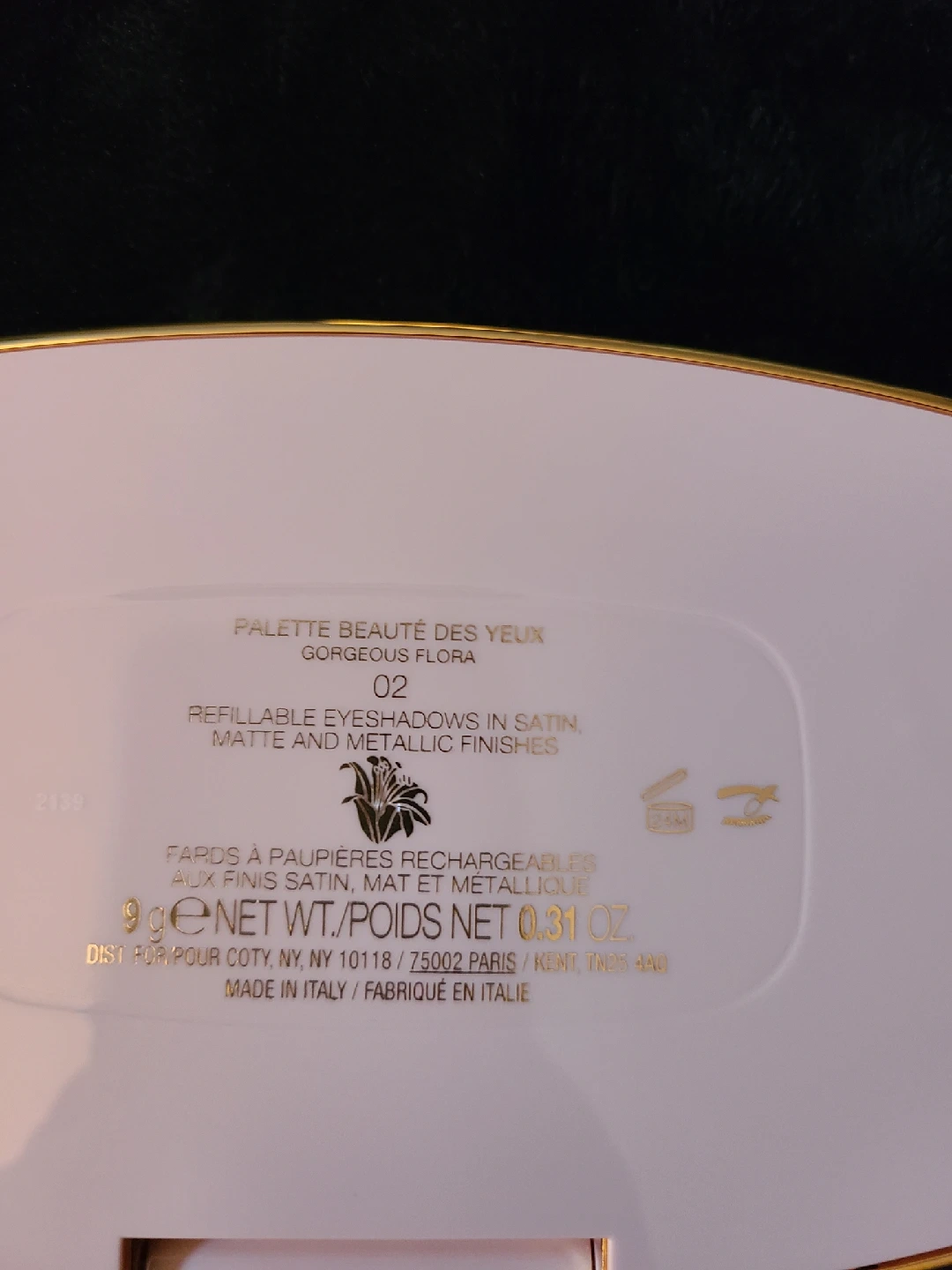 236Gucci Gorgeous Flora eyeshadow palette! This palette features refillable eyeshadows in satin, matte, and metallic finishes. It contains 9g net wt./poids net 0.31 oz. Made in Italy.