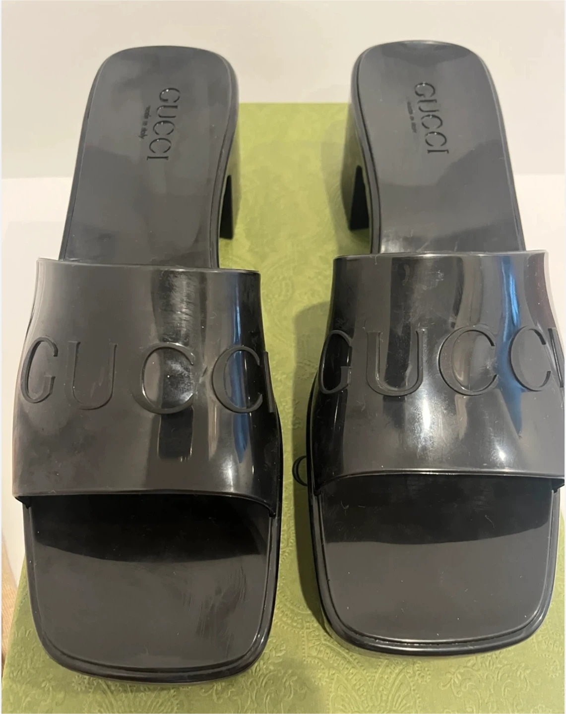 15Selling a pair of Gucci jelly slide sandals in black. They come with the original box. Perfect for adding a touch of luxury to your casual outfits! Mint condition , size 8.5 $400, pickup in Vaughan