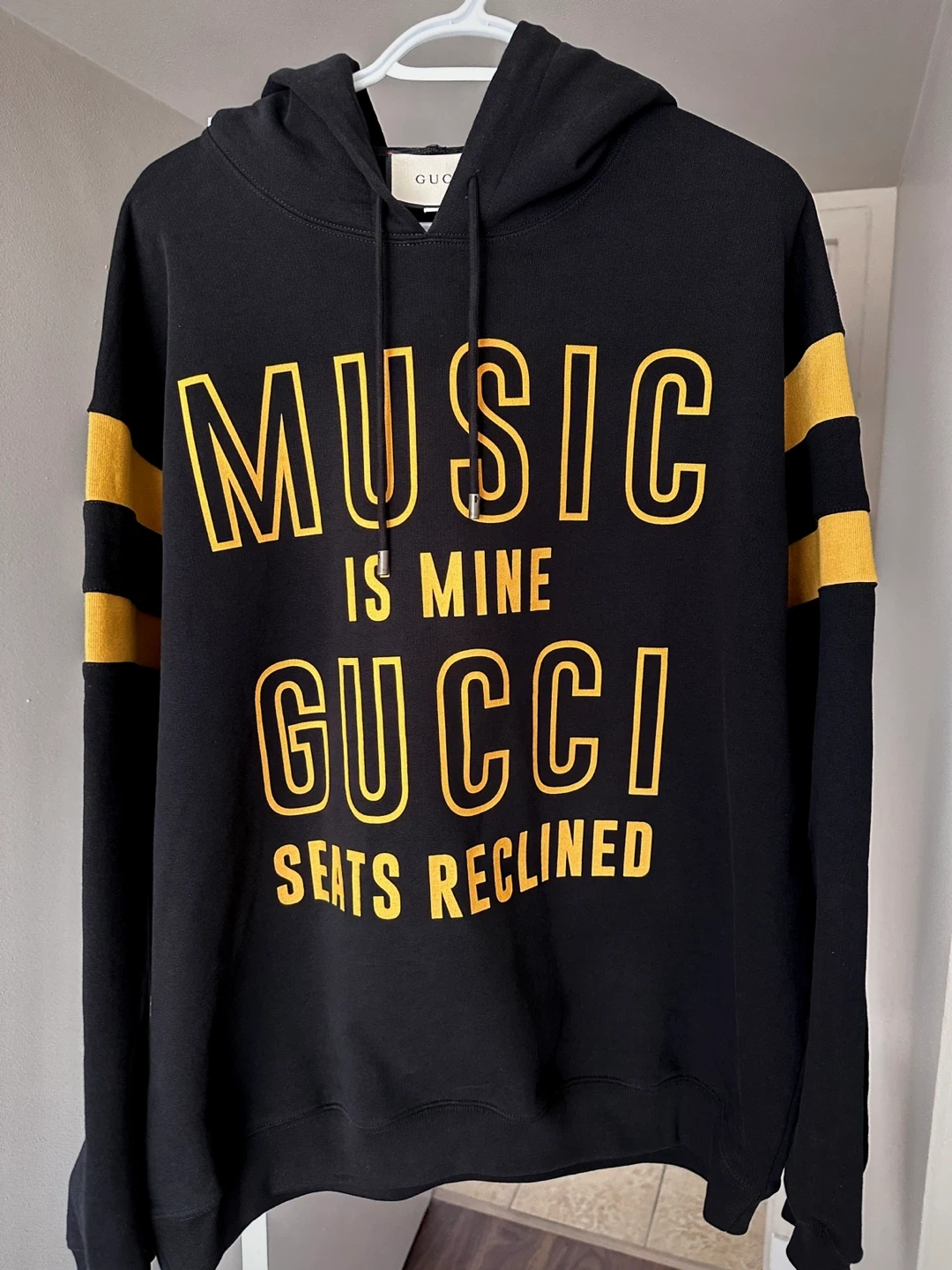 33Selling a Gucci hoodie with the words "MUSIC IS MINE GUCCI SEATS RECLINED" printed on the front. It is black with yellow lettering and stripes on the sleeves. Great for any Gucci fan! L-XL