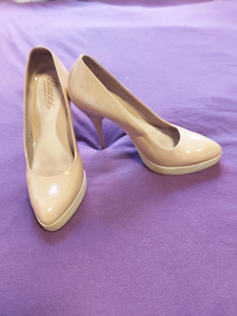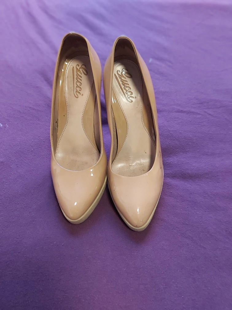 331Selling a pair of Gucci heels in a nude patent leather finish. They are marked as a size 7 They show some signs of wear, as seen in the photos.