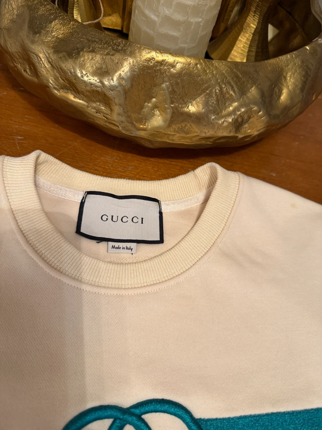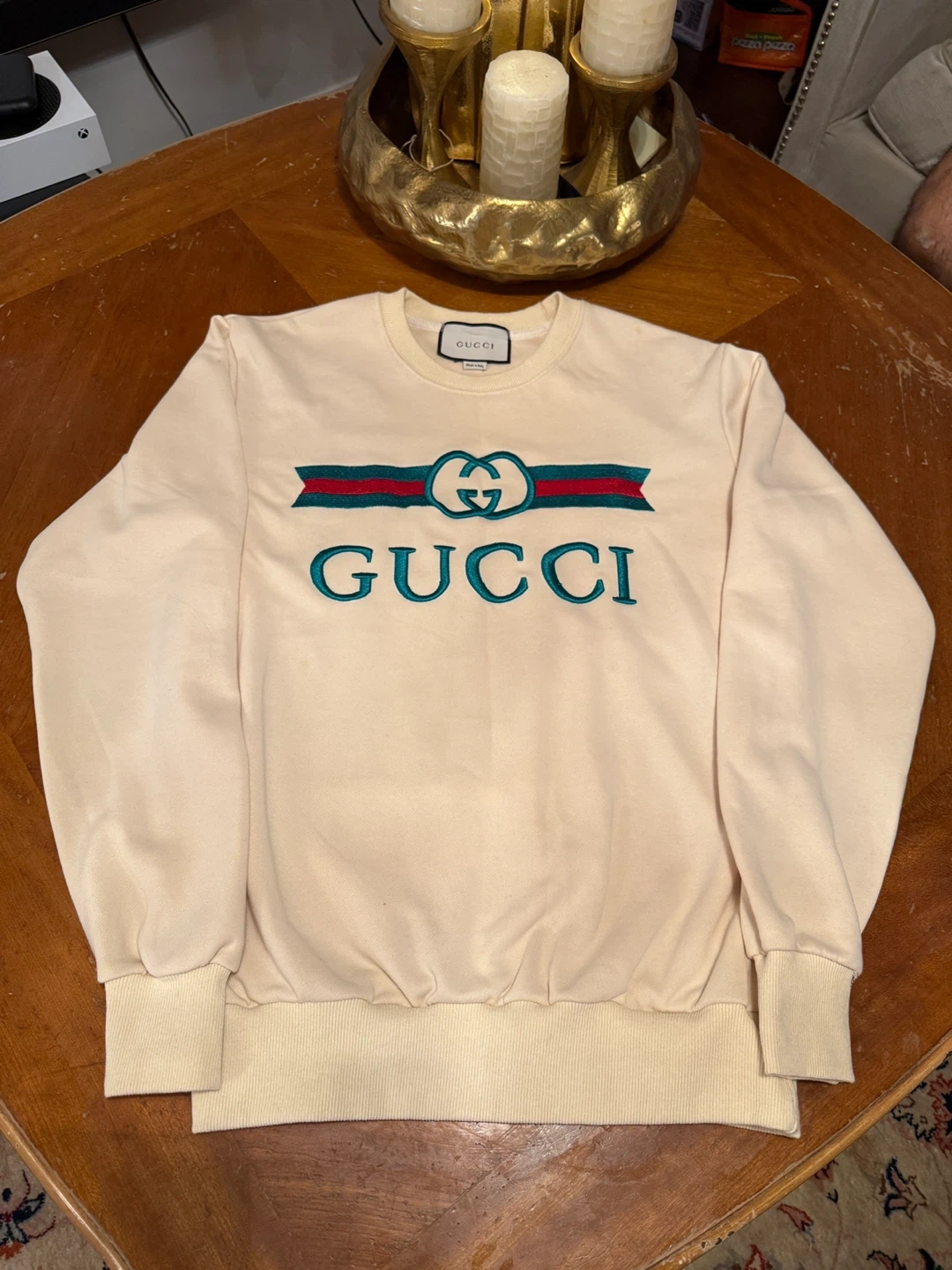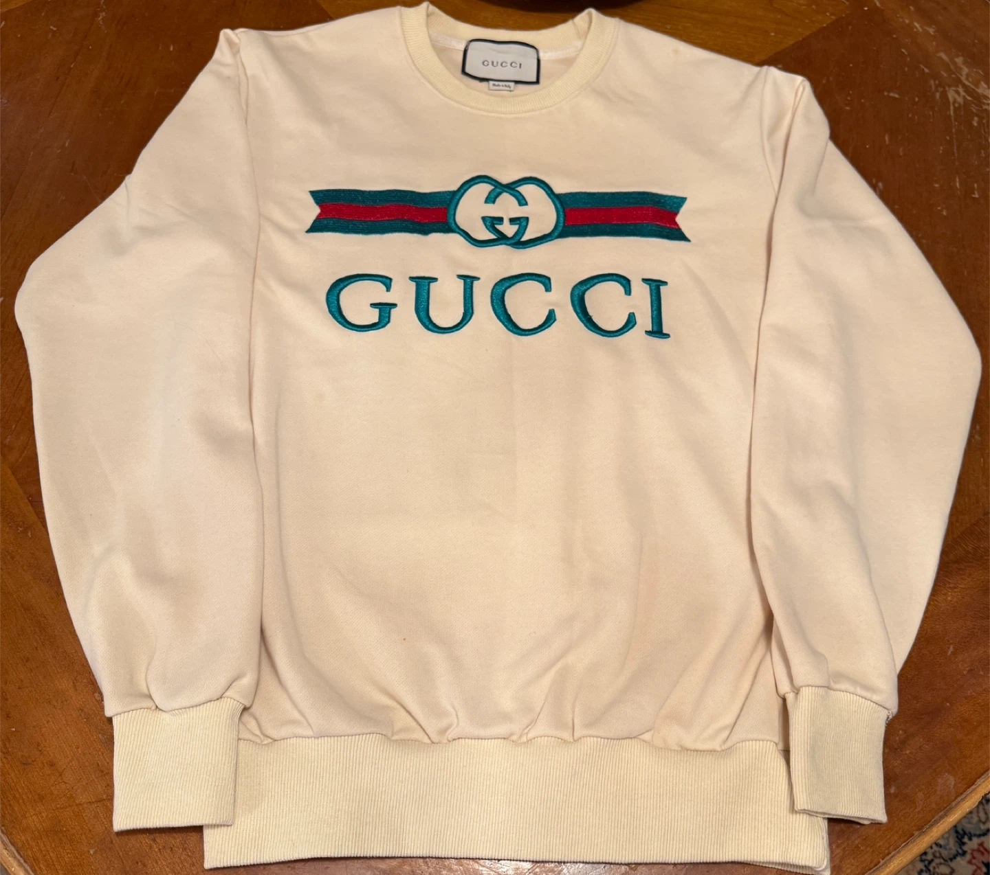 Selling a Gucci off-white sweatshirt made in Italy. The cotton material is soft and comfortable. It features the classic Gucci logo in green and red. Perfect for adding a touch of luxury to your everyday wear!