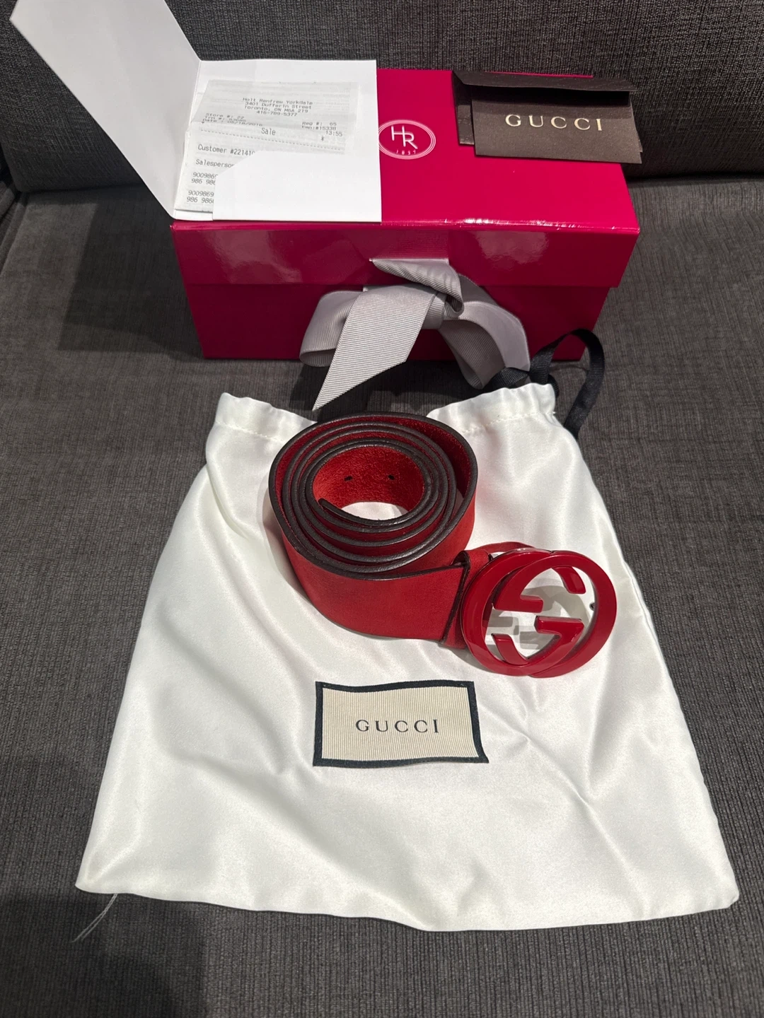 Selling a striking Gucci belt in a vibrant red! The size is 105-42. It comes with its original box and dust bag, perfect for keeping it safe and sound. This stylish accessory will definitely add a pop of colour to any outfit