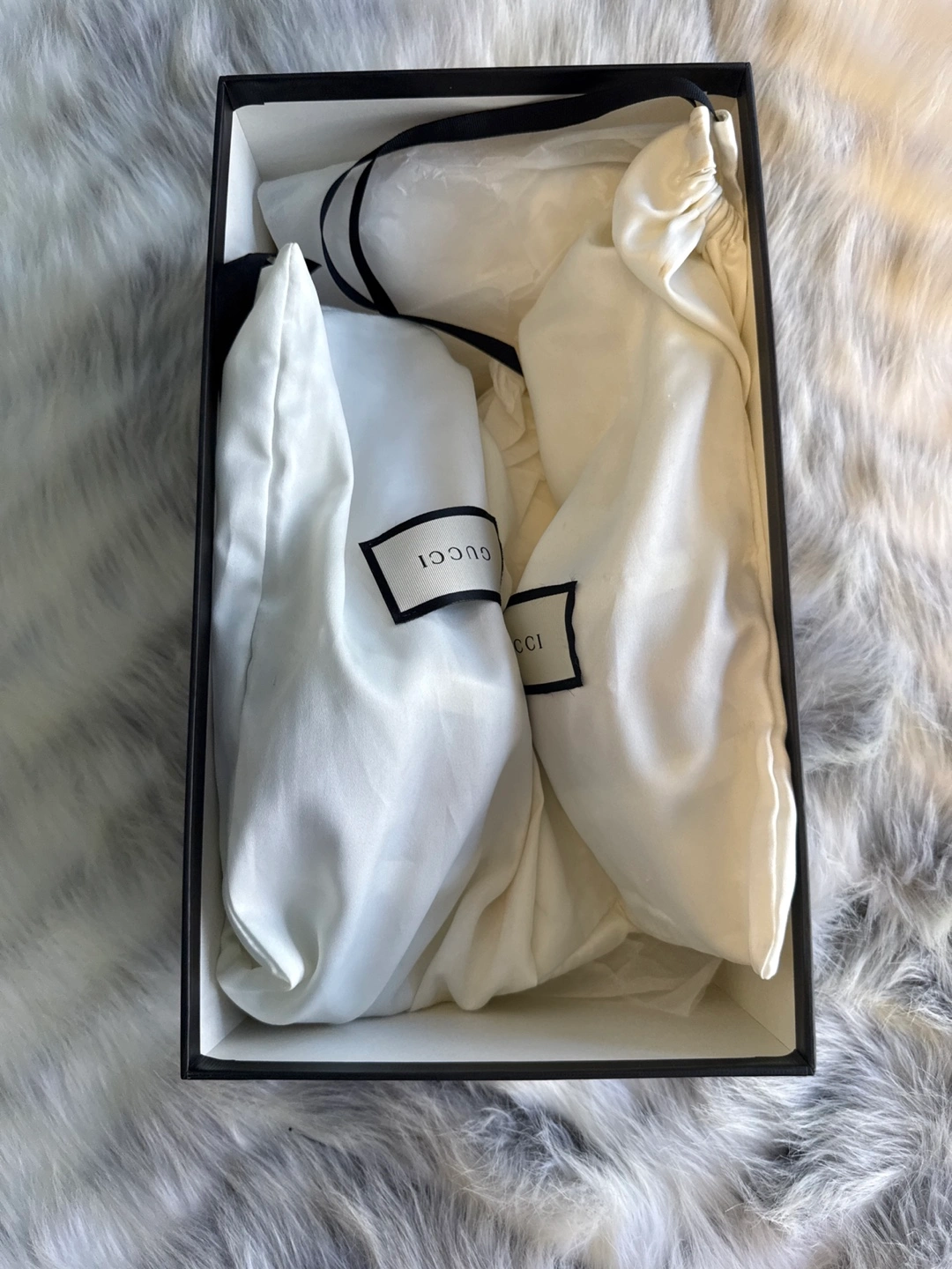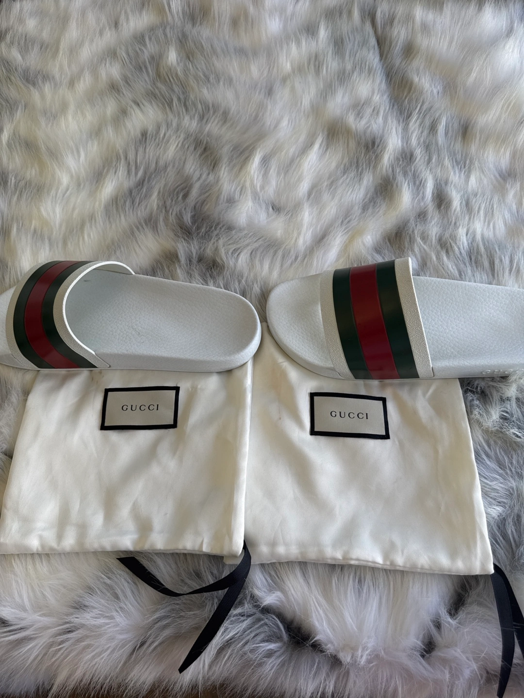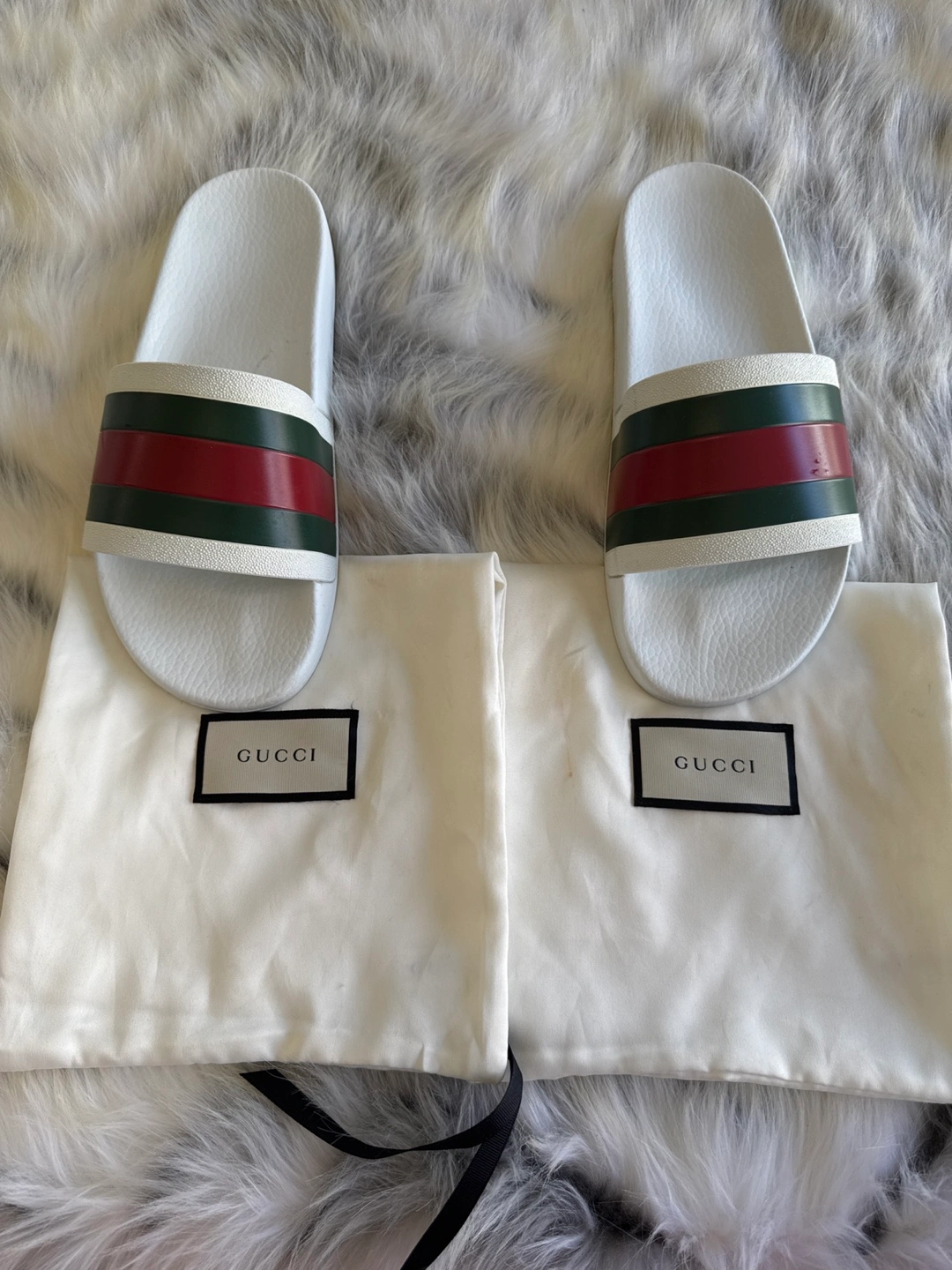 A pair of white slides. Features the signature Gucci stripes. Includes the shoe box and dust bags. These would be perfect for an afternoon relaxing at home.