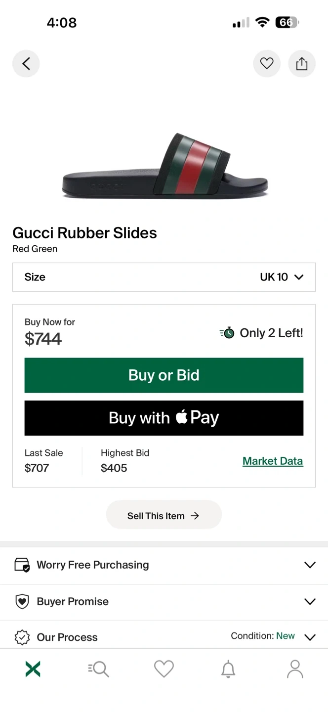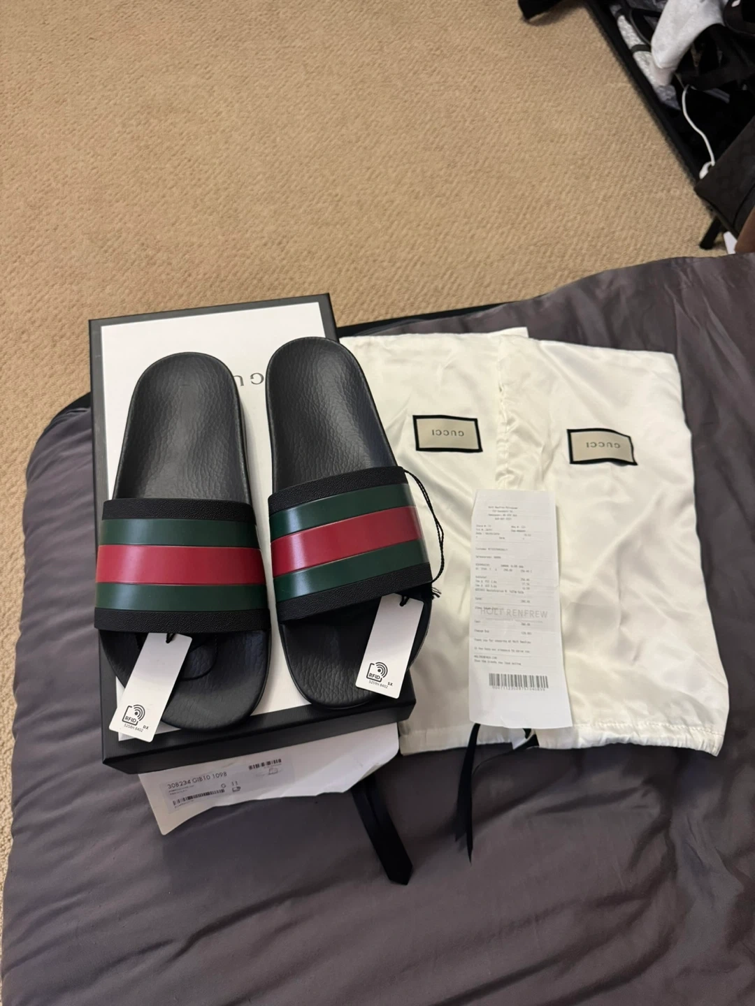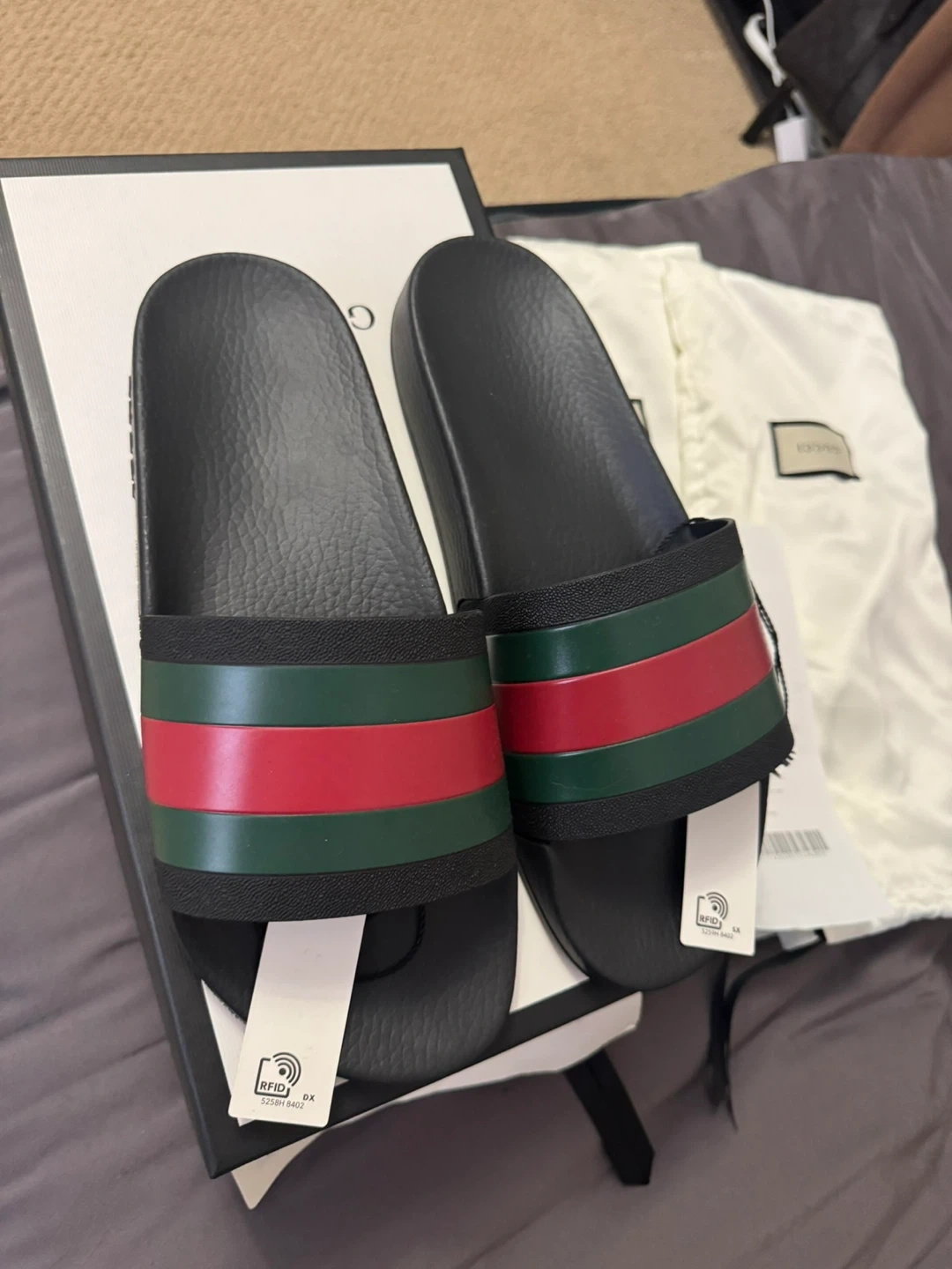 65Selling a pair of Gucci slides in size 11. These are brand new and come with the original box and dust bag. These are discontinued by Gucci which is why they go for over retail. Stock X price posted.