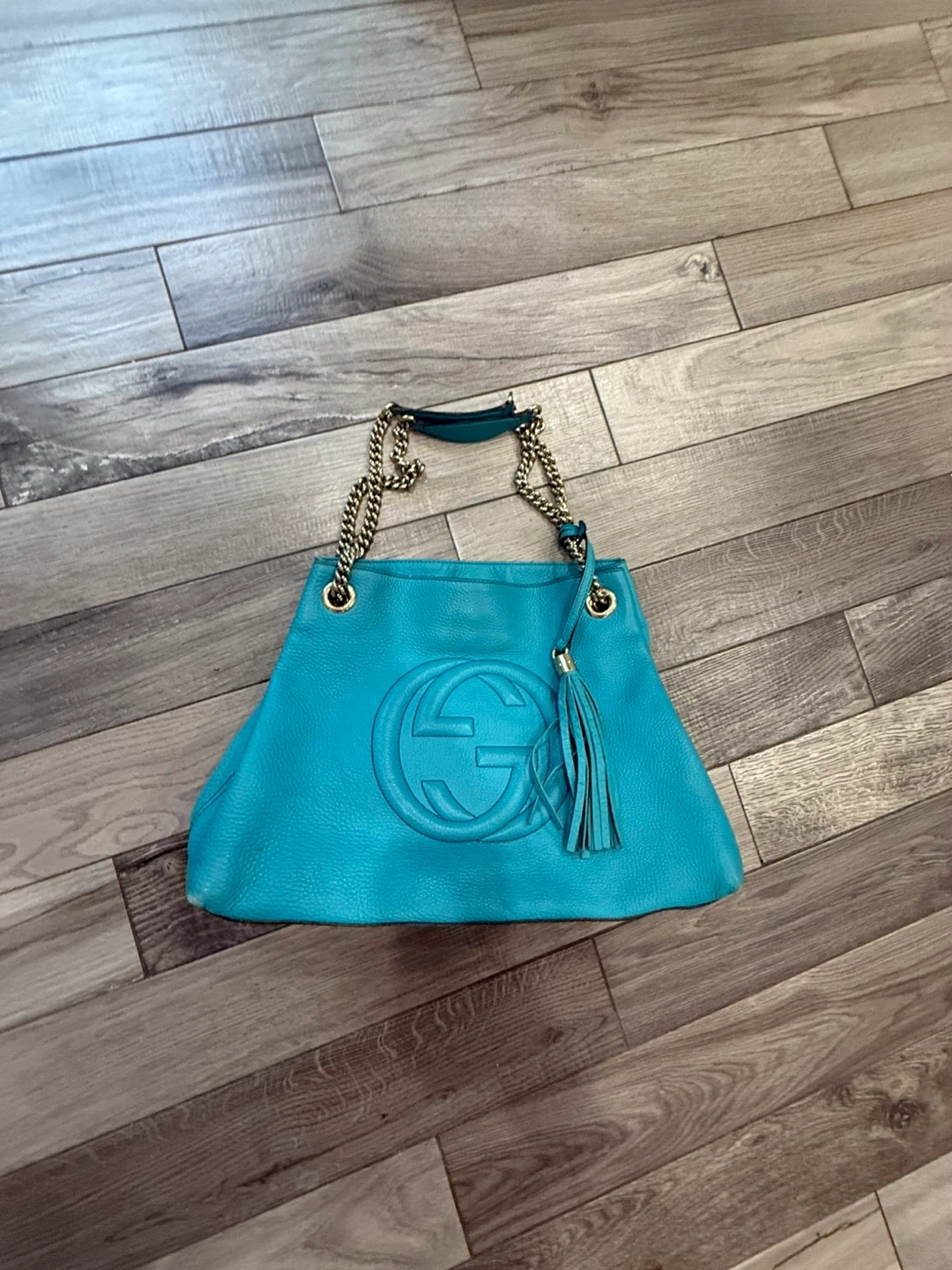 Selling a Gucci Soho Disco bag in a beautiful turquoise colour! It's in great condition and features the iconic embossed Gucci logo. The bag has a chain strap and tassel detail, making it a stylish and practical accessory. Perfect for adding a pop of colour to any outfit! The bag is in good condition.