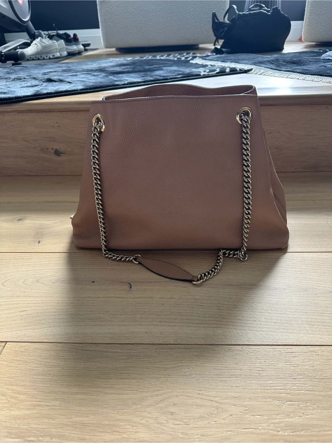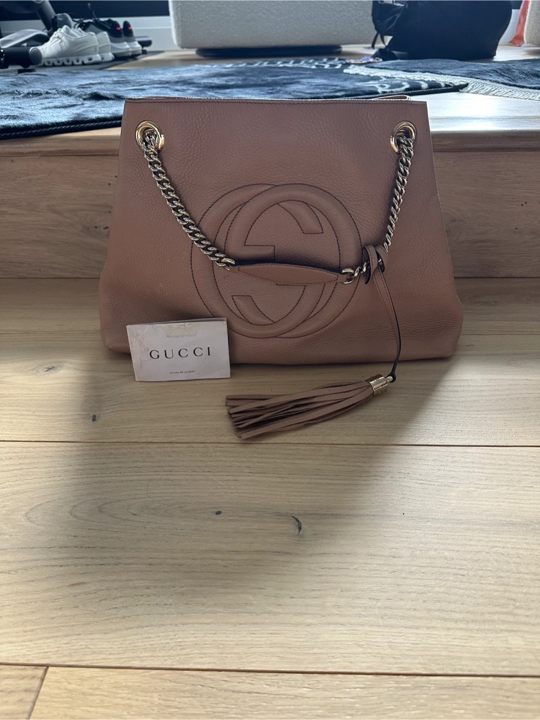 Selling a Gucci Soho bag in a lovely tan leather. It features a chain strap and the iconic Gucci logo embossed on the front. Perfect for adding a touch of luxury to any outfit!