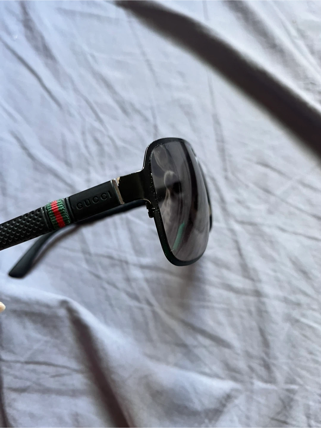 Selling a pair of Gucci sunglasses. They have a black frame with the classic Gucci stripe detail on the side. Great for adding a touch of style to any outfit!