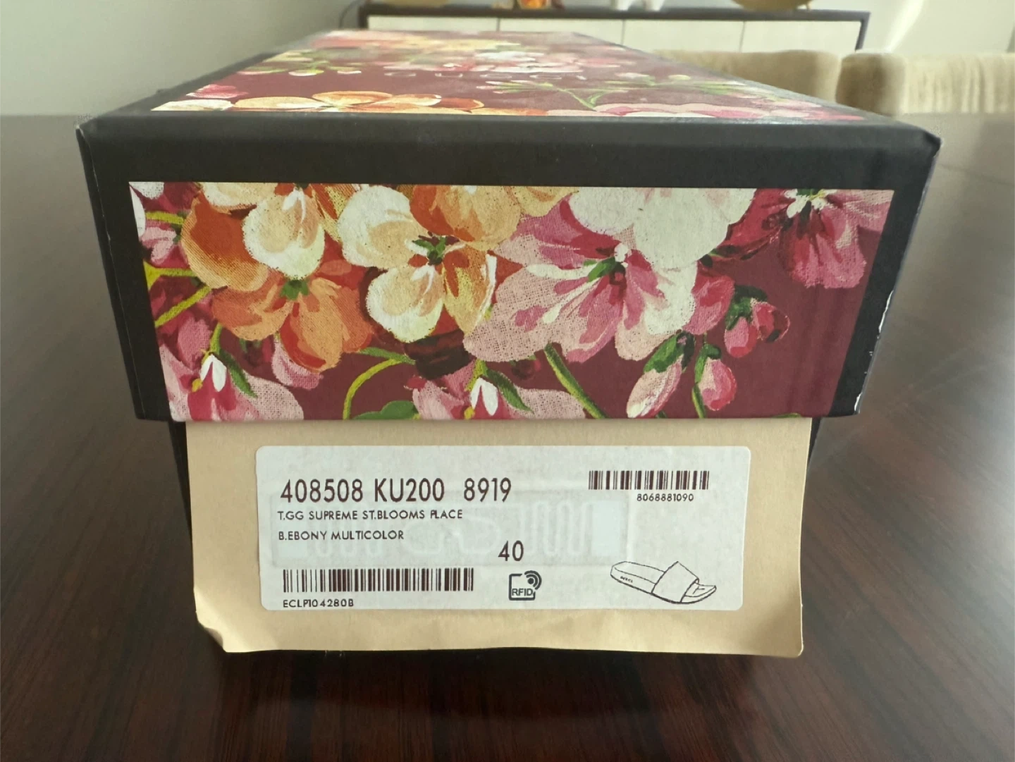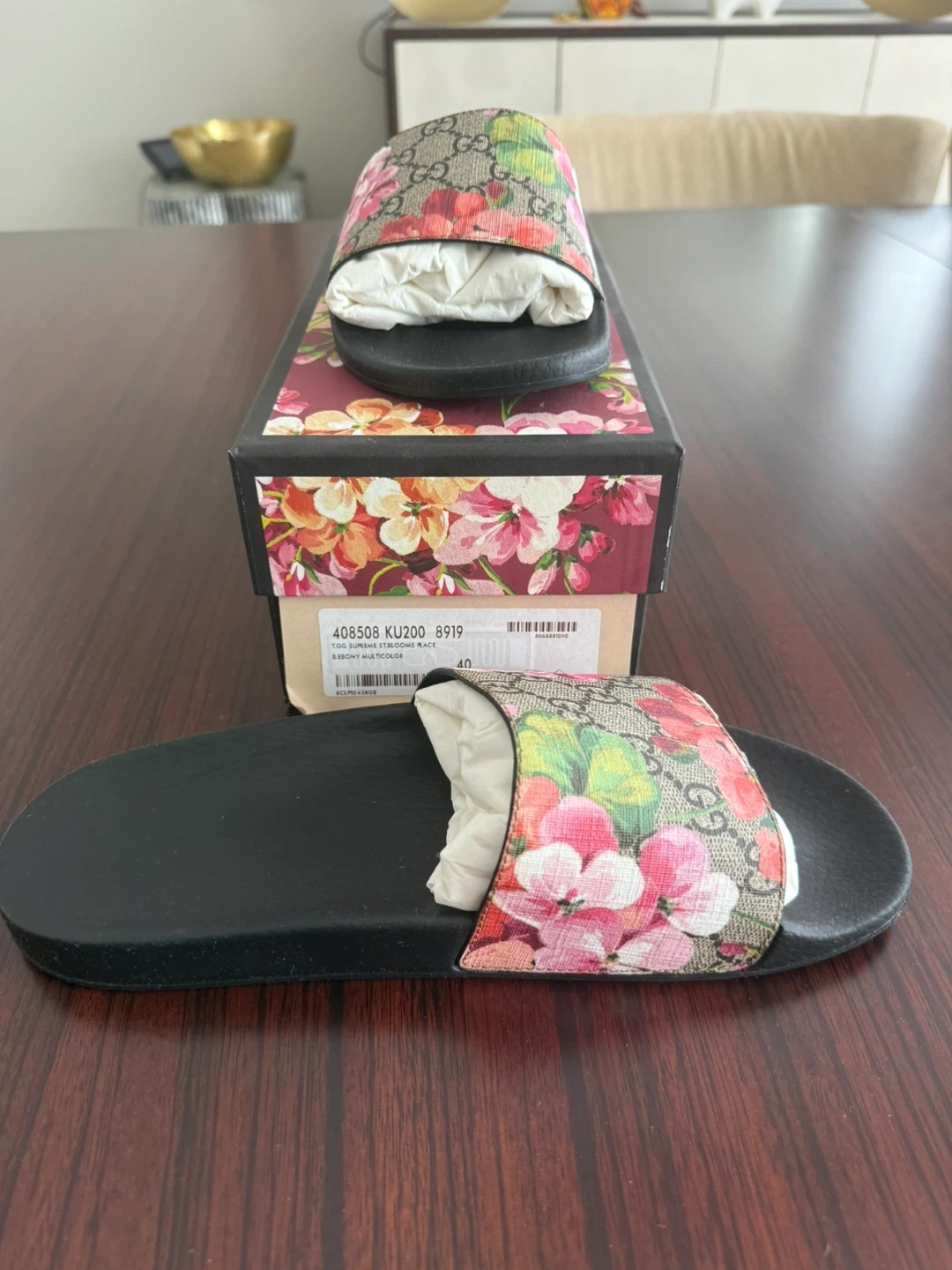 Selling a pair of Gucci T.GG Supreme St. Blooms Place slides. They are a size 40 and come with the original box. The slides feature a beautiful floral design on the classic Gucci monogram.