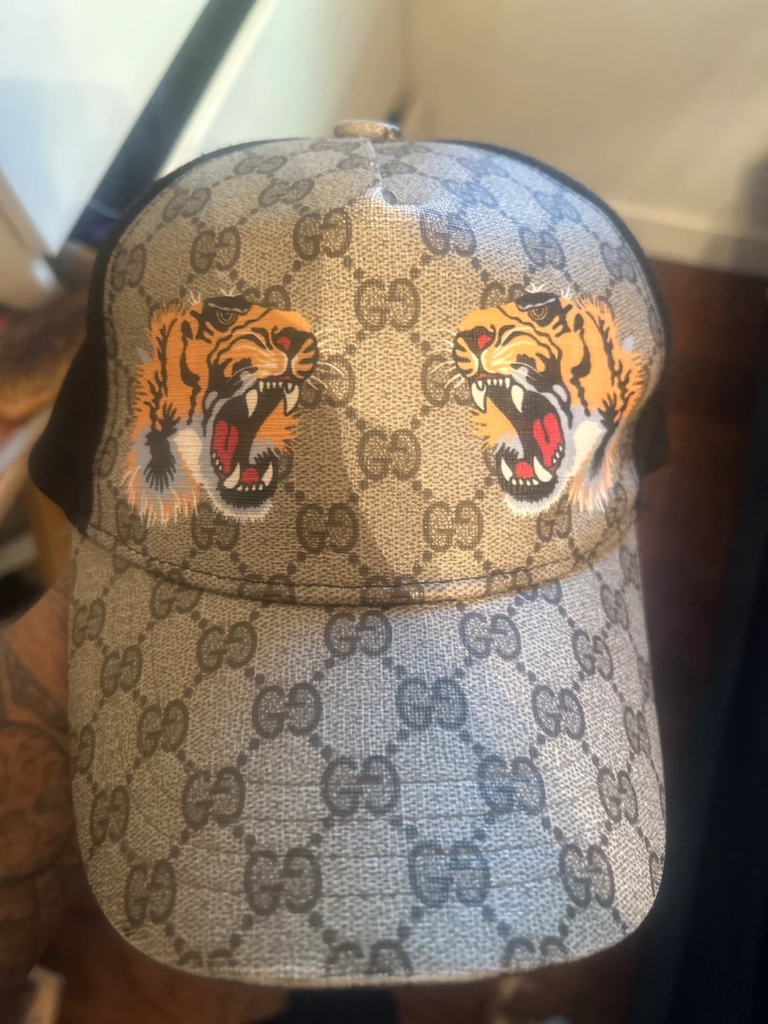 Selling a Gucci baseball cap with a tiger print. The cap features the iconic Gucci logo pattern and a striking tiger design on the front. Made in Italy with high-quality materials, it's a stylish accessory to elevate your look. The cap is in great condition and ready for a new home!