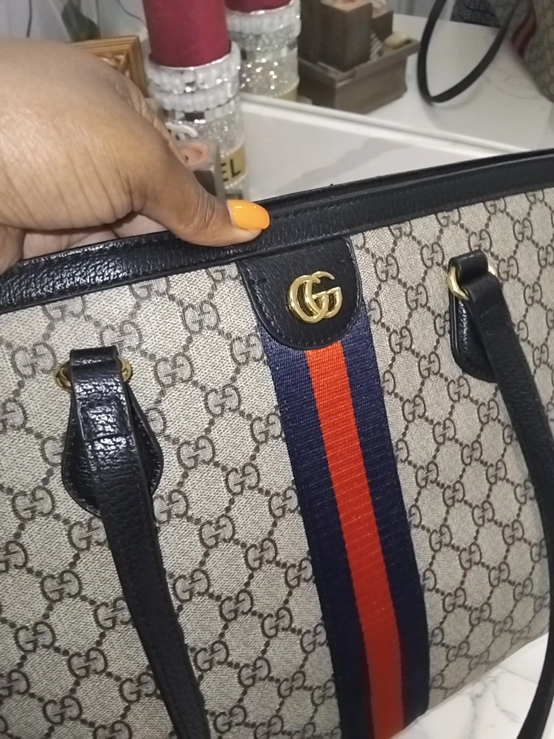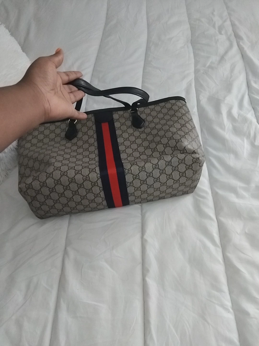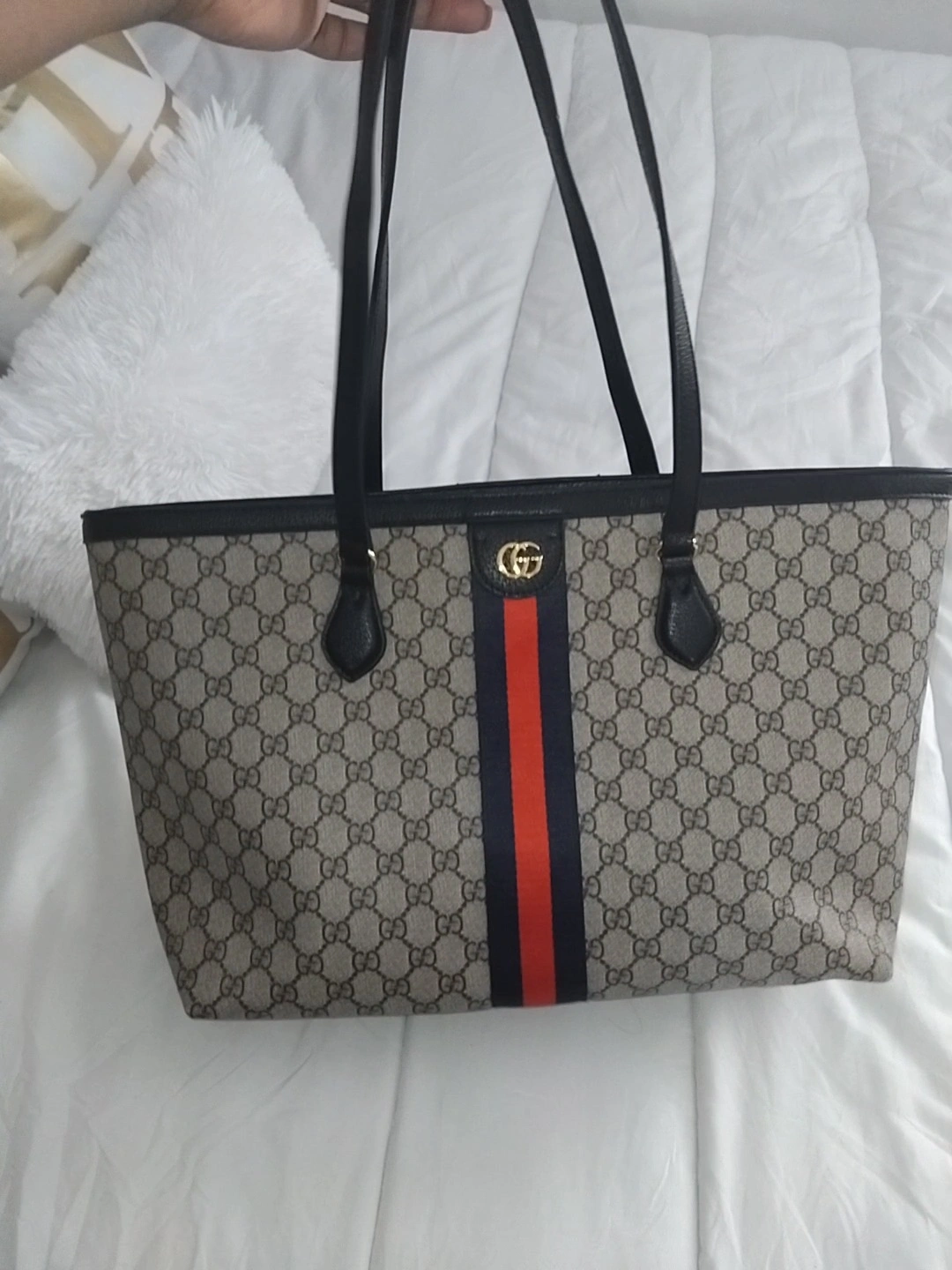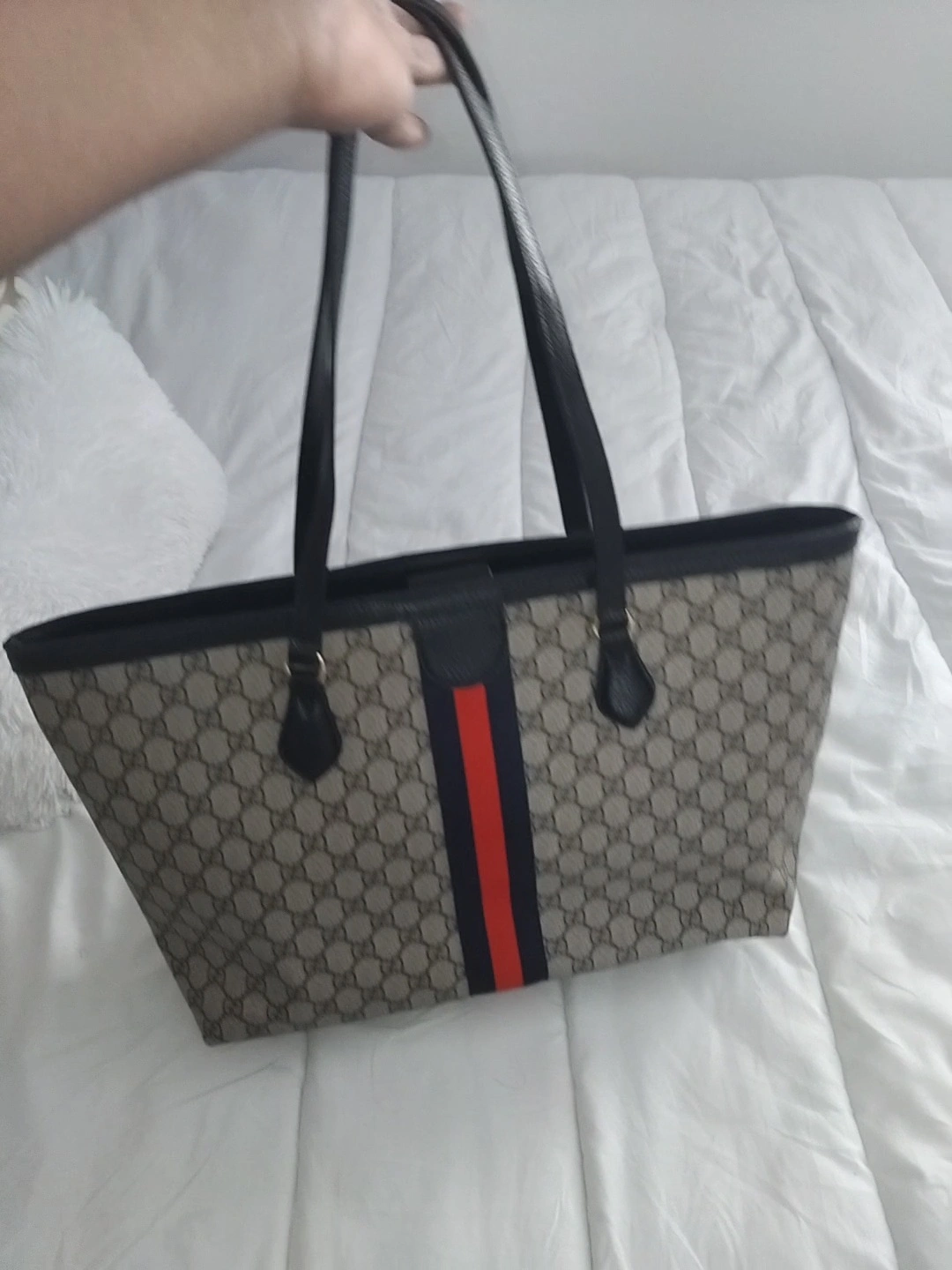 Selling a Gucci tote bag. It features the classic Gucci pattern with a red and navy stripe detail. The interior is lined and includes a zipper pocket. Great for everyday use!