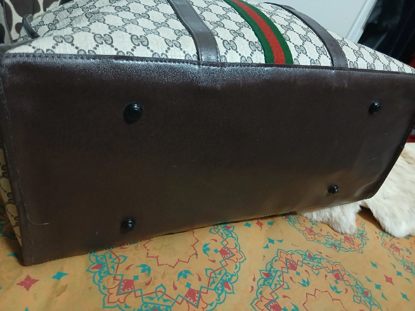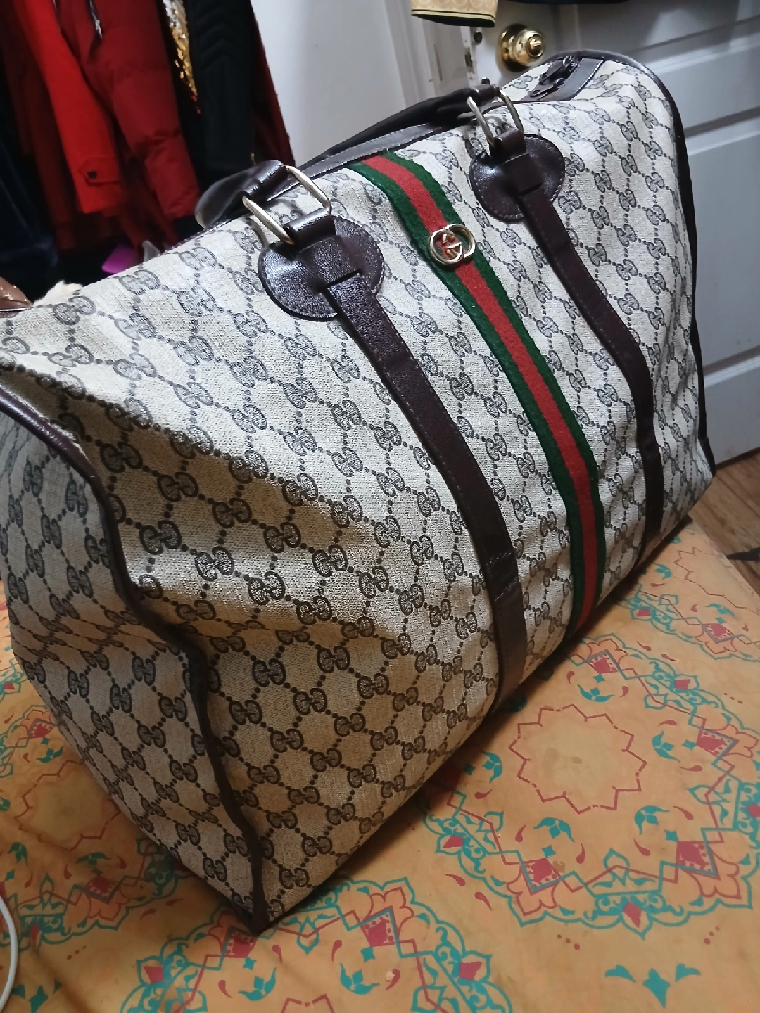 Selling a Gucci vintage duffle bag. It features the classic Gucci monogram pattern in beige and brown, with the iconic green and red stripe detailing. The bag has leather handles and trim, and a gold-tone GG logo. A stylish and timeless piece!